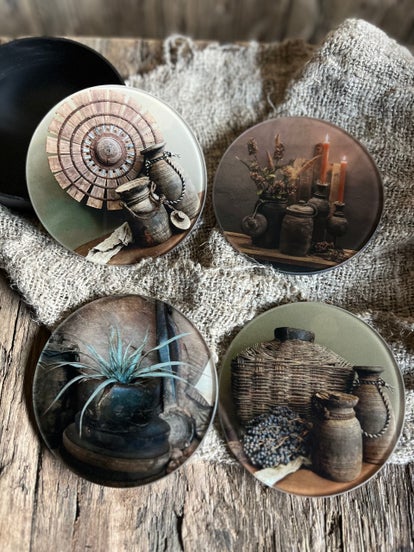 Set van vier glazen viltjes in een rond bakje