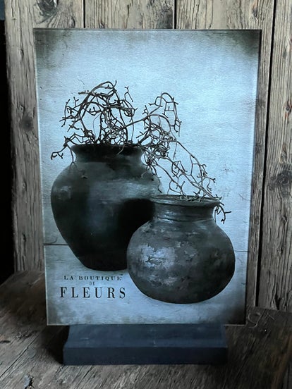 De plaat wordt geleverd met een houten standaard — geen strakke afwerking, maar juist dat beetje stoere en landelijke charme dat hem zo leuk maakt!