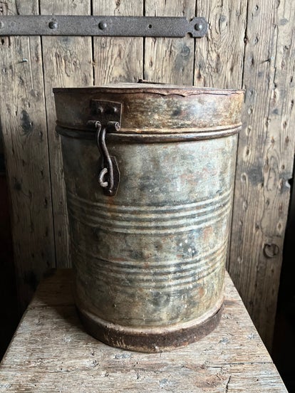 Roestige metalen pot met handvat