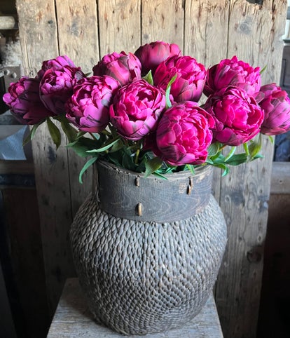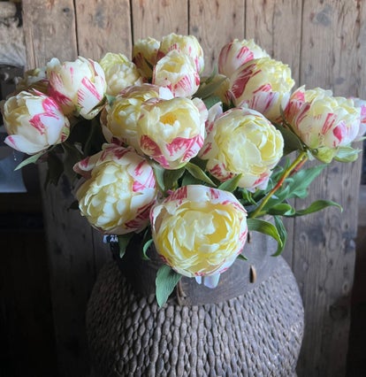 Verkrijgbaar in twee lengtes, die ook prachtig met elkaar te combineren zijn. De steel is eenvoudig in te korten, waardoor er vanzelf een speelse mix ontstaat van pioenrozen met bloemen in verschillende groottes.