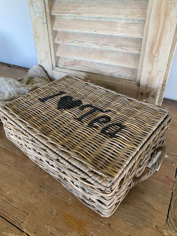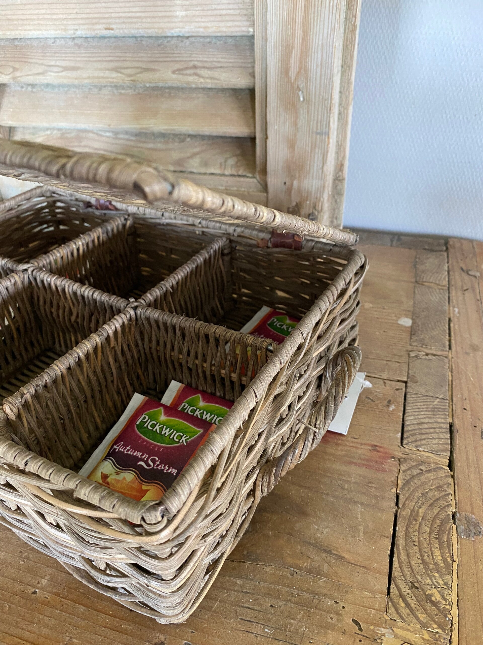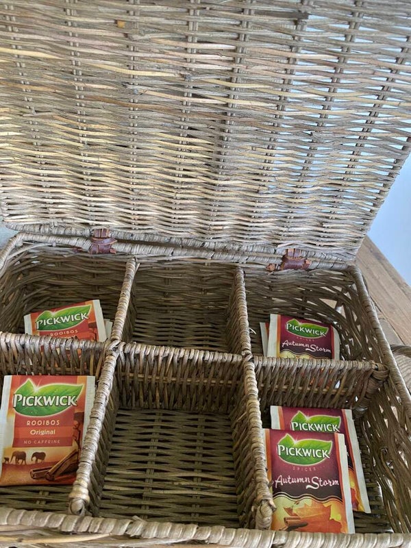Deze prachtige vierkante thee rotan grijze doos met zes compartimenten en een deksel.