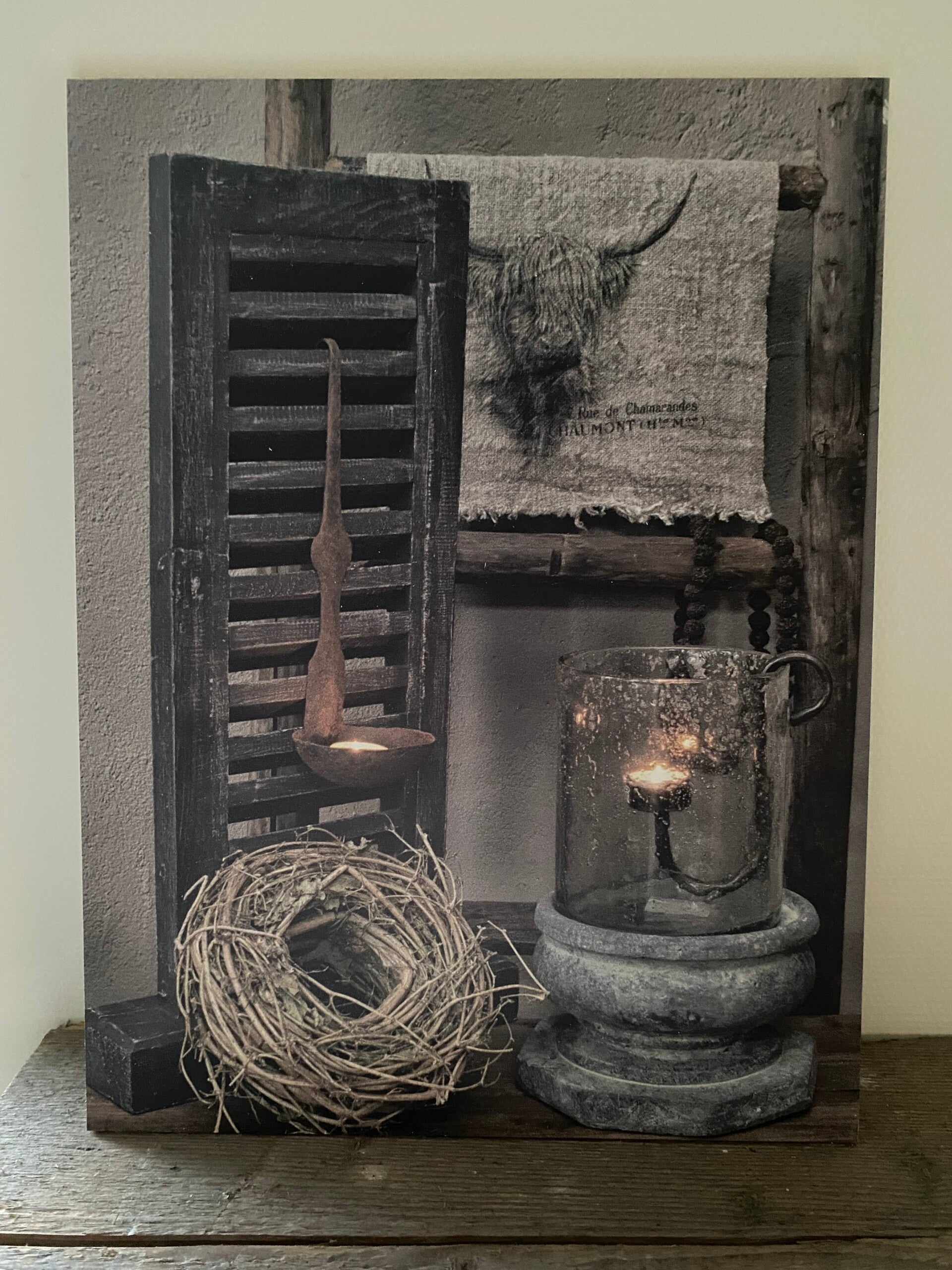 Houten paneel, ruwe afwerking geeft de print een stoer en sobere uitstraling