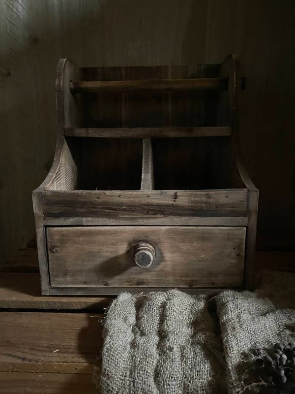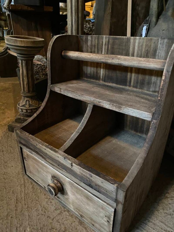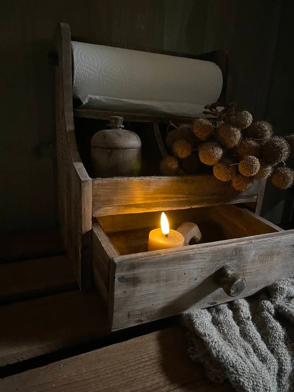 Compacte keukenrolhouder met twee vakjes en een laadje.