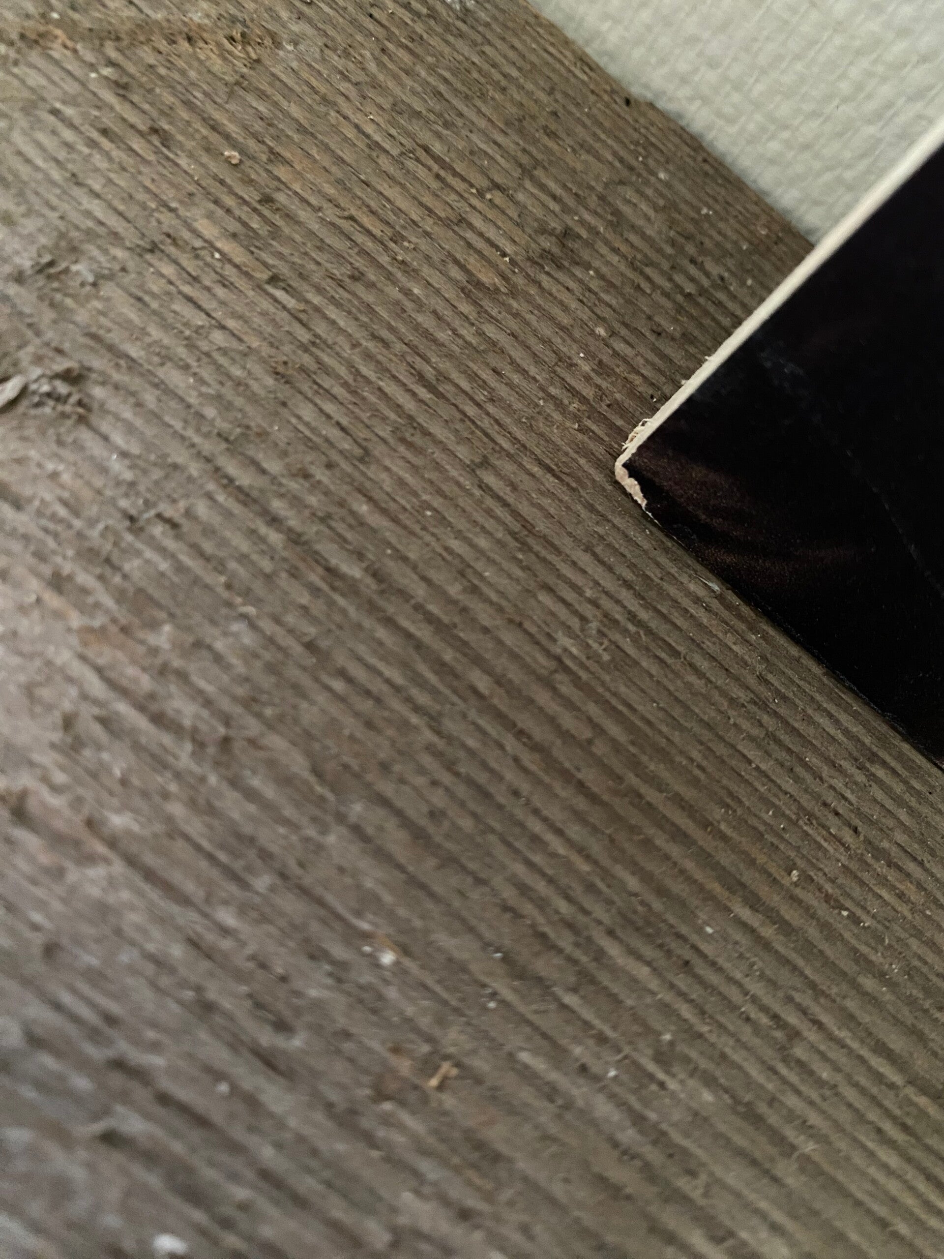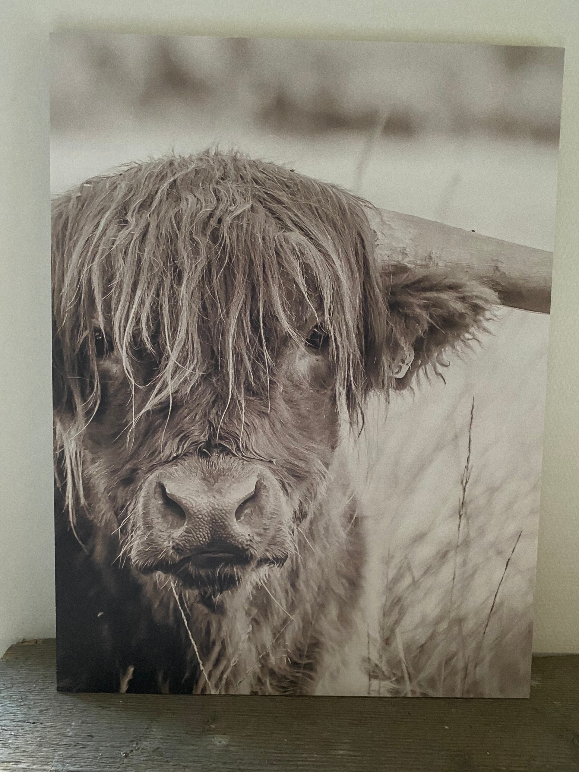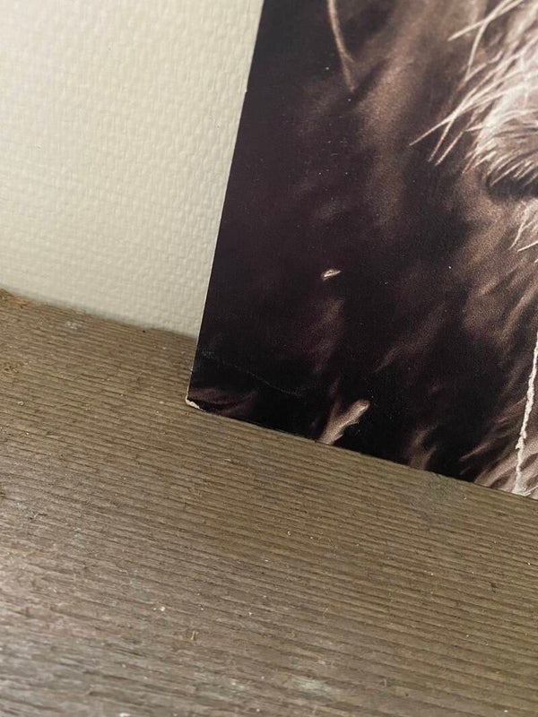 Houten paneel, ruwe afwerking geeft de print een stoer en sobere uitstraling