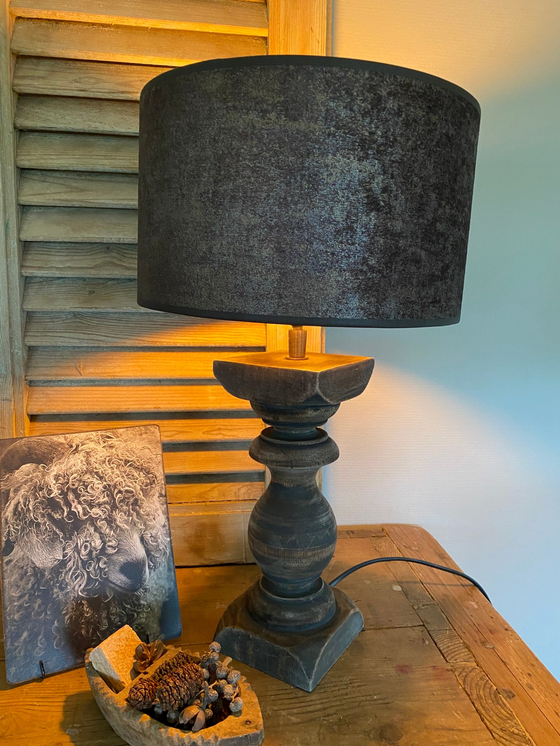 Kleine houten baluster lamp met grijze/bruin gemêleerde kap