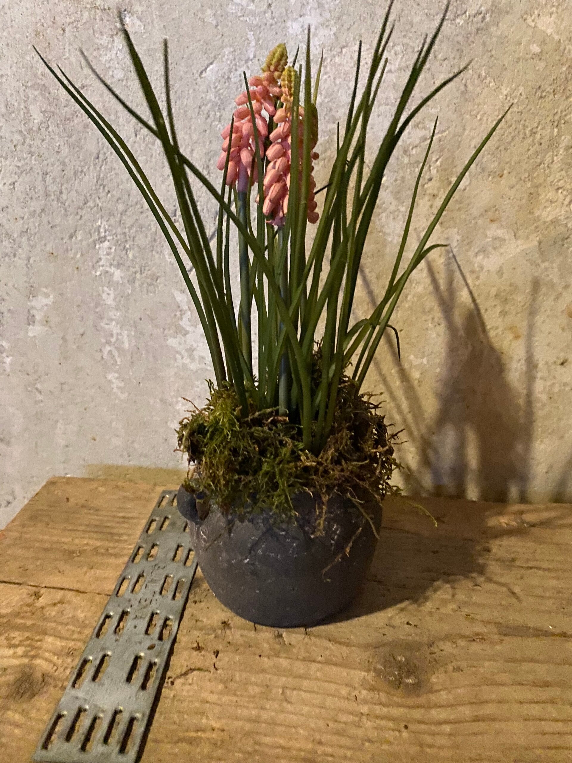 Compleet set, antraciet potje met oortjes en drie roze druifjes in een pot