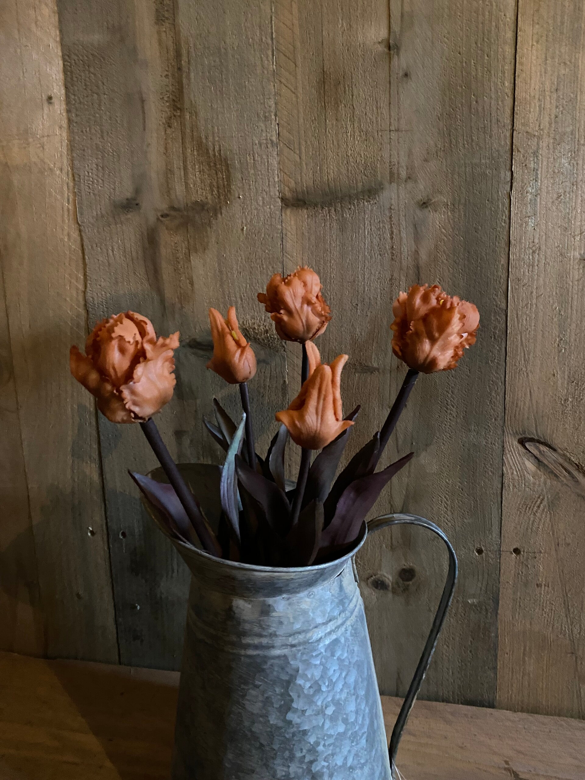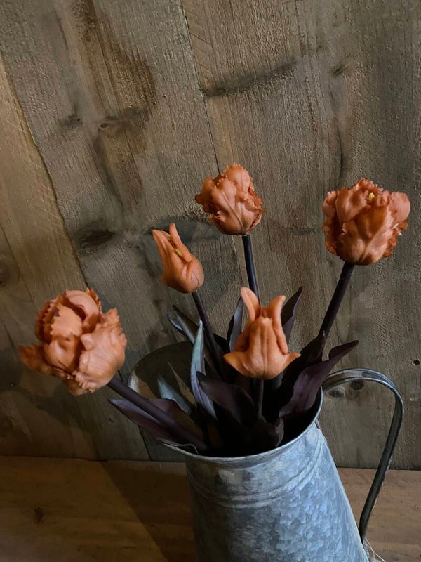 Oranje papegaaitulpen met sobere kleur blad en steel