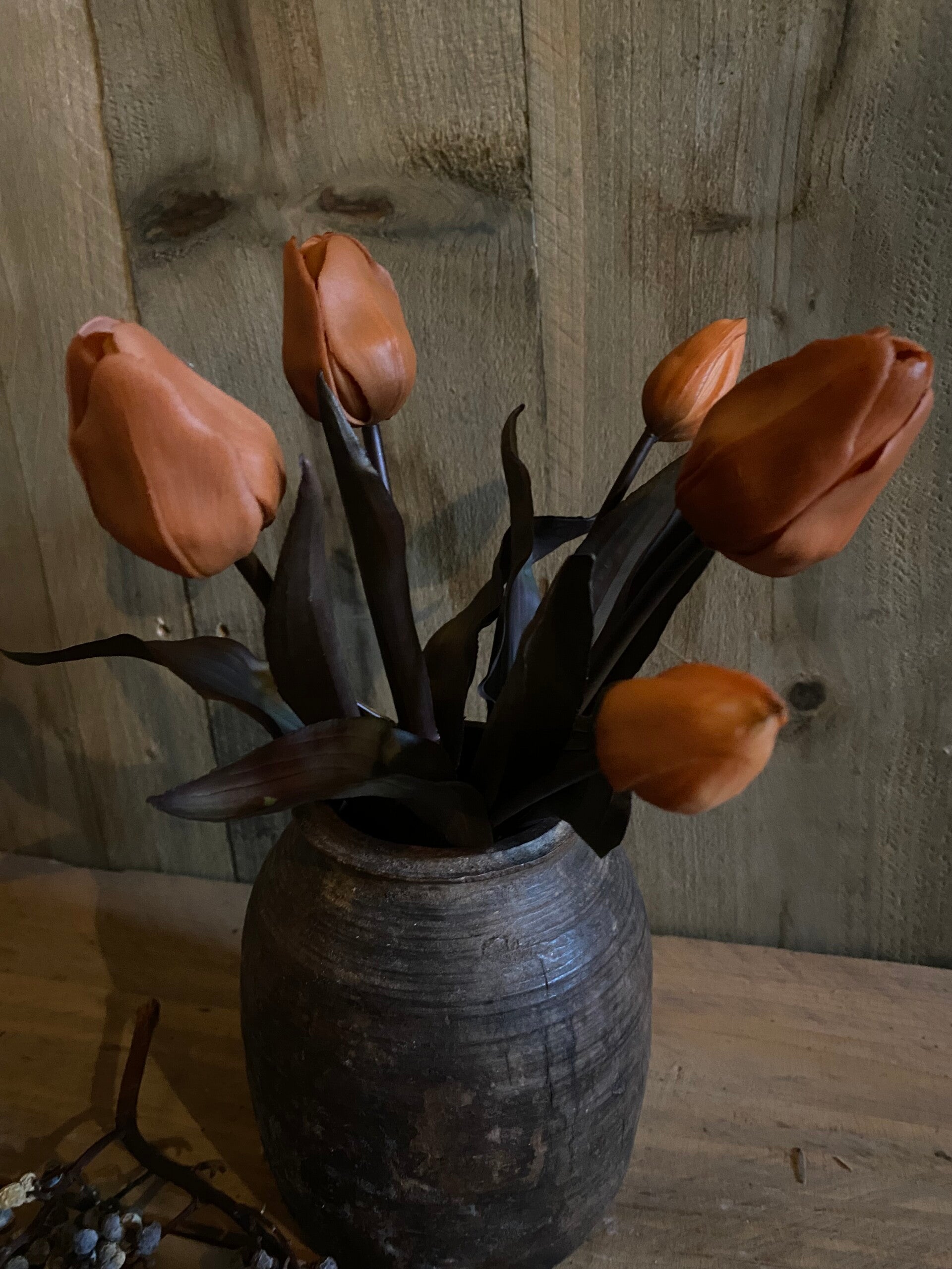 Oranje klein bosje tulpen met sobere kleur blad en steel