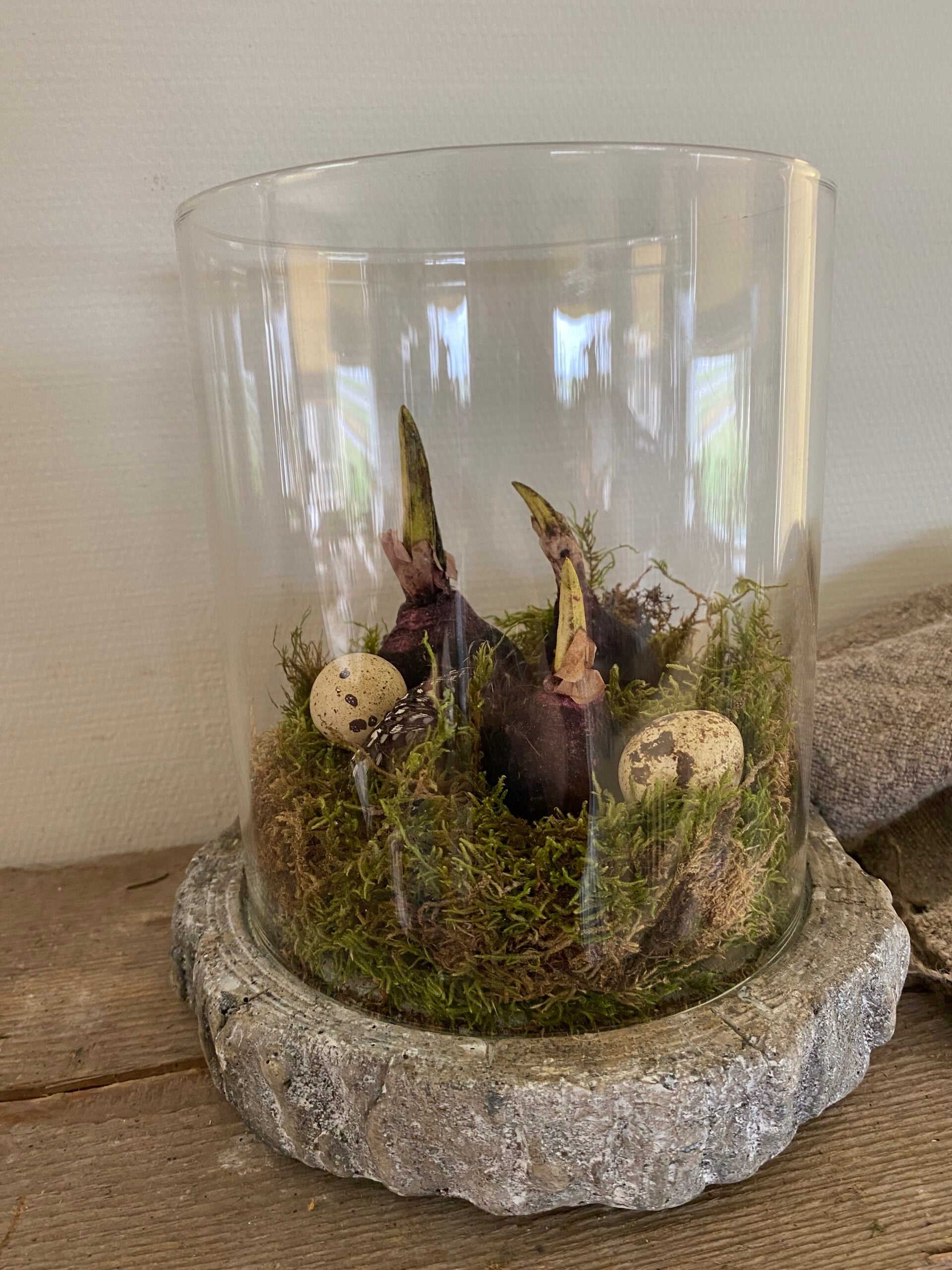 U kunt er een kaars of waxine in doen maar ook erg leuk met het voorjaar, wat mos, nep bloembolletjes en veertjes.