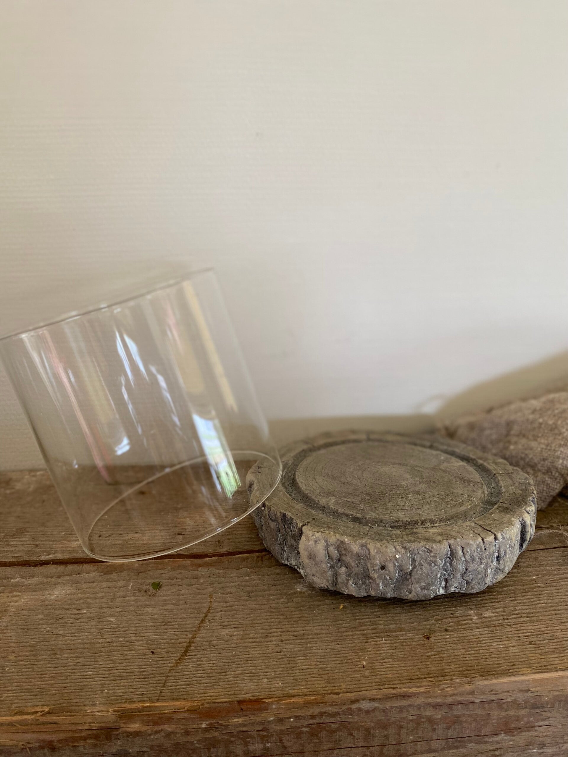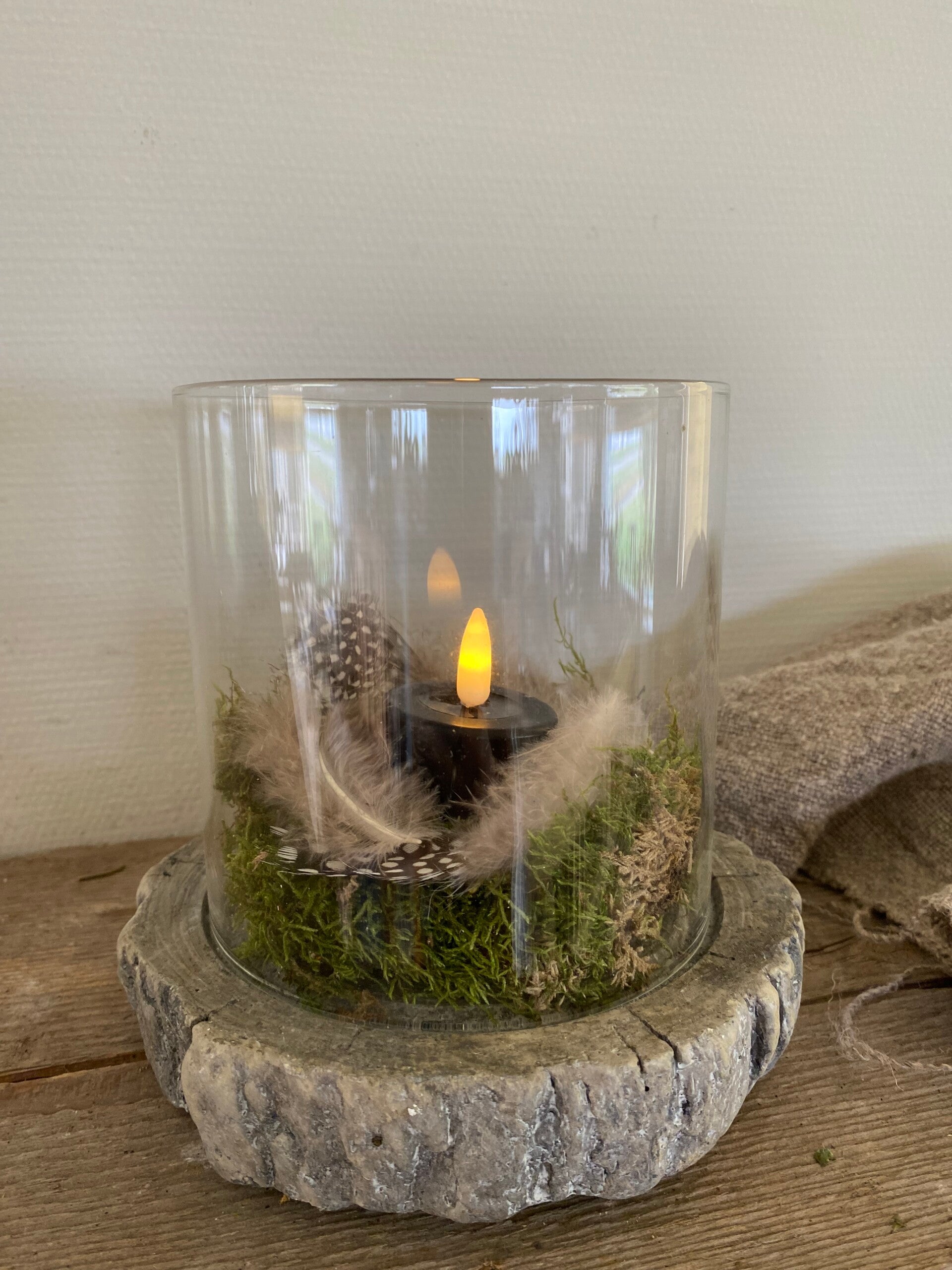 Klein windlicht op stenen grijze boomstam