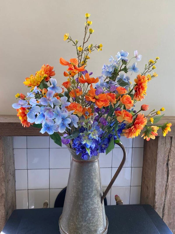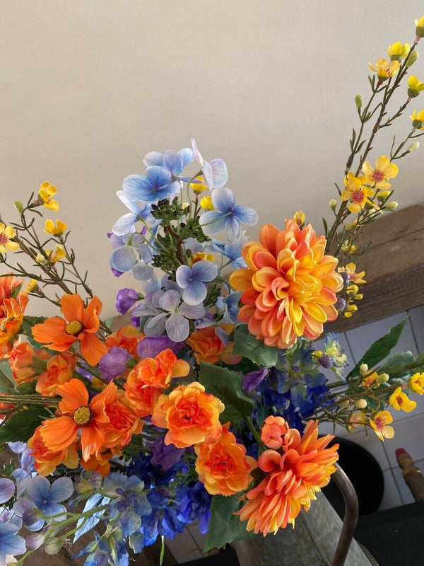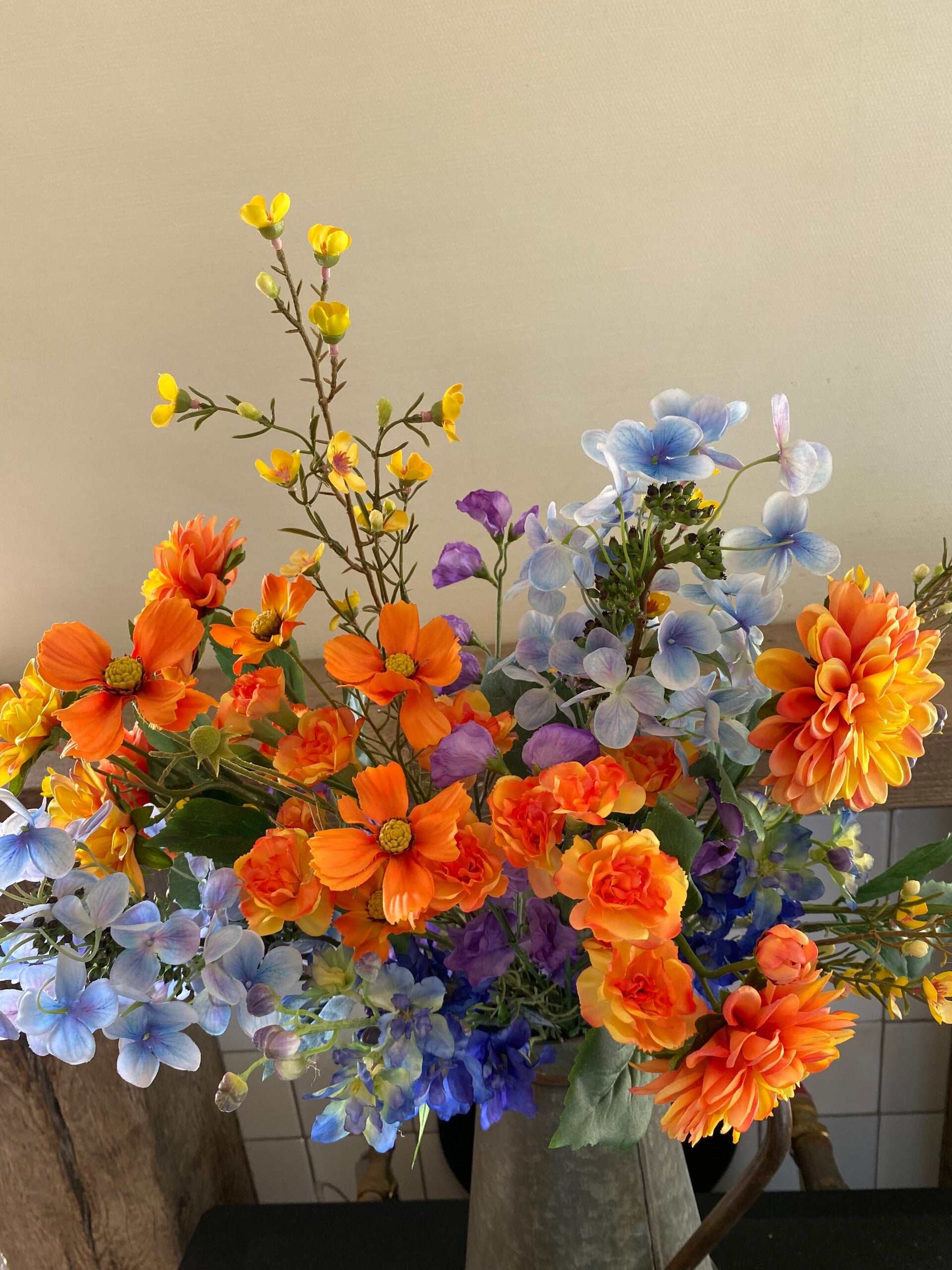 Cosmea met 5 bloemen (3x Ø 7 cm, 2x 5 cm), 3 knoppen & 7 bladtoeven, 72 cm