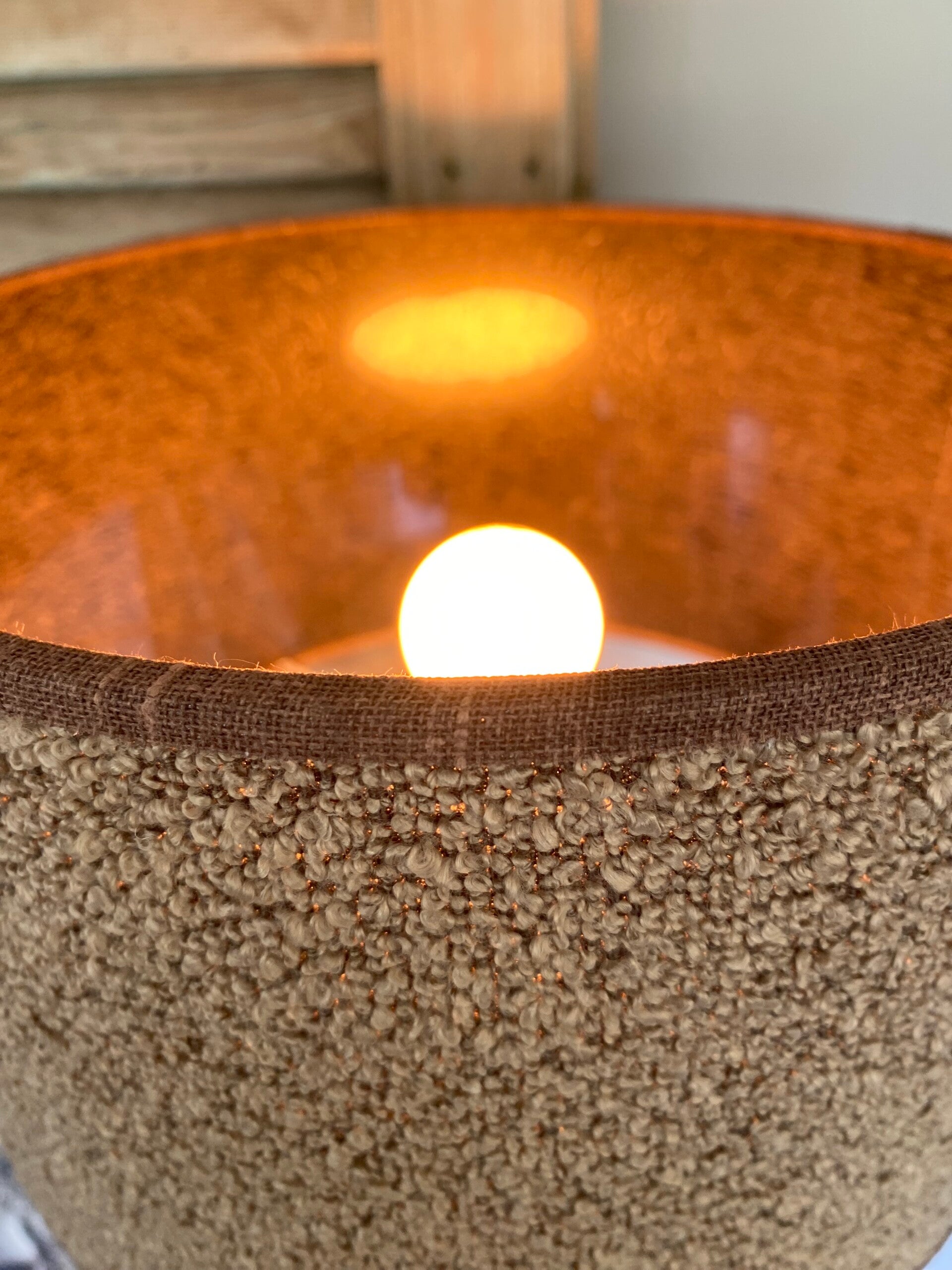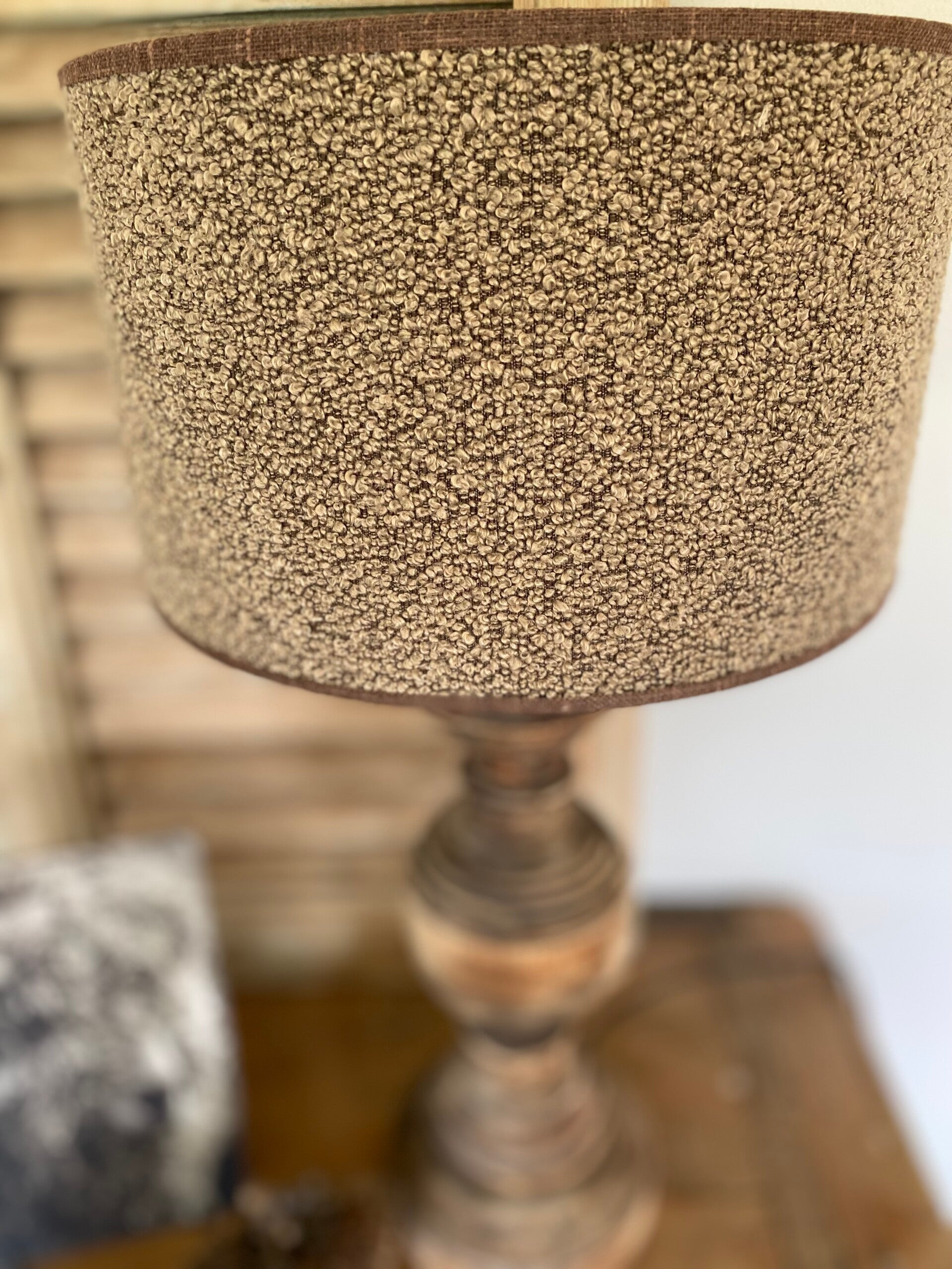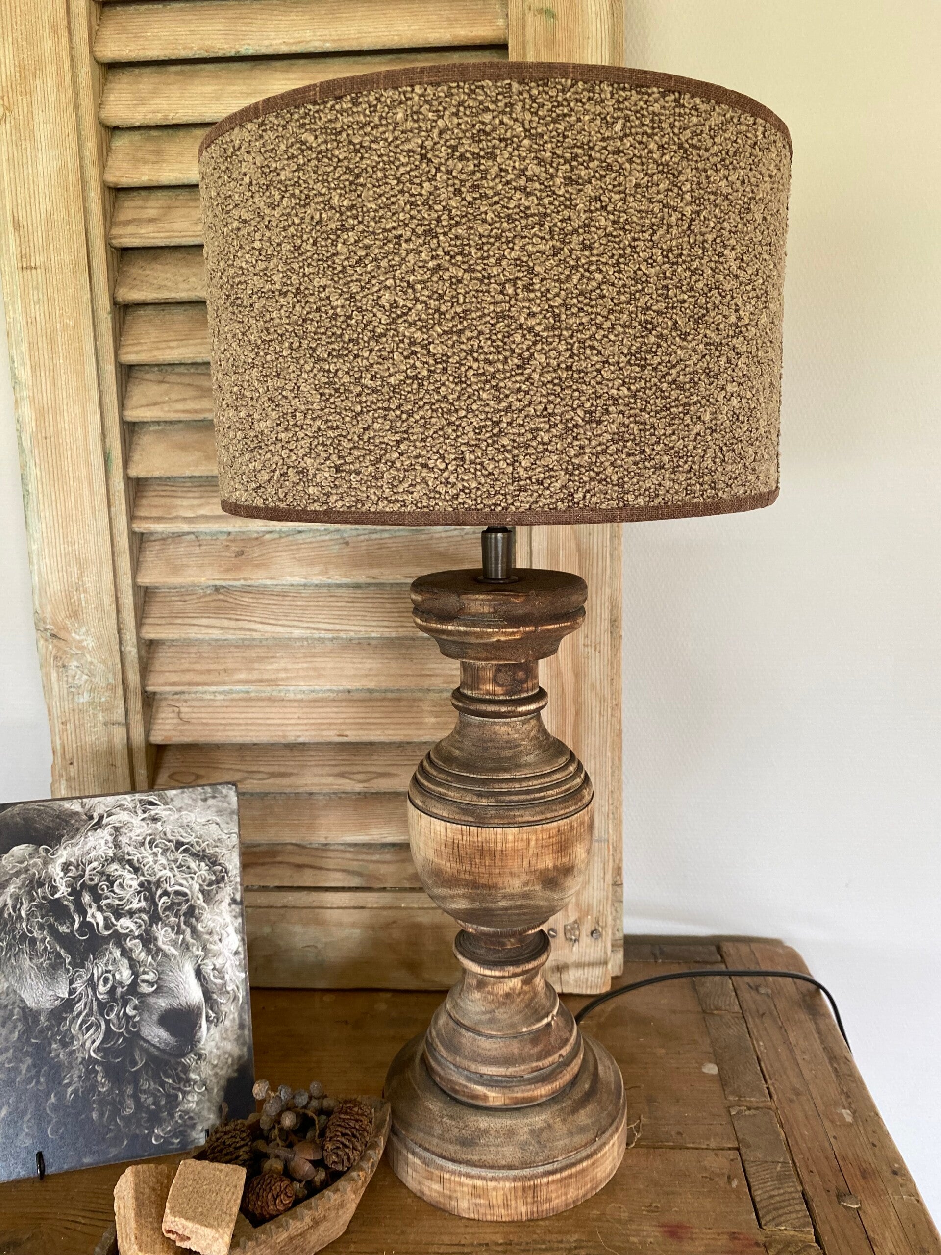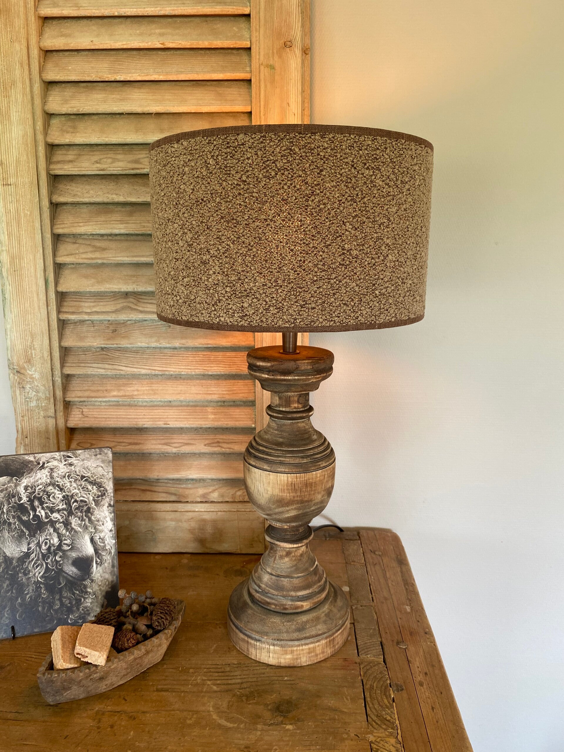 Bruine houten baluster lamp met een bruine/taupekleurige kap