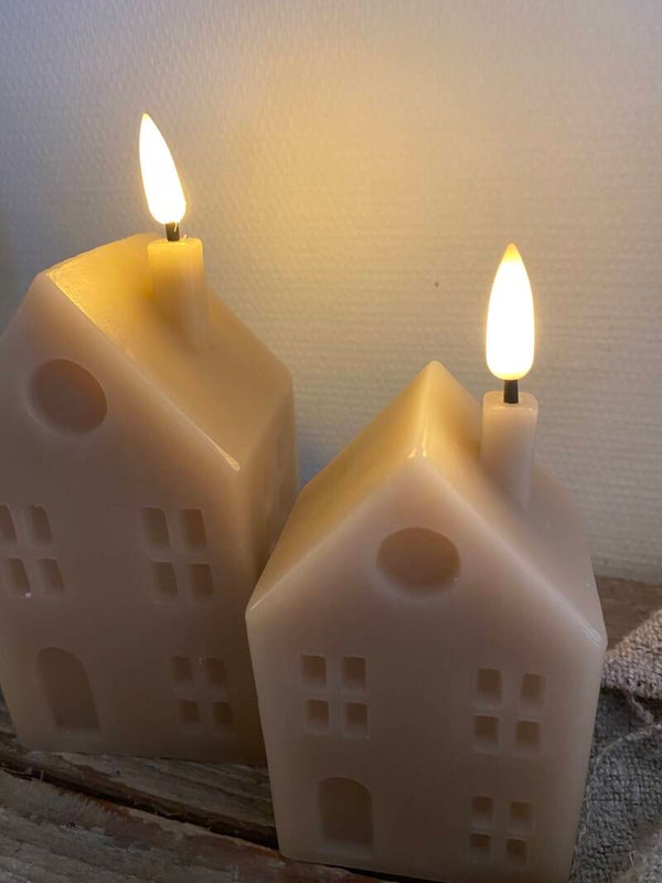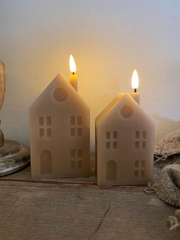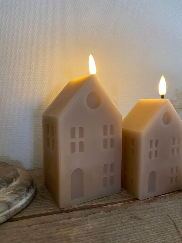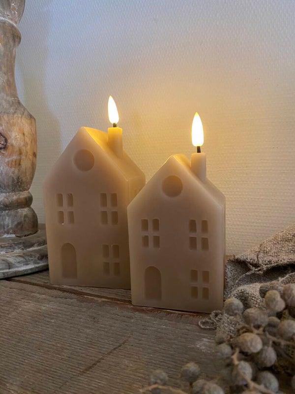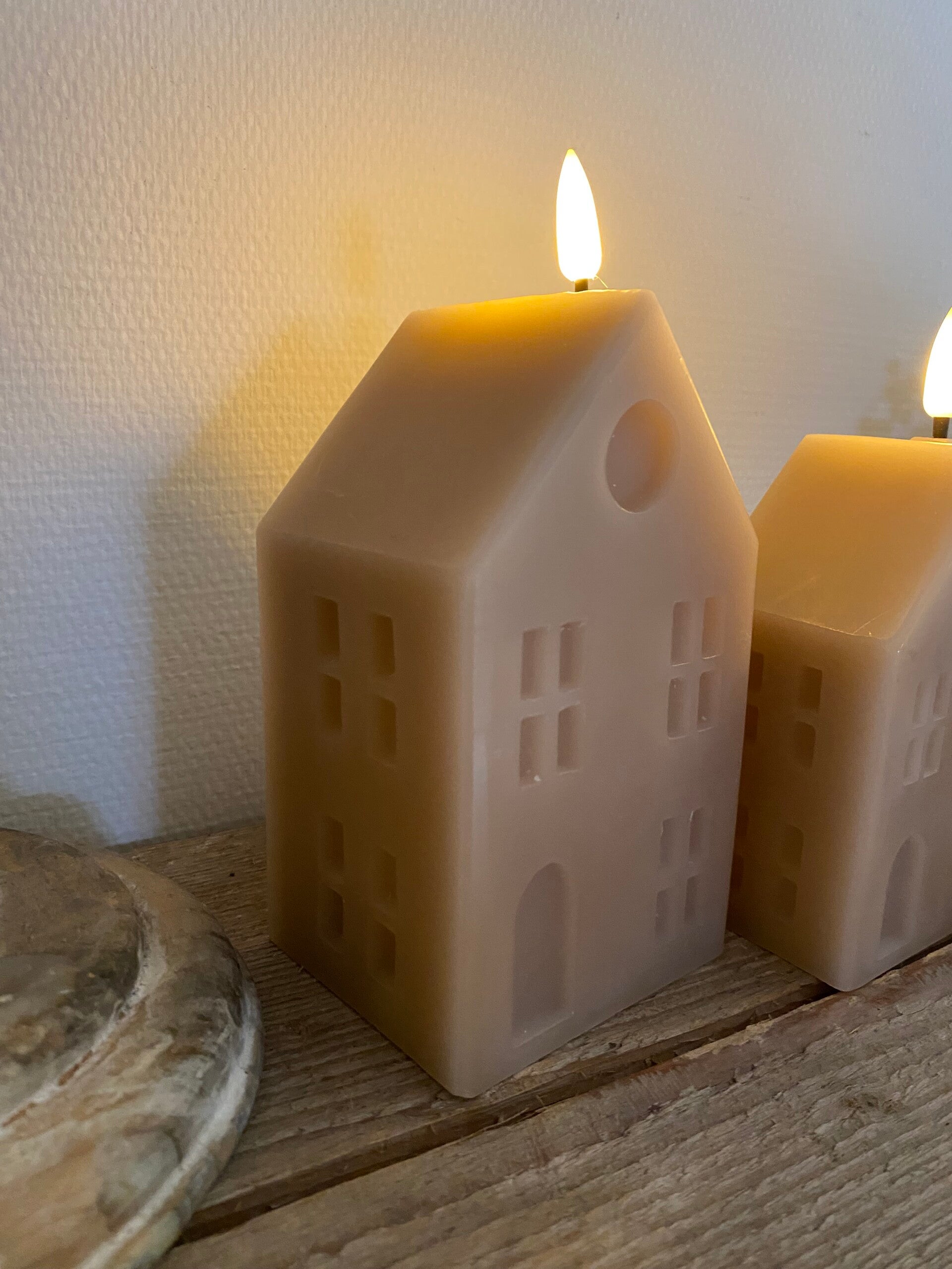Beige/taupe kleurige wax led kaars in de vorm van een huis