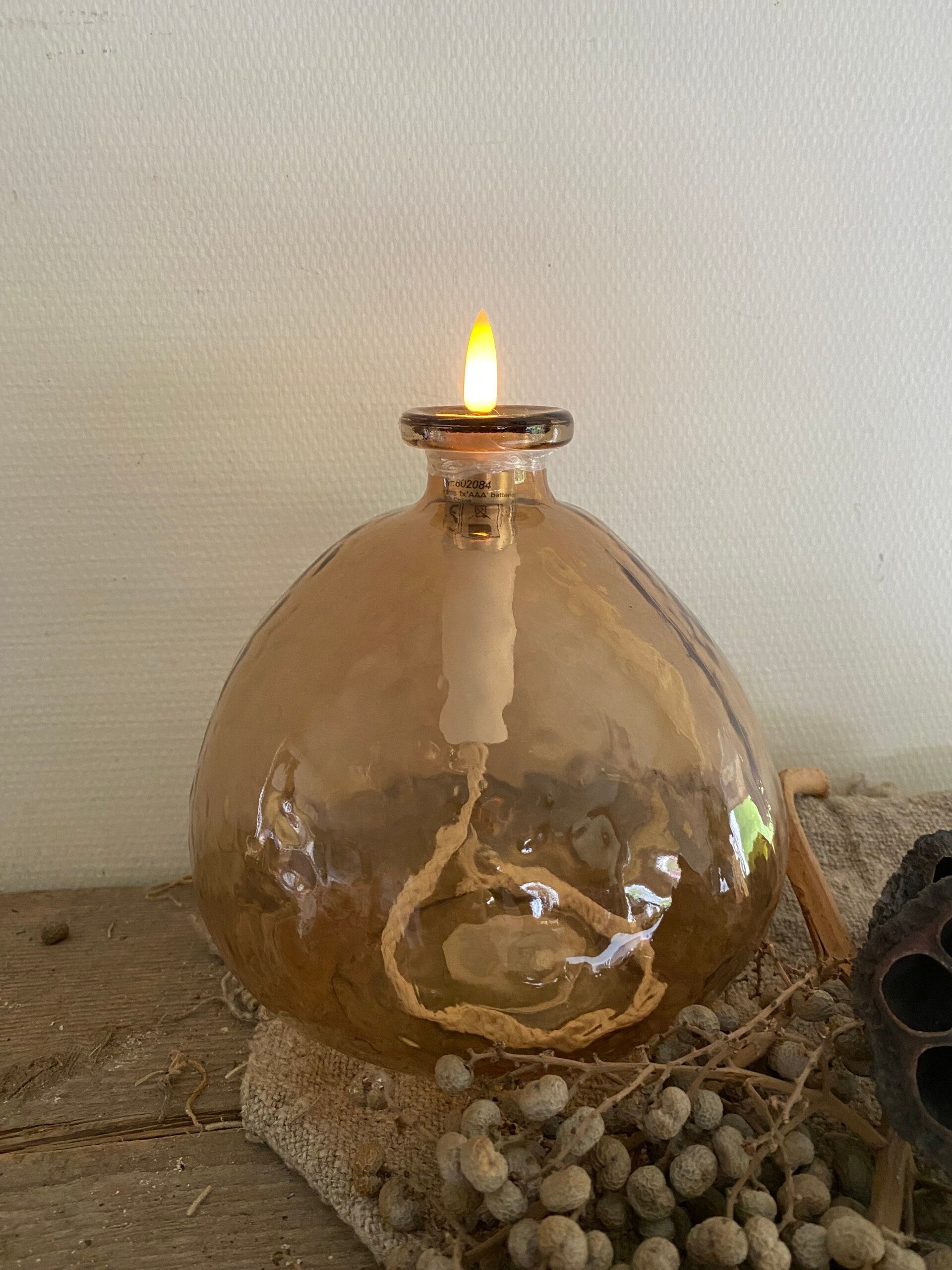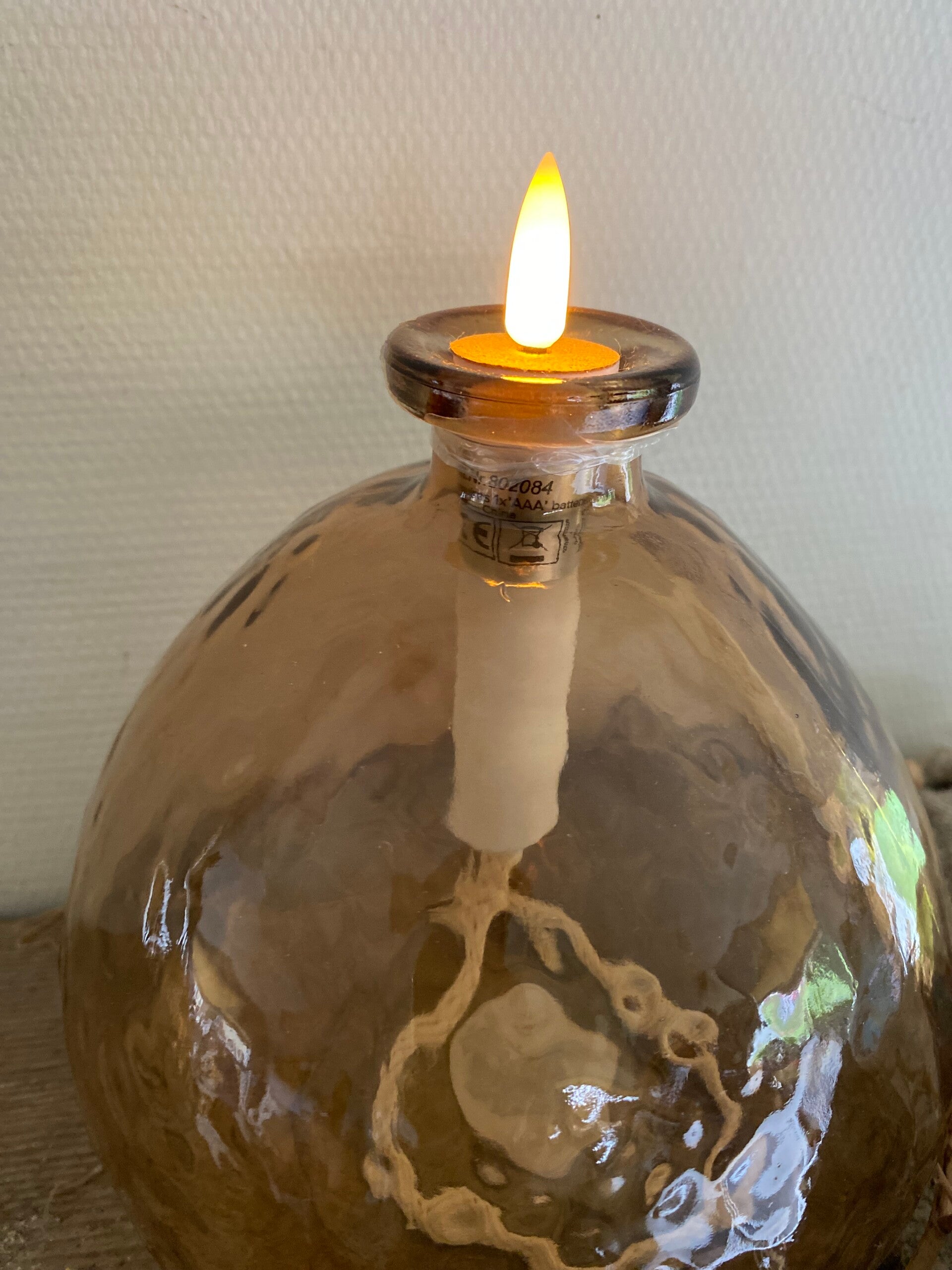 Deze olielampje werkt op 1 AAA batterij en gaat dus veel langer mee dan de olielampjes op knoopcelbatterijtjes