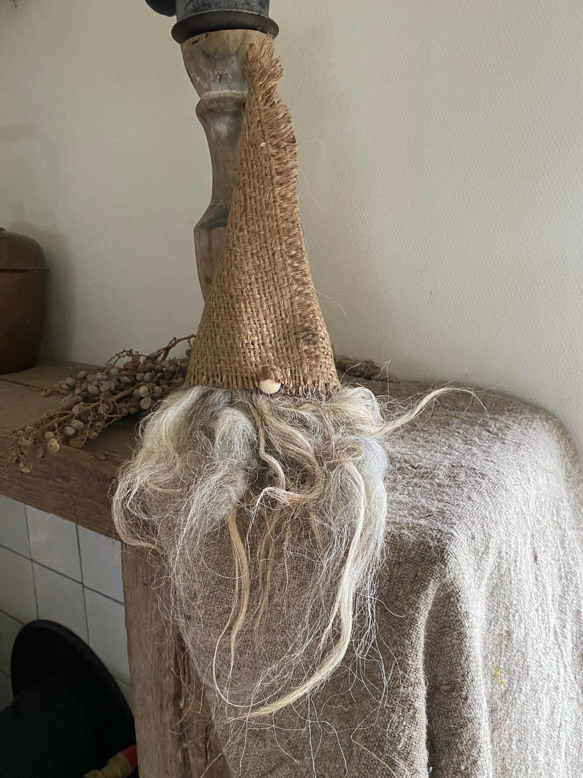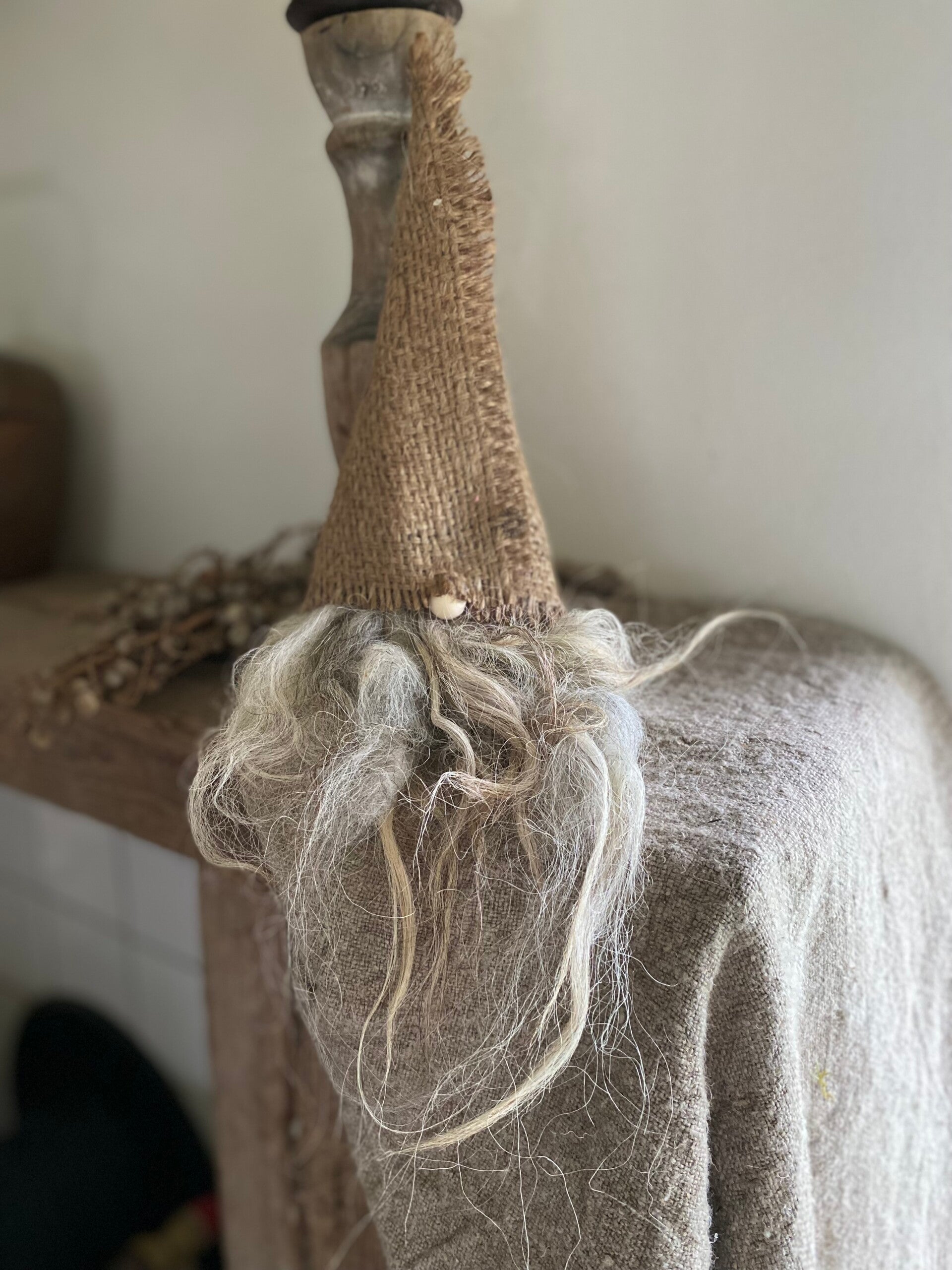 Mooie verweerde jute in combinatie met een volle schapenwollen toef.