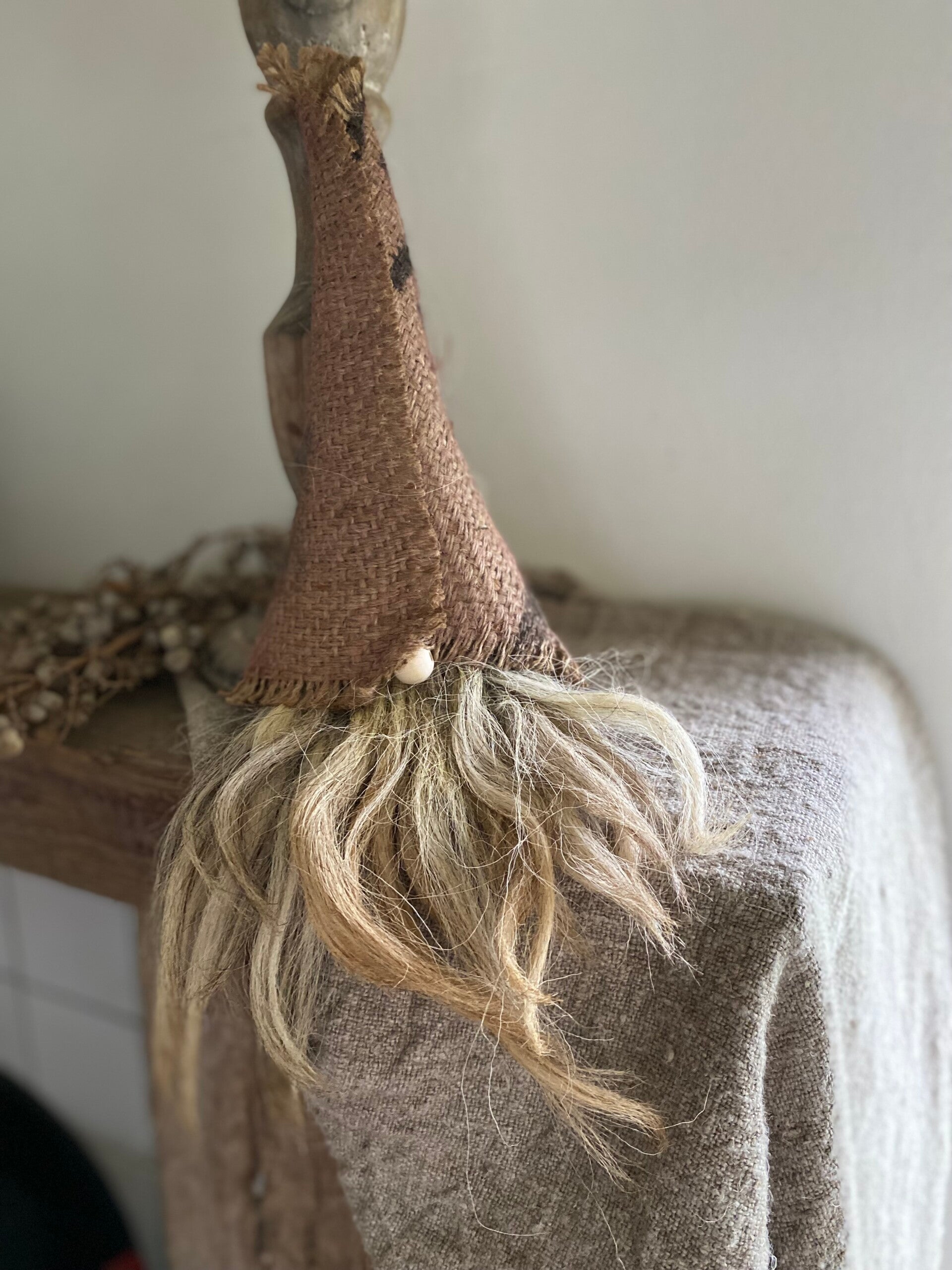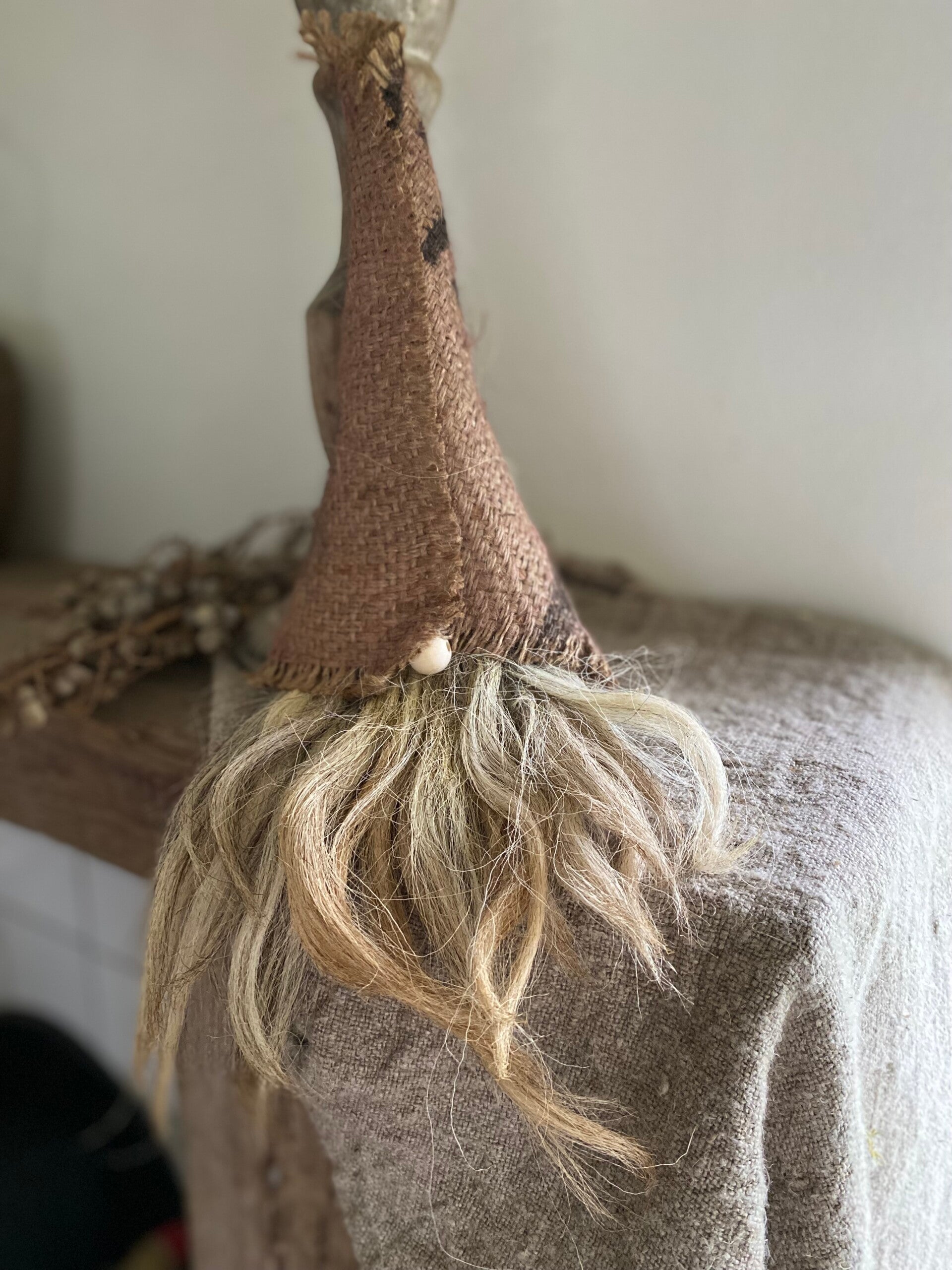 Mooie verweerde jute in combinatie met een volle schapenwollen toef.