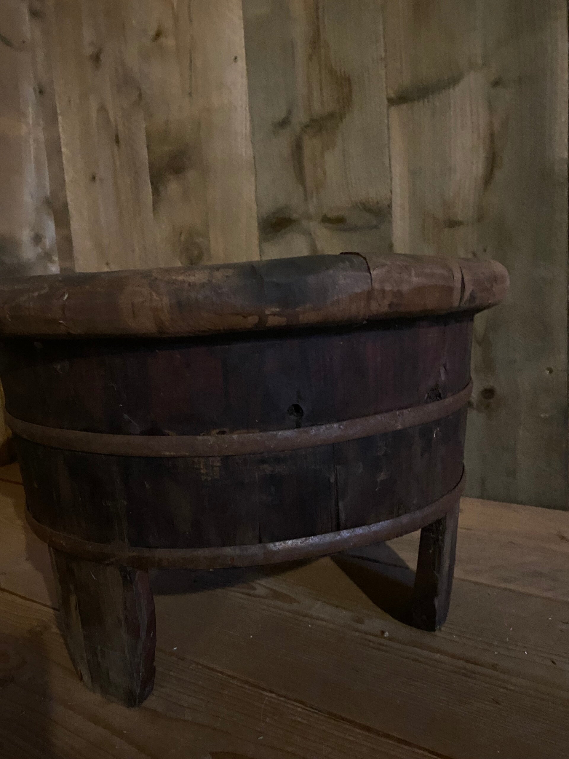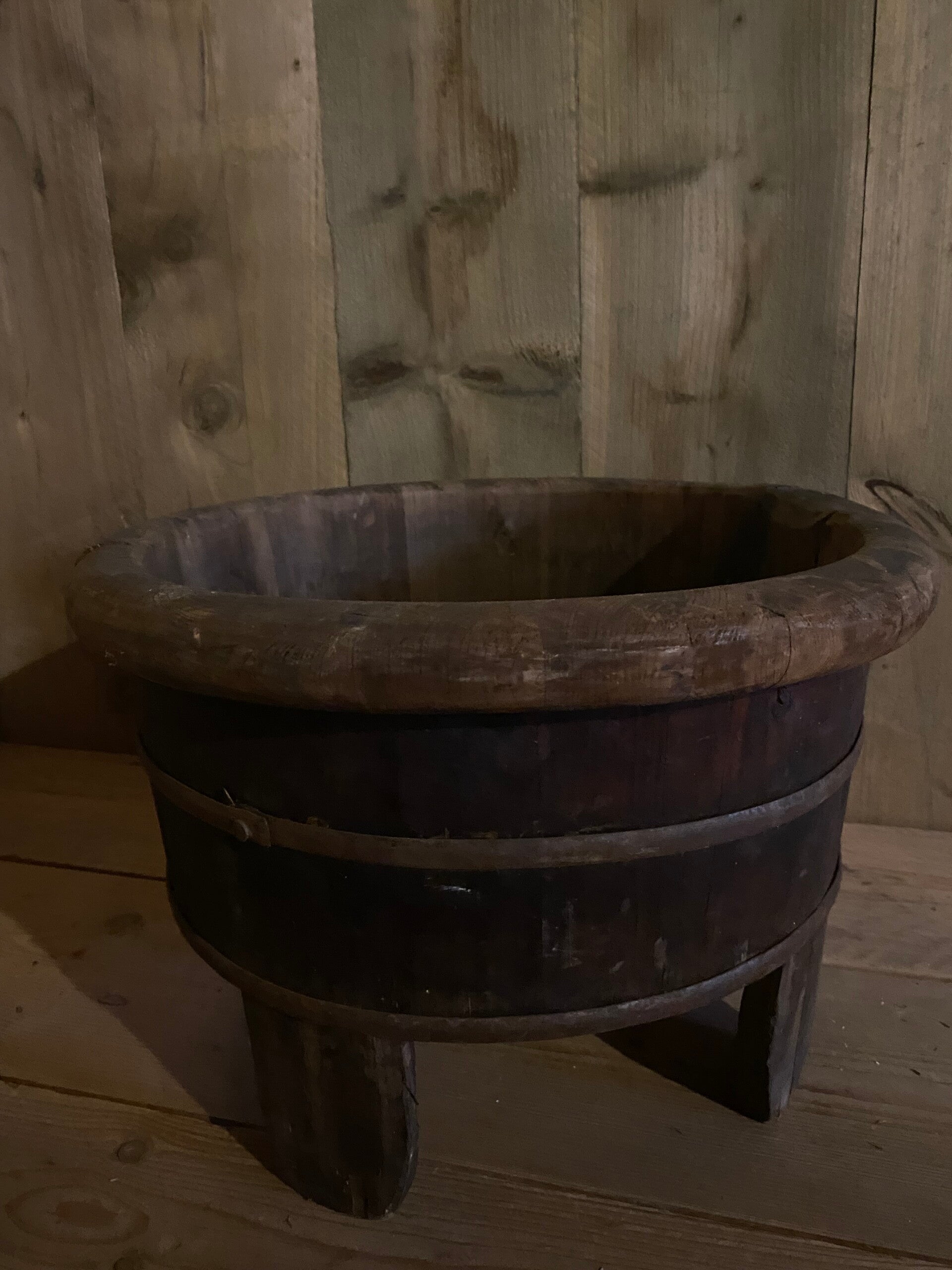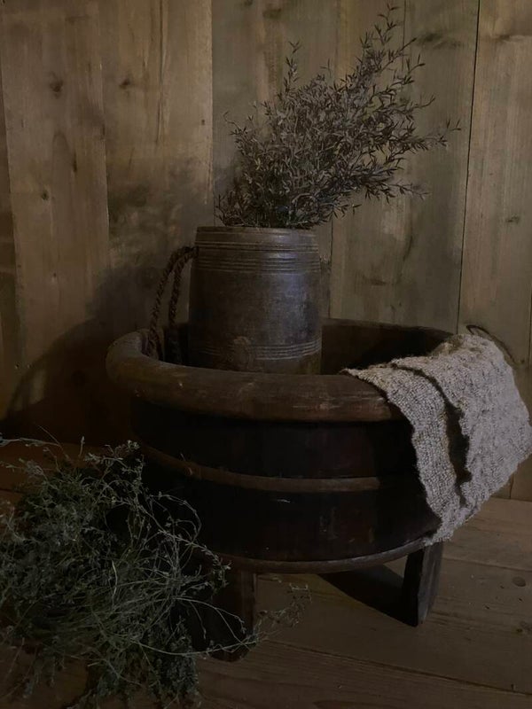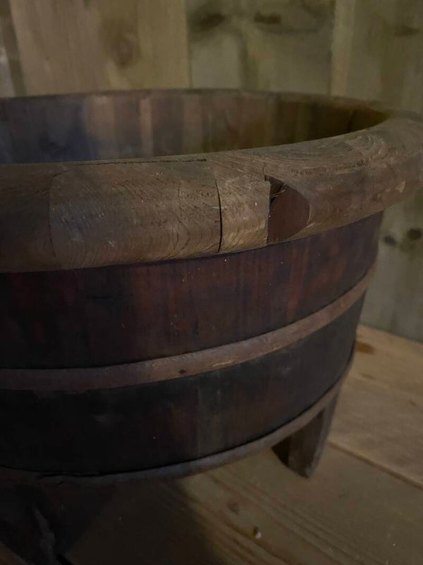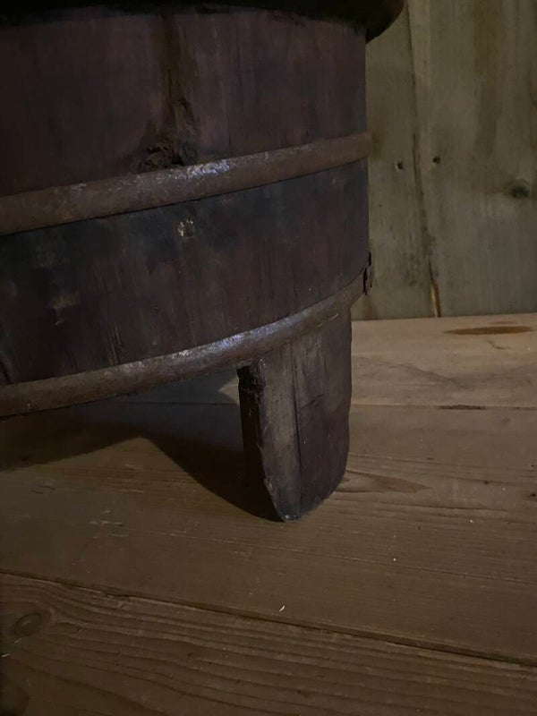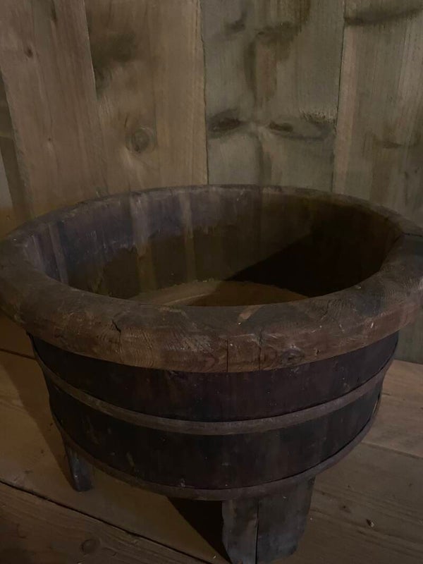 Authentieke donkere oude olijfbak op pootjes.