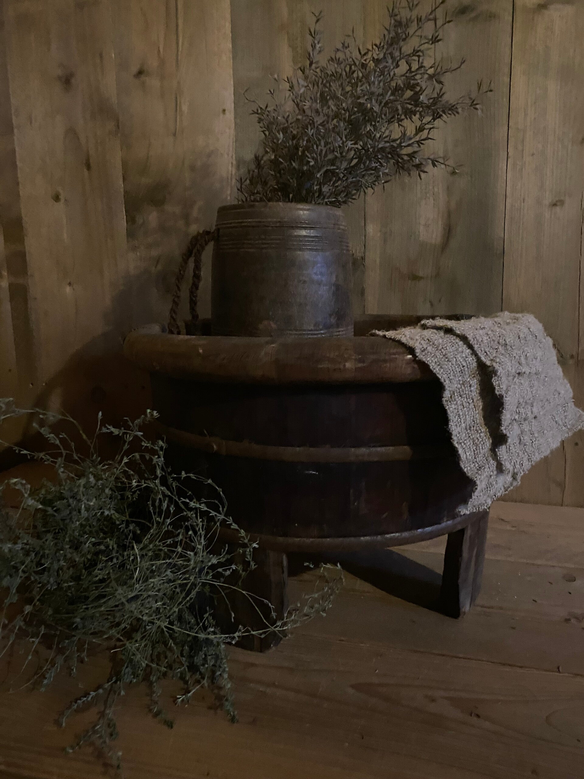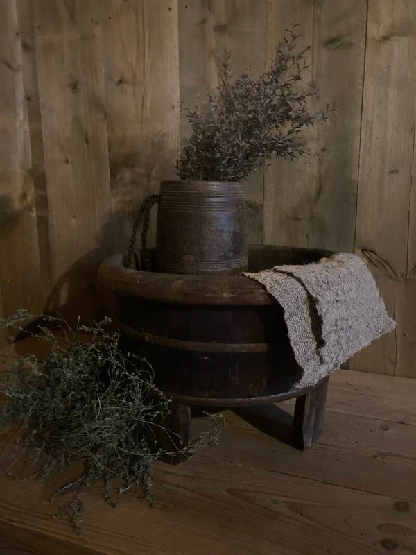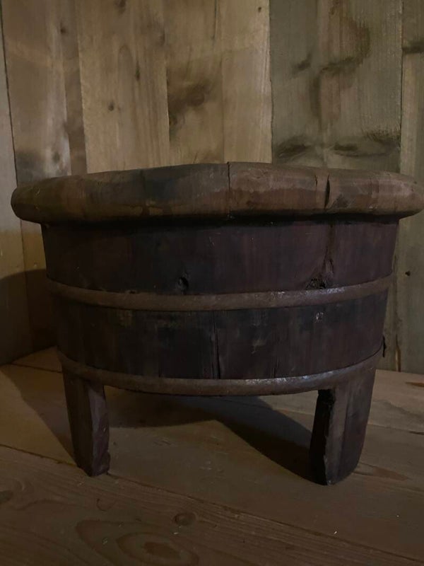 Originele oude olijfbak op pootjes.