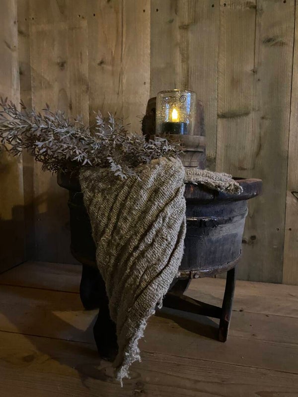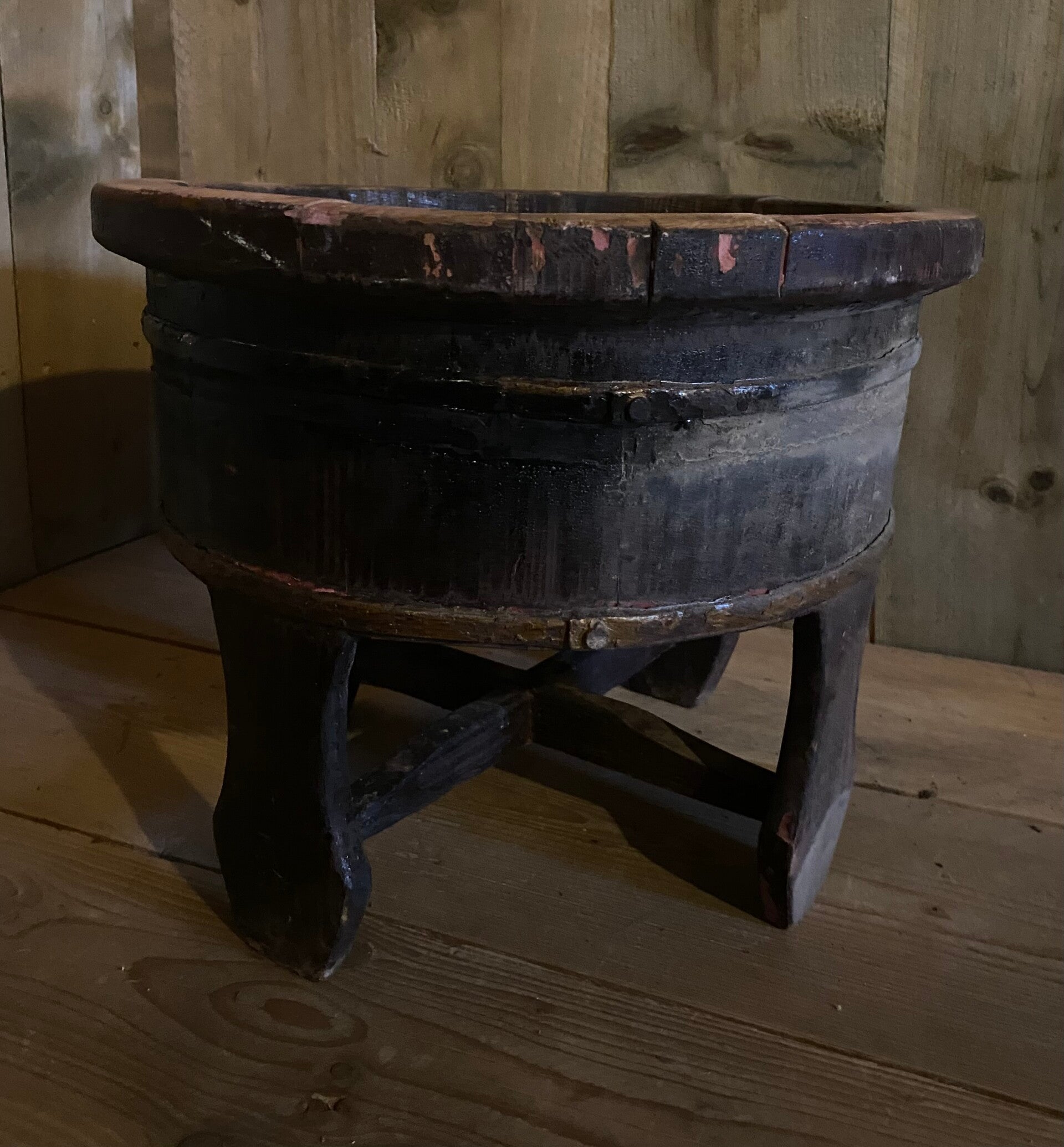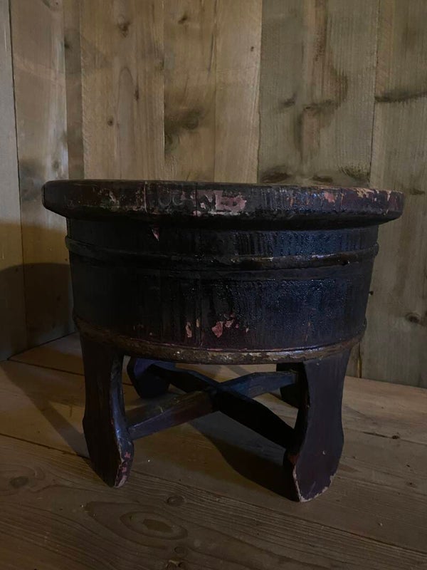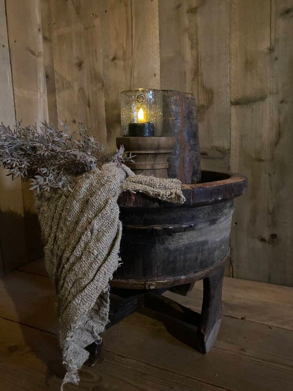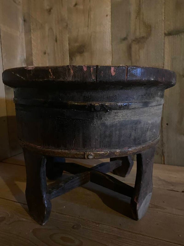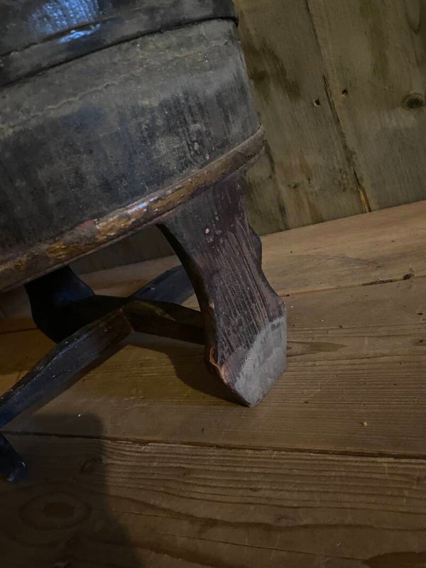 Originele oude olijfbak op pootjes met gebruikerssporen.