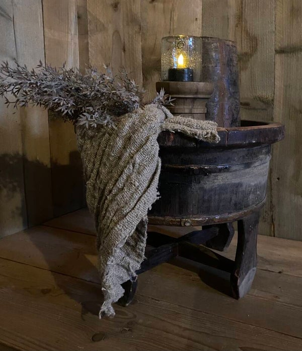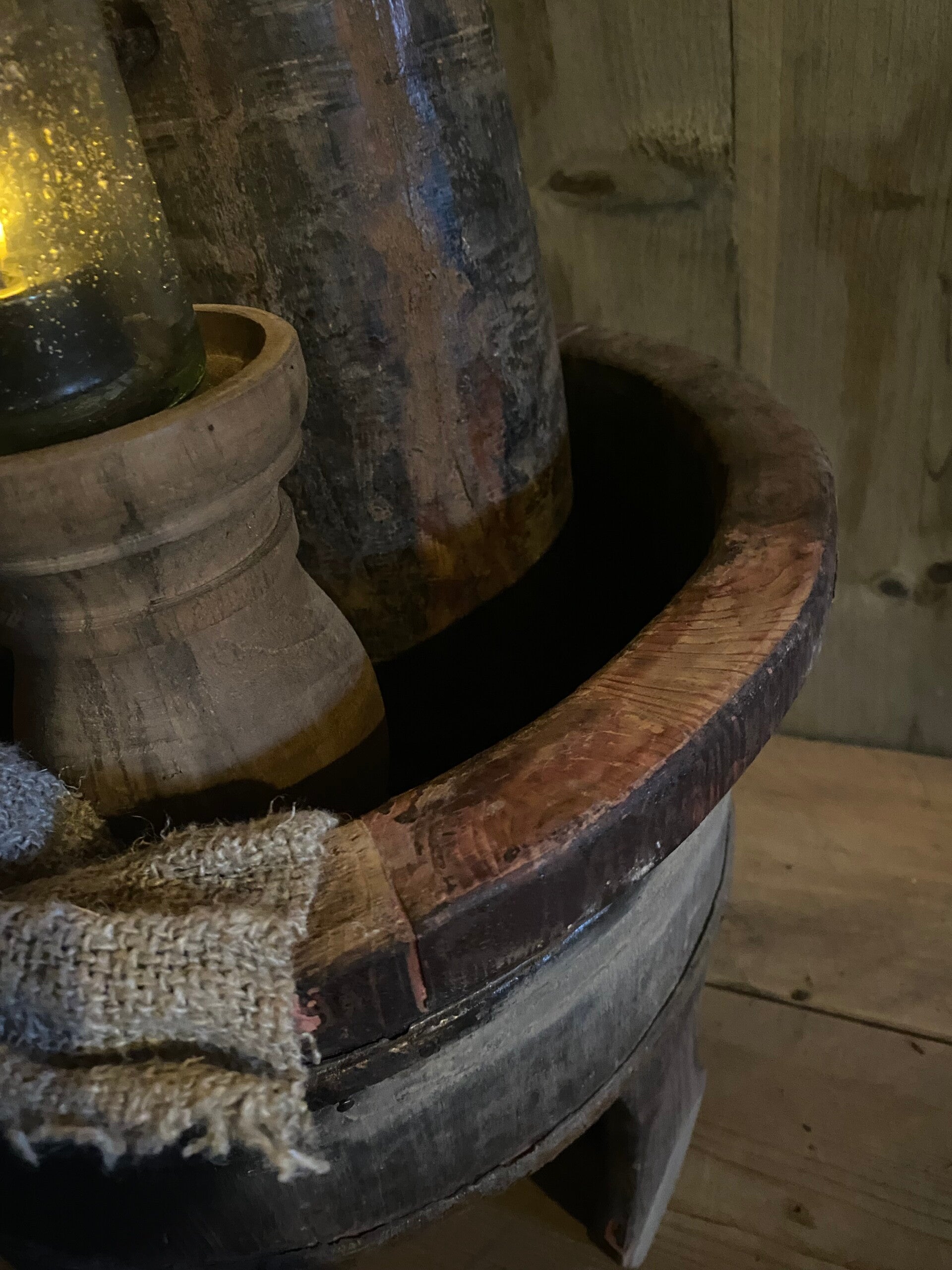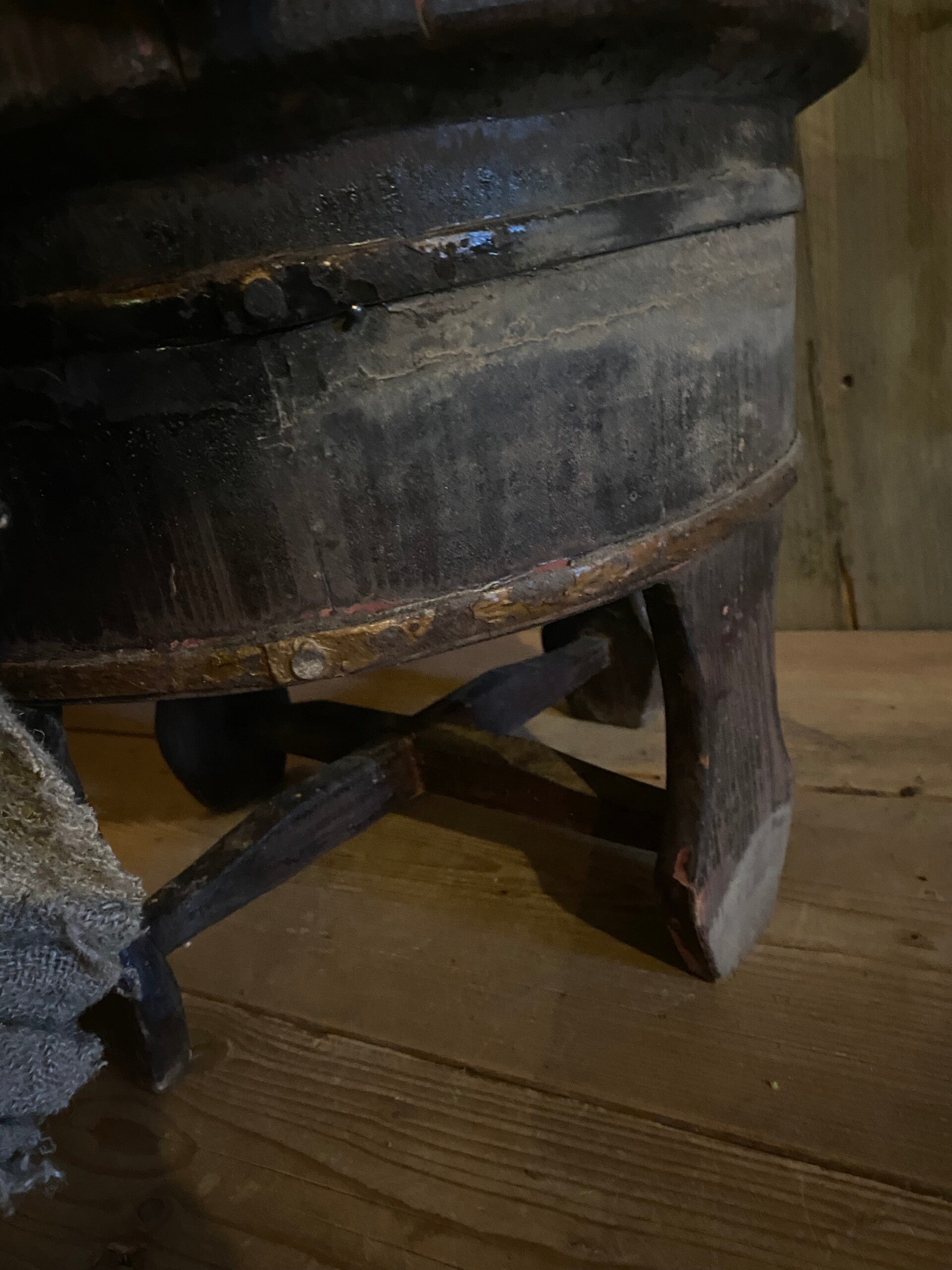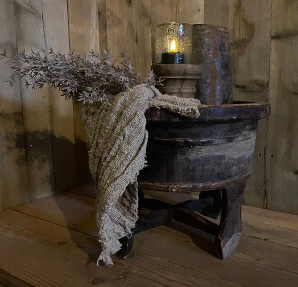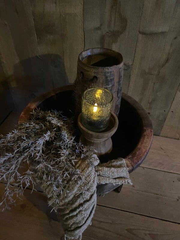 Originele oude olijfbak op pootjes met gebruikerssporen.