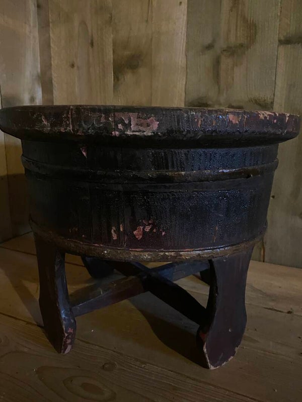 Authentieke donkere oude olijfbak op pootjes. Nr 2