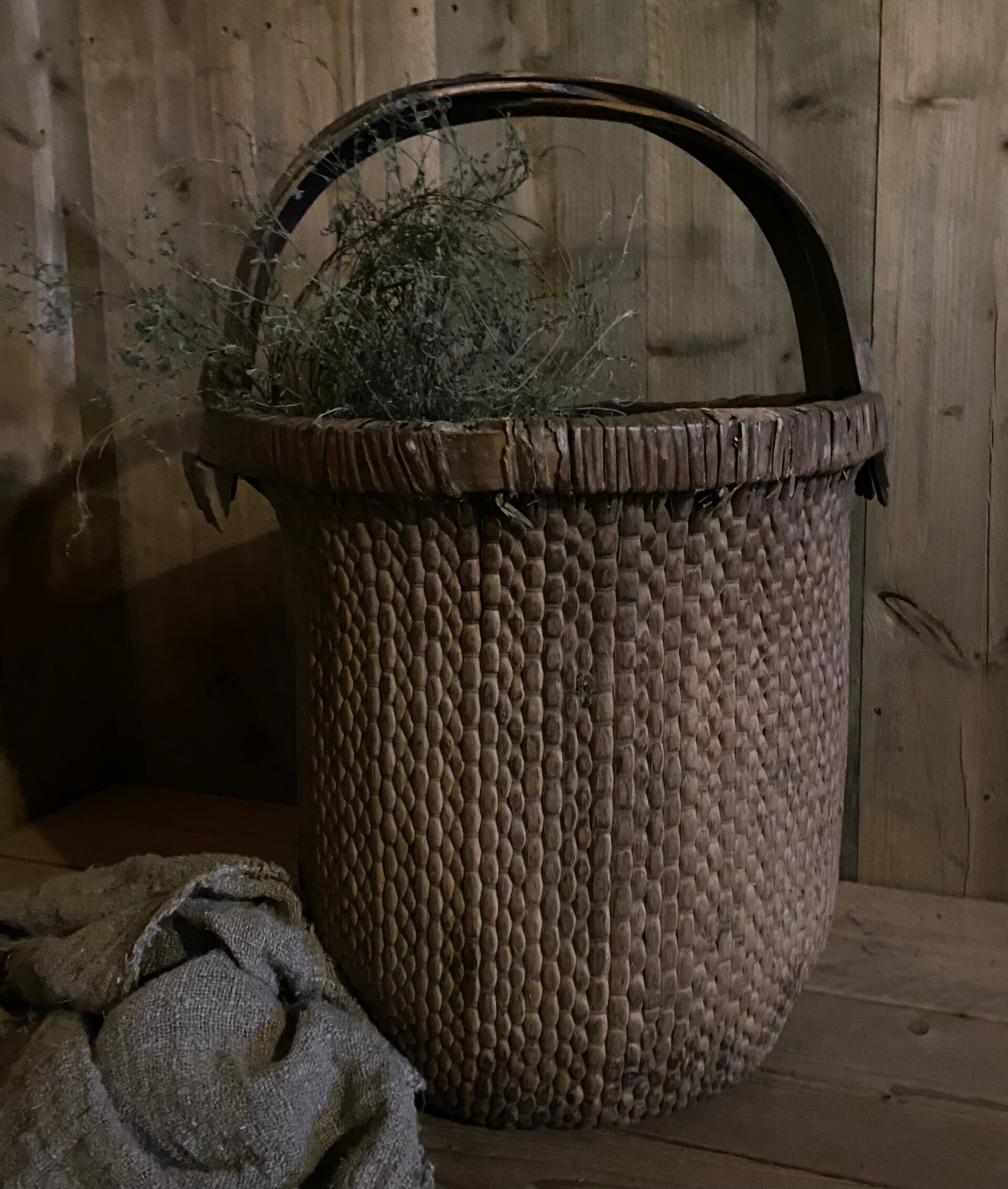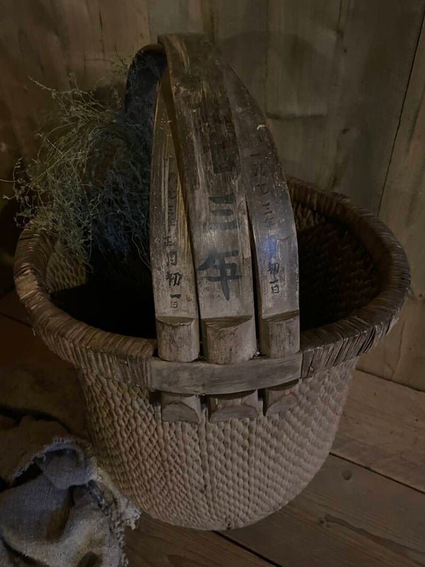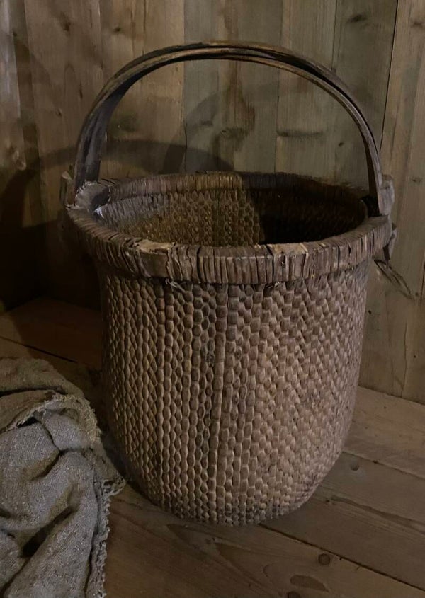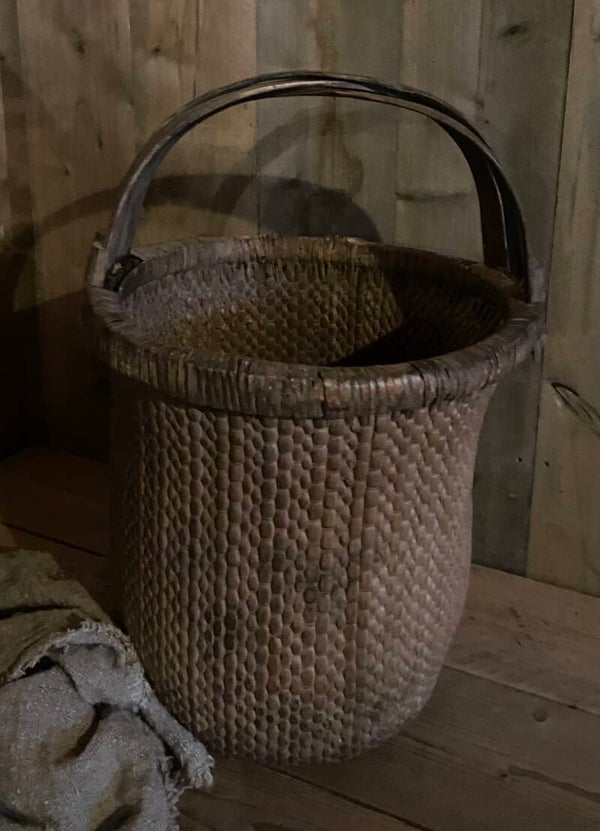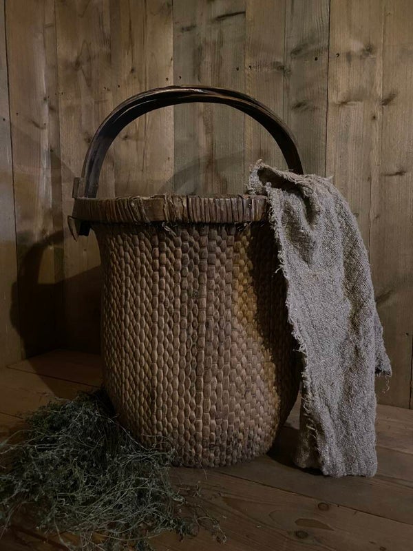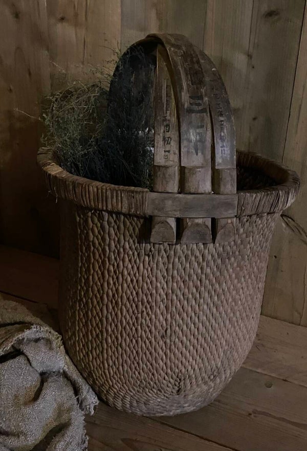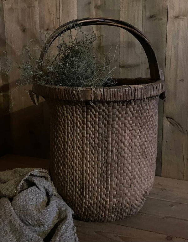 Deze doorleefde mand is zeer decoratief, of prachtig met een sobere tak erin, of als opslagmand voor kussens of plaids.