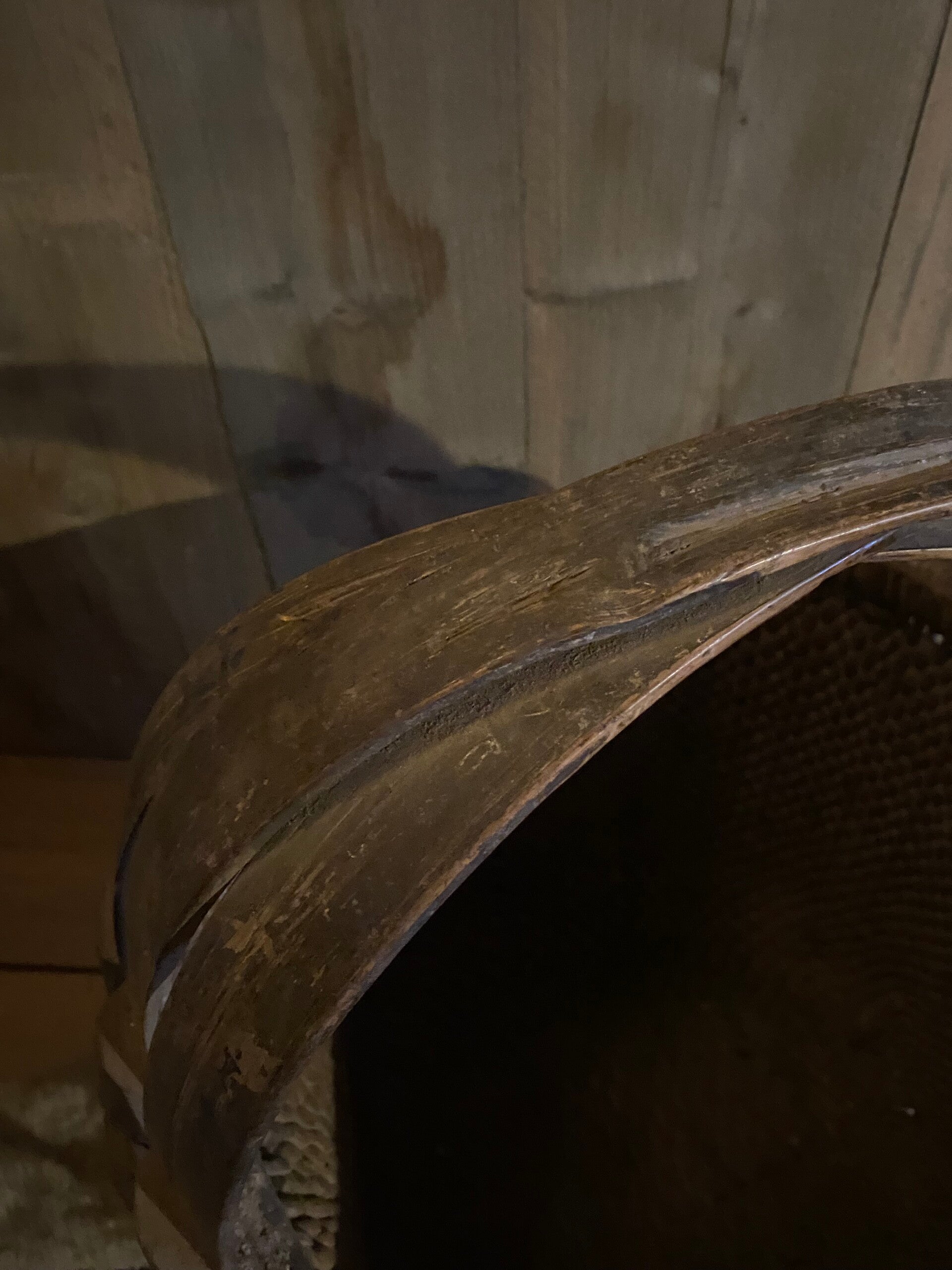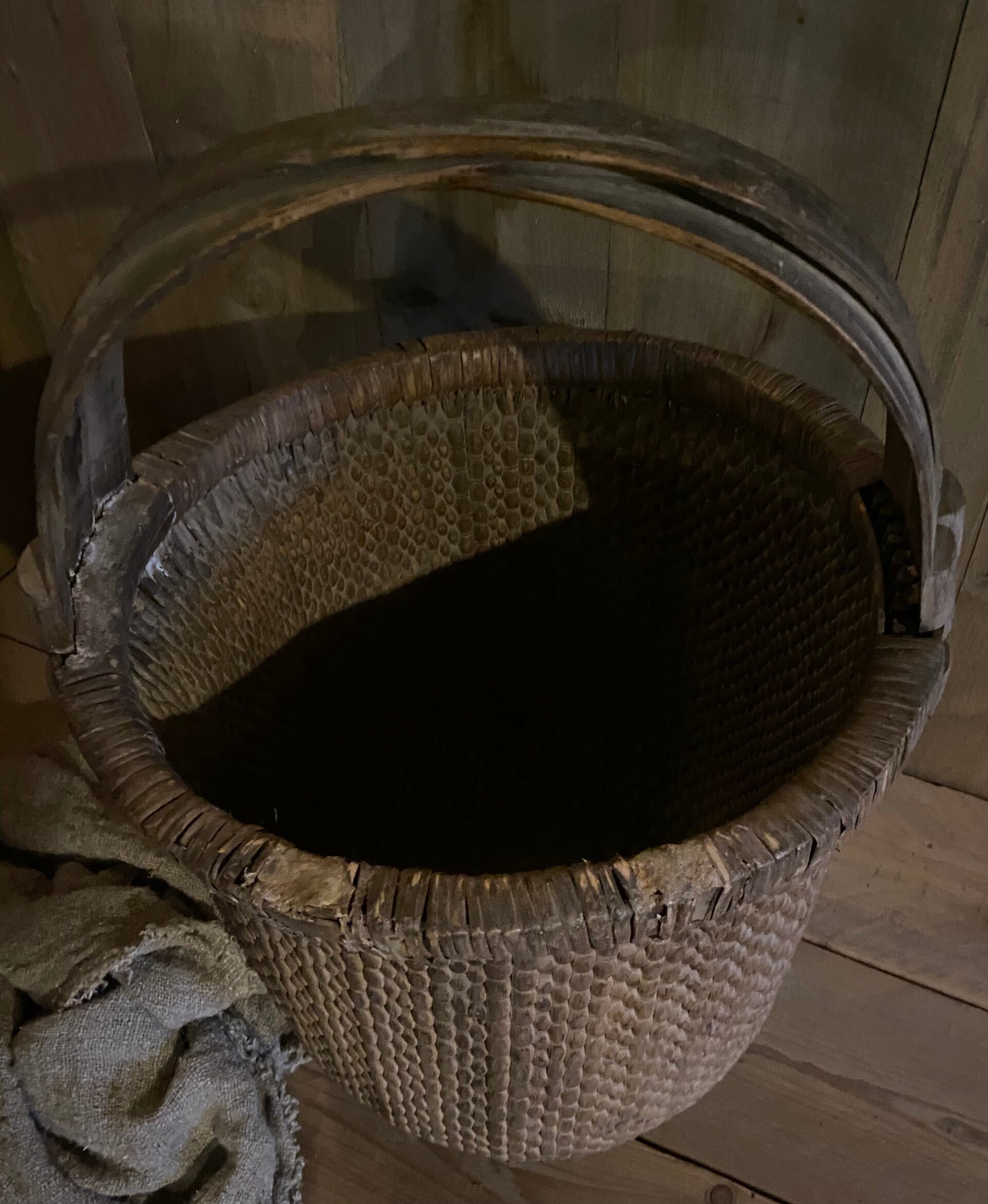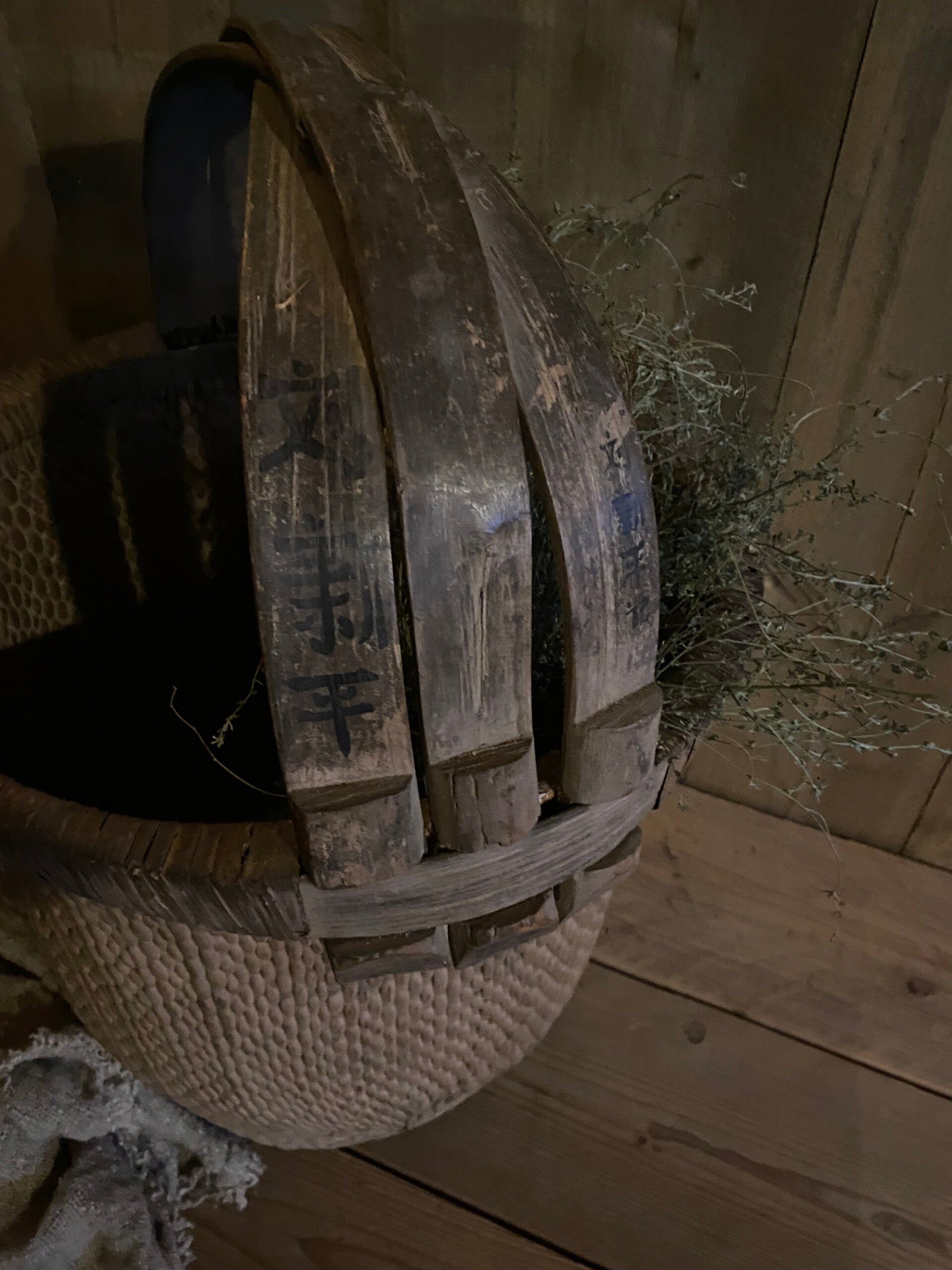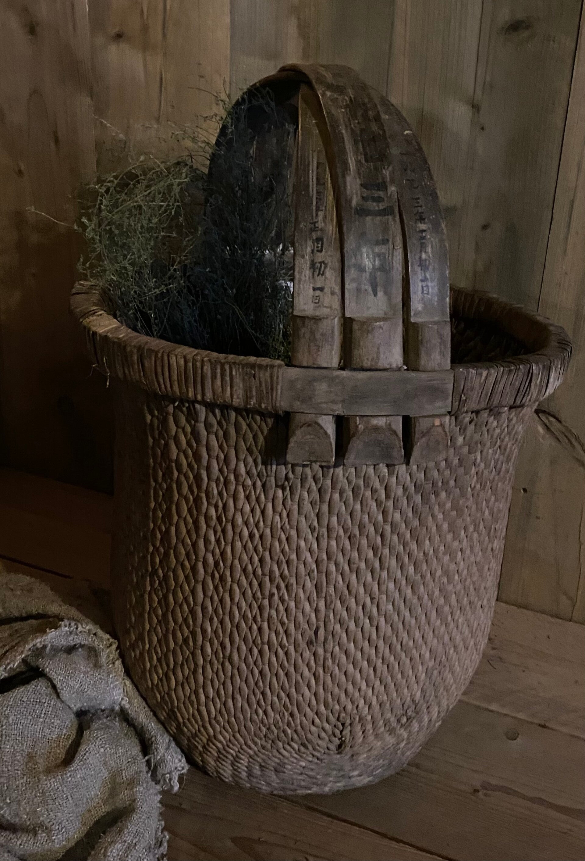 Deze doorleefde mand is zeer decoratief, of prachtig met een sobere tak erin, of als opslagmand voor kussens of plaids.