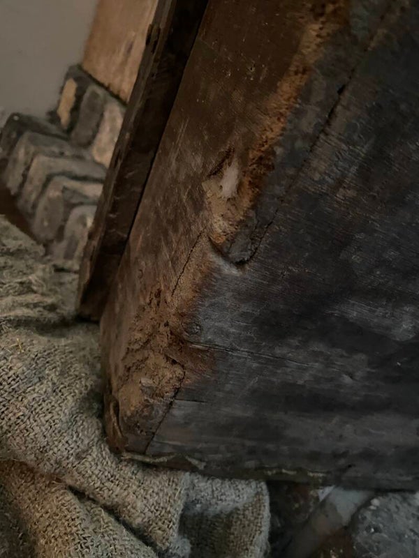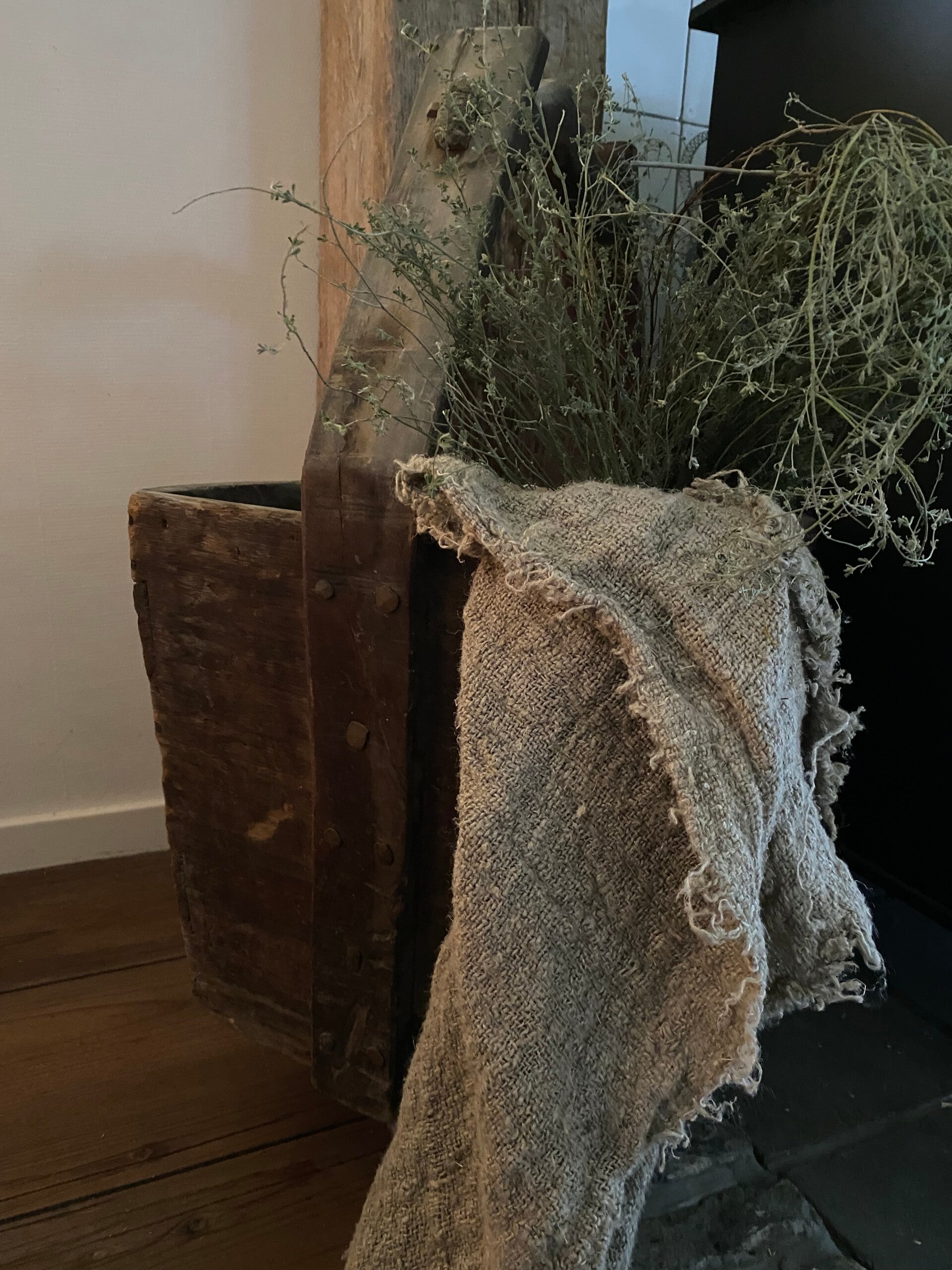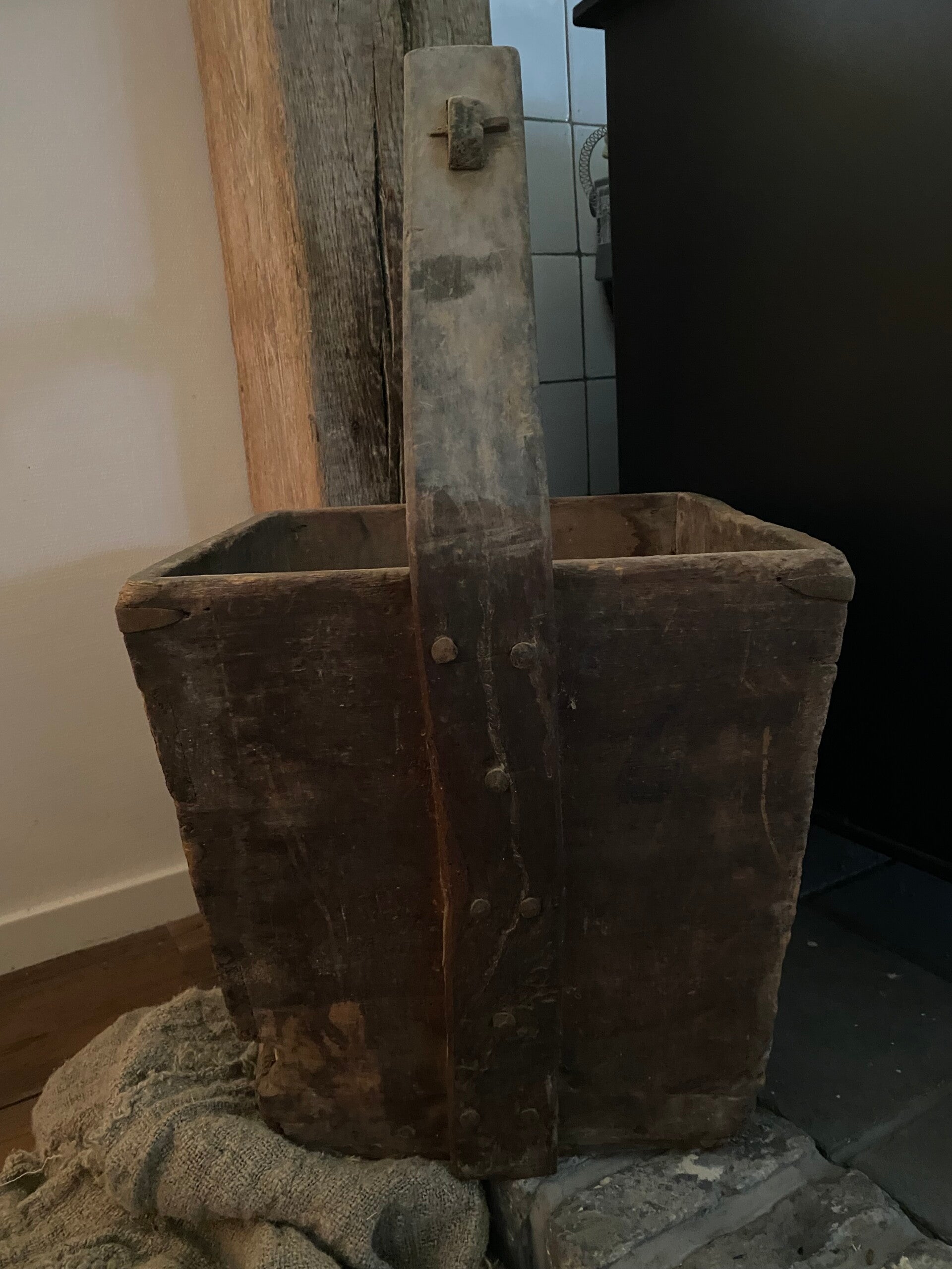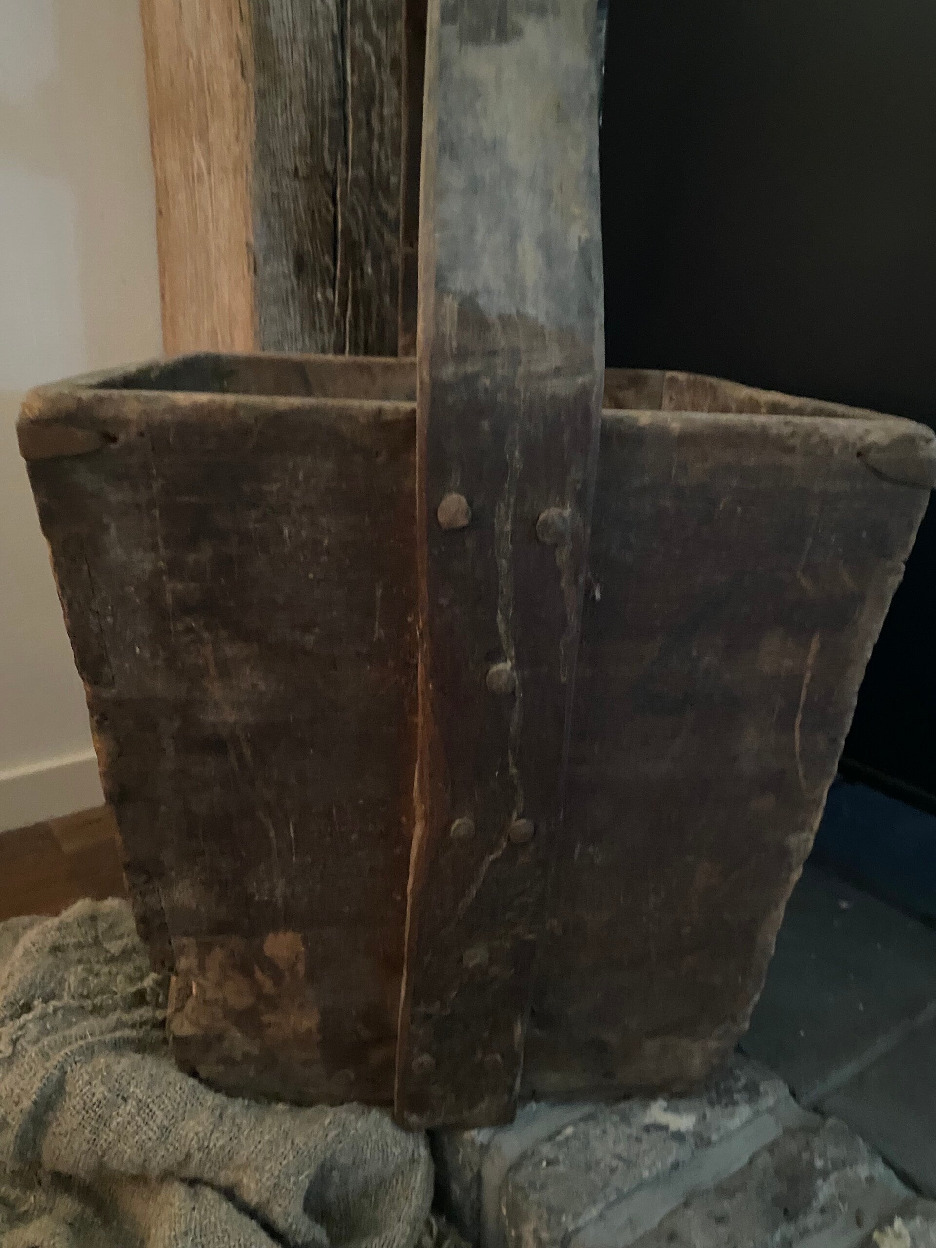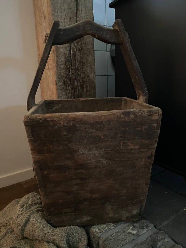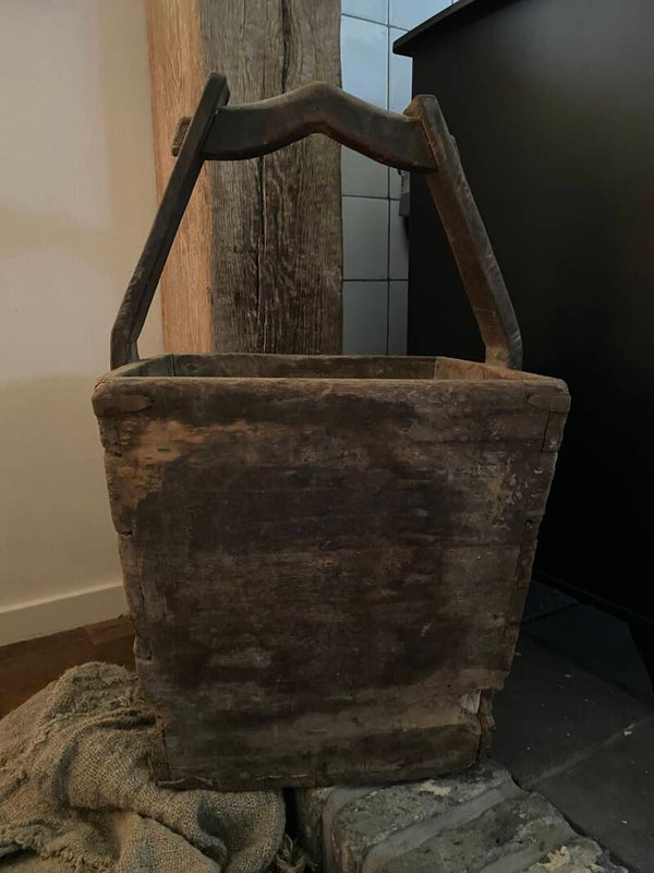 Prachtige authentieke doorleefde vierkante plukemmer met een verweerde uitstraling, zoals het stukje oud stof onderaan de emmer