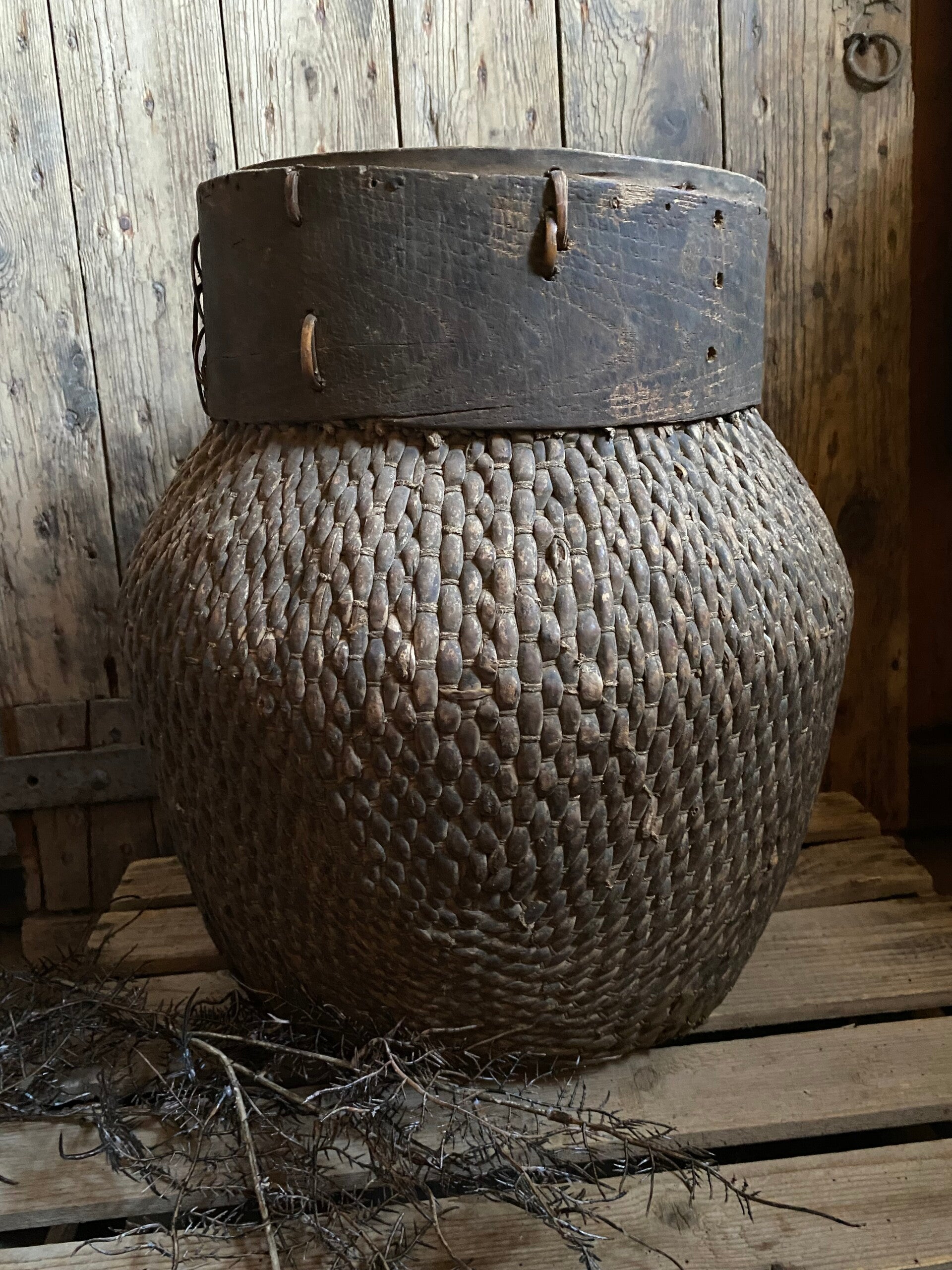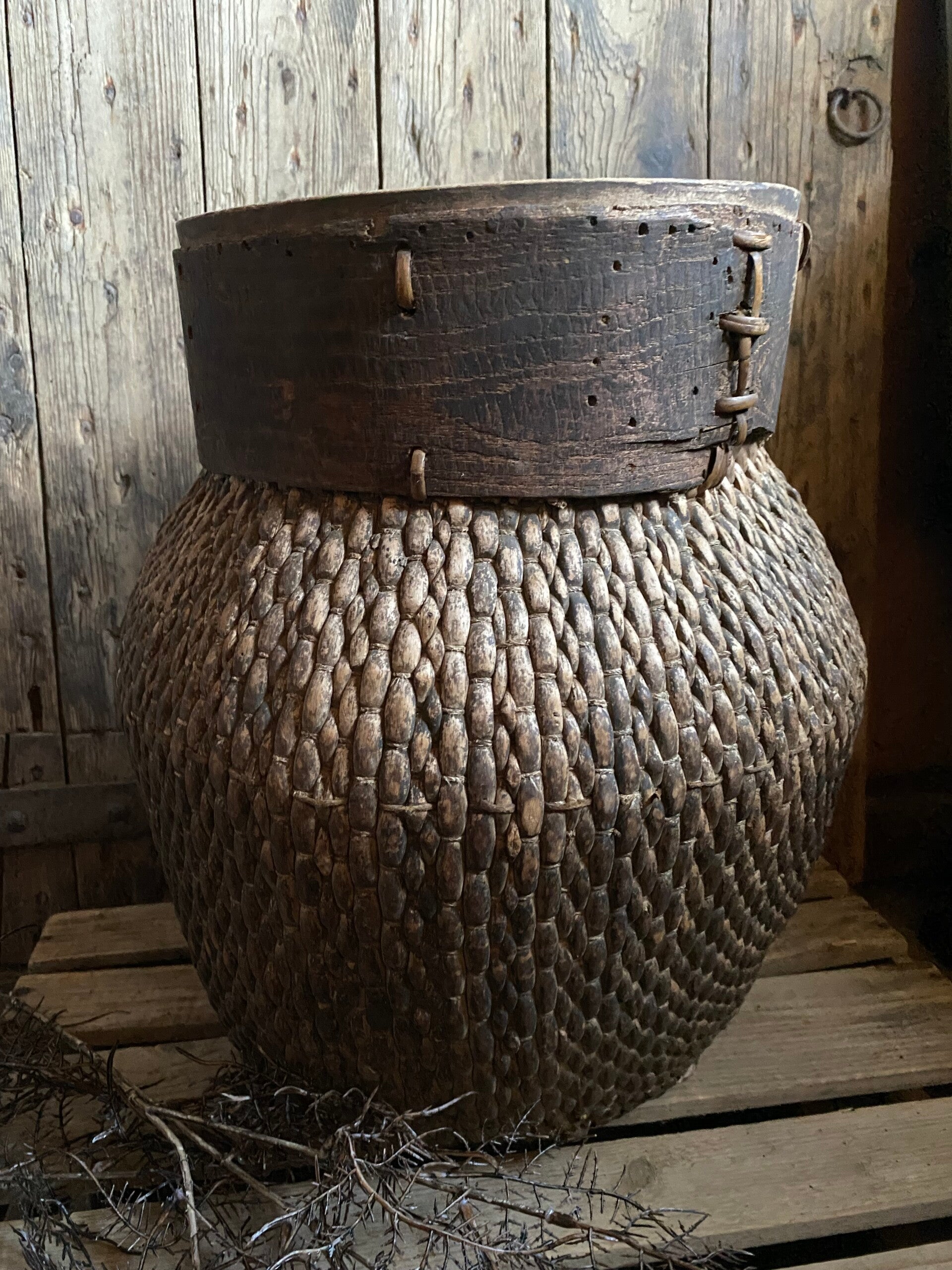 Authentieke mand met houten rand.