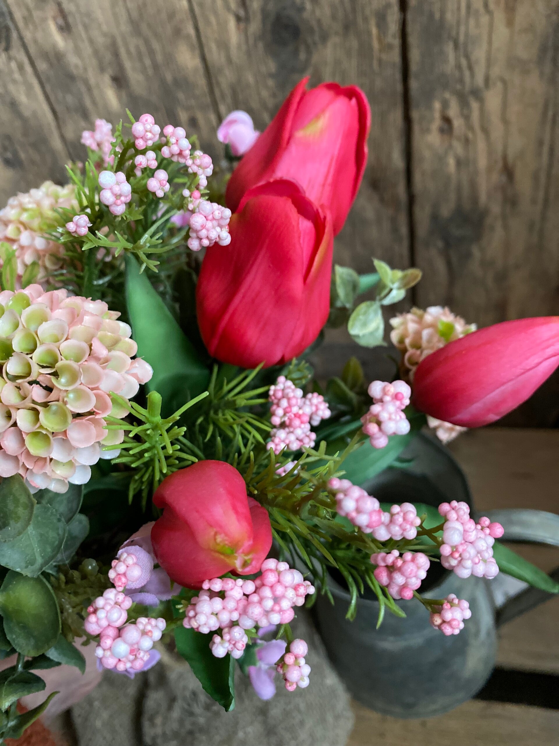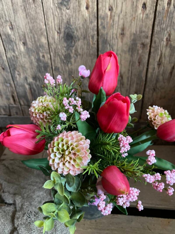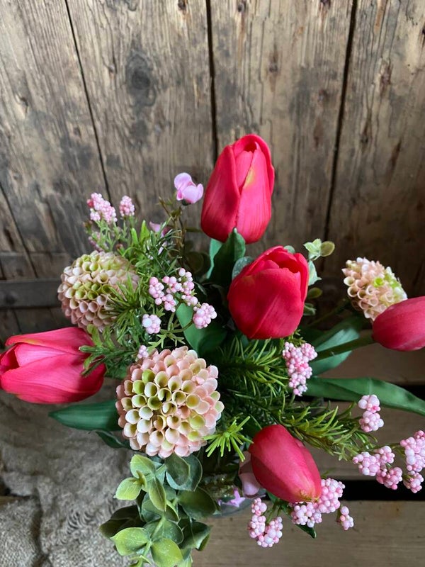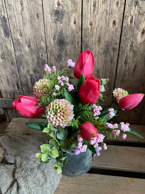 Boeketje donker roze tulpen met licht roze dahlia’s