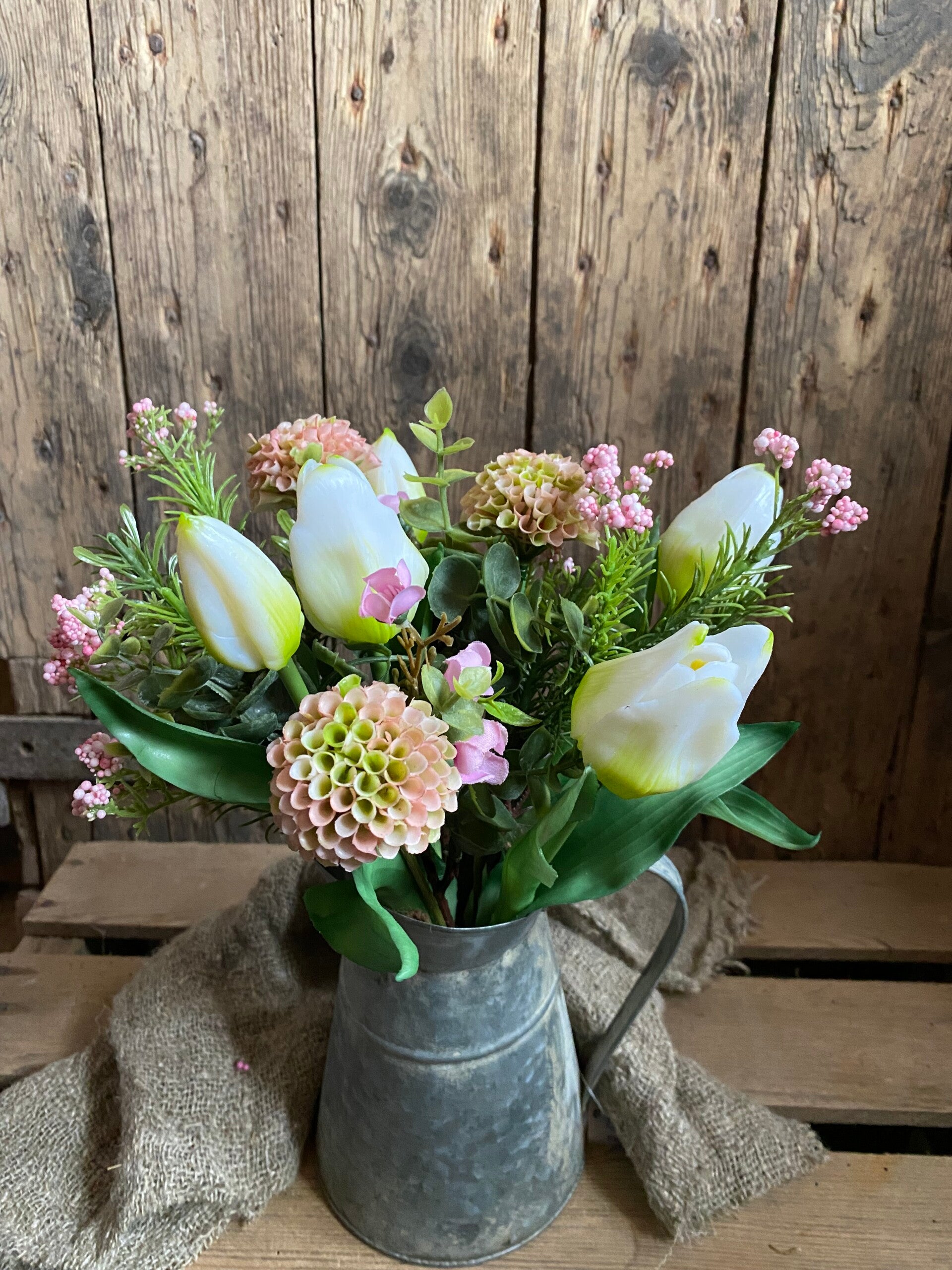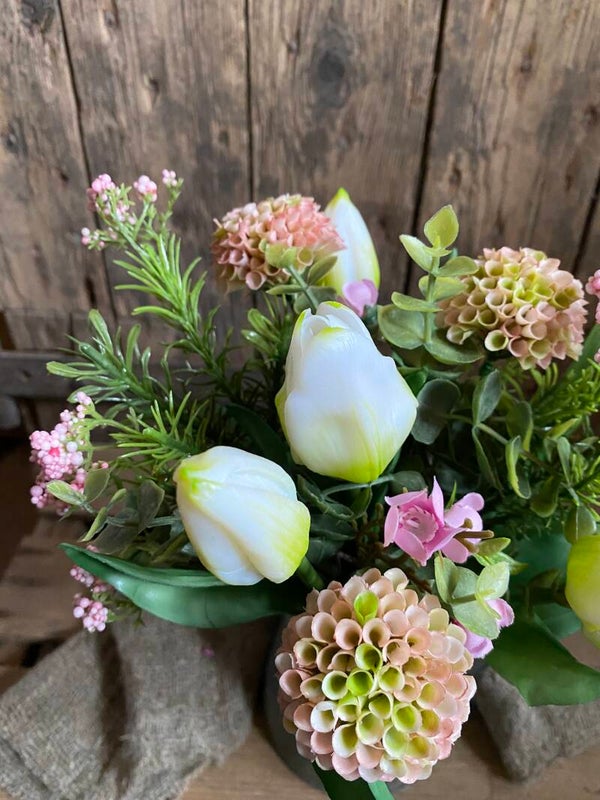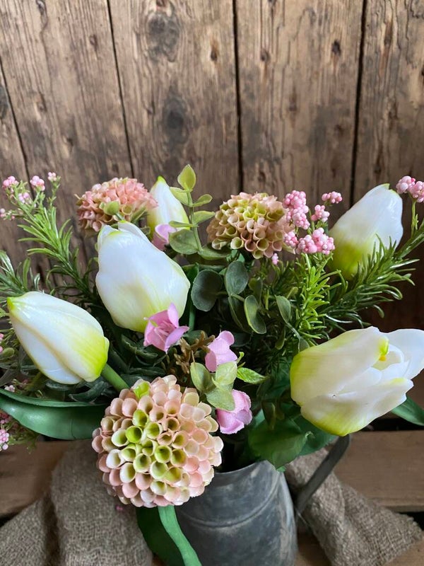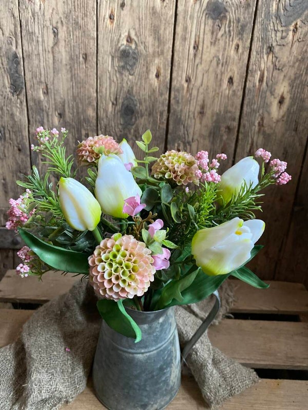 Boeketje witte tulpen met licht roze dahlia’s