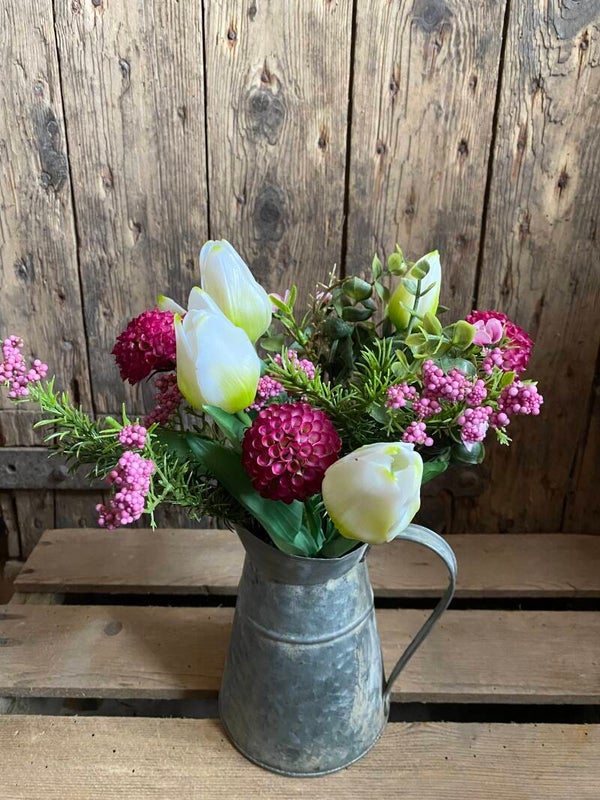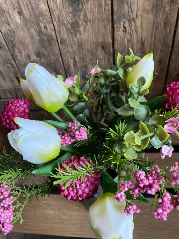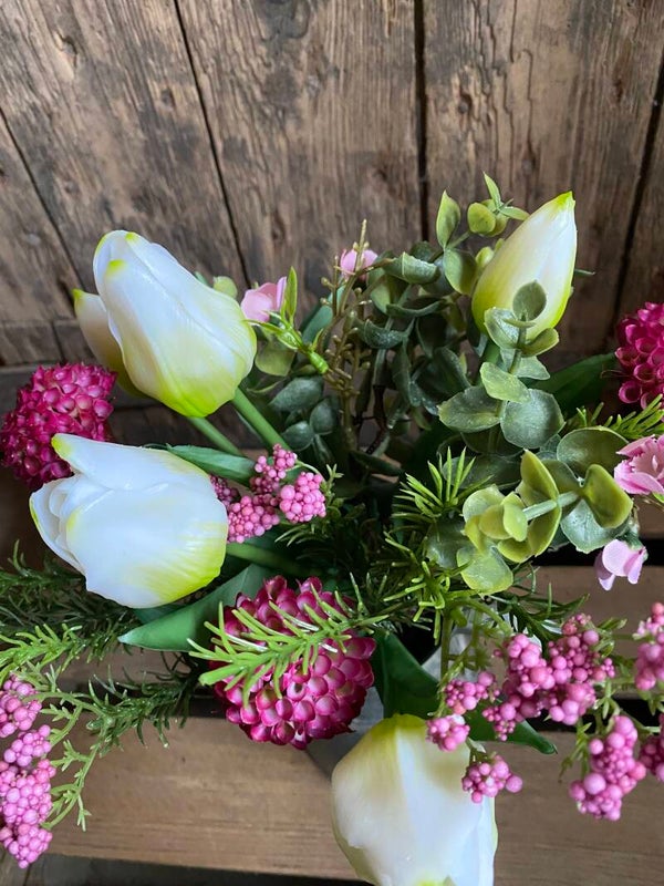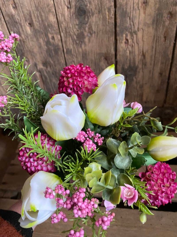 Boeketje bestaat uit vijf tulpen van 30 cm en 1 boeketje dahlia licht roze