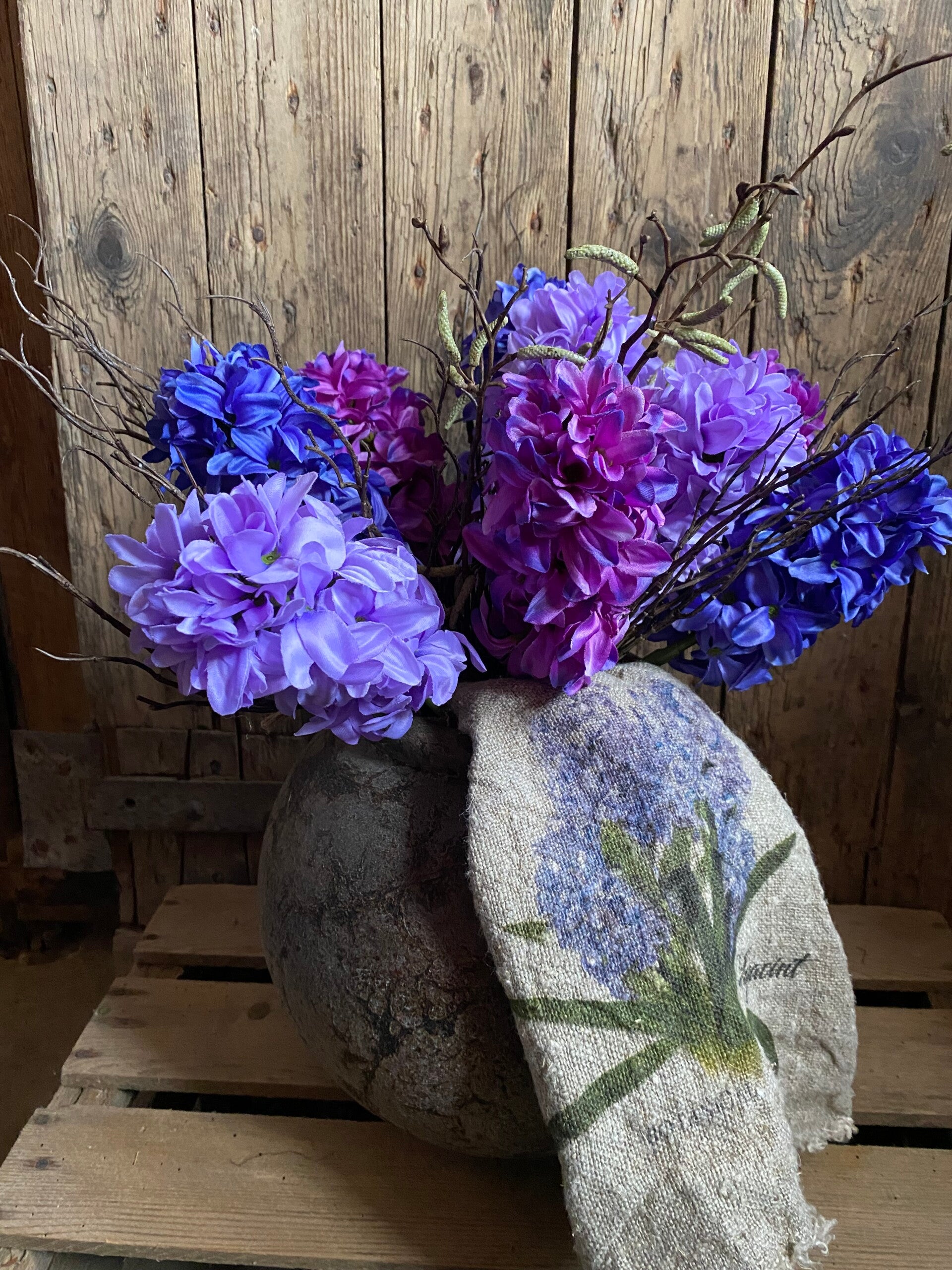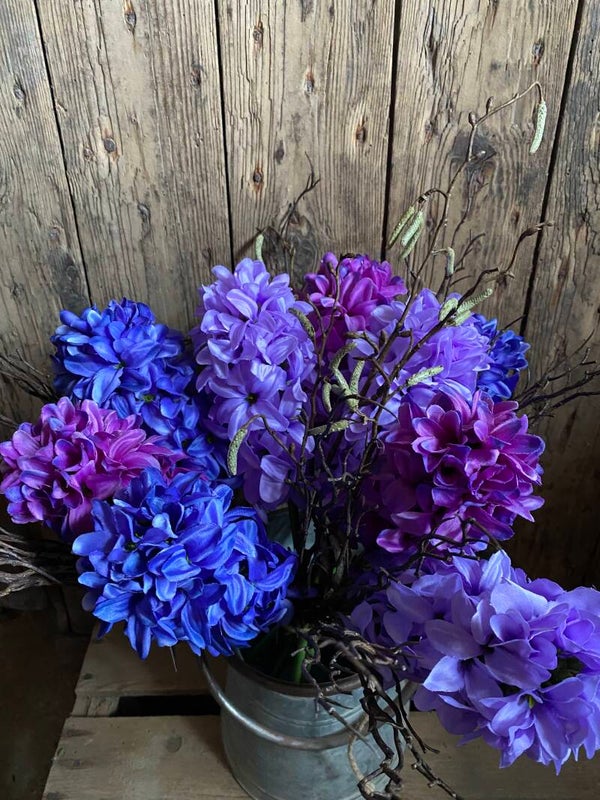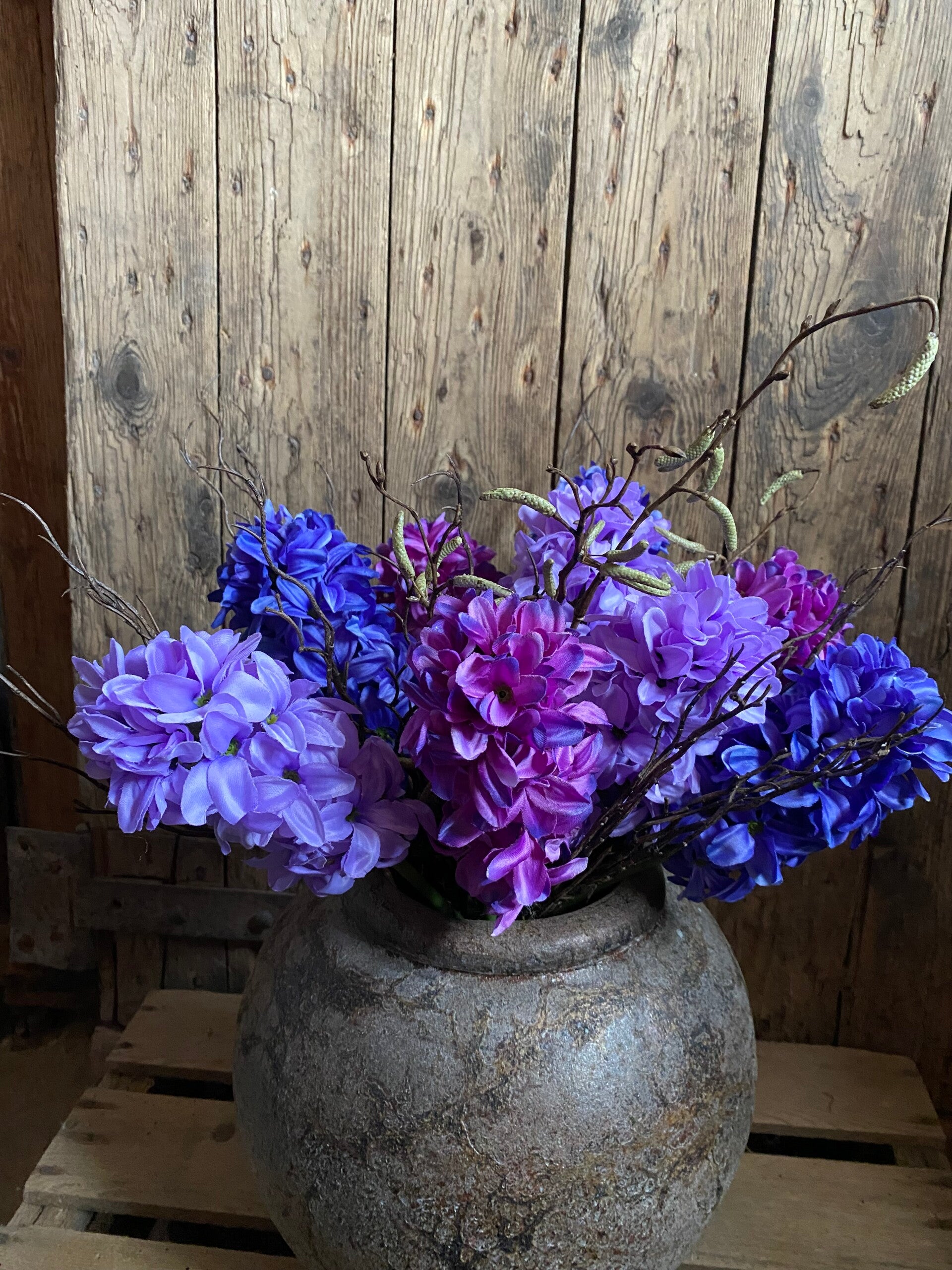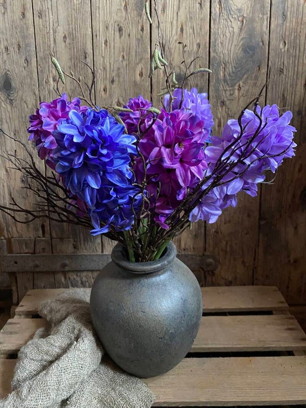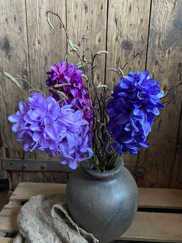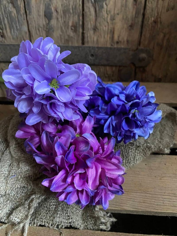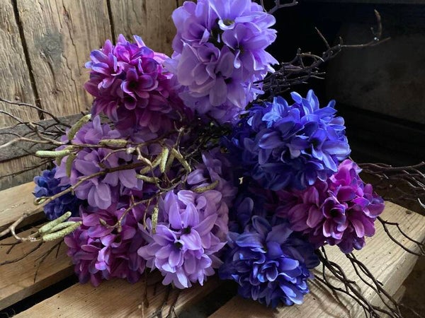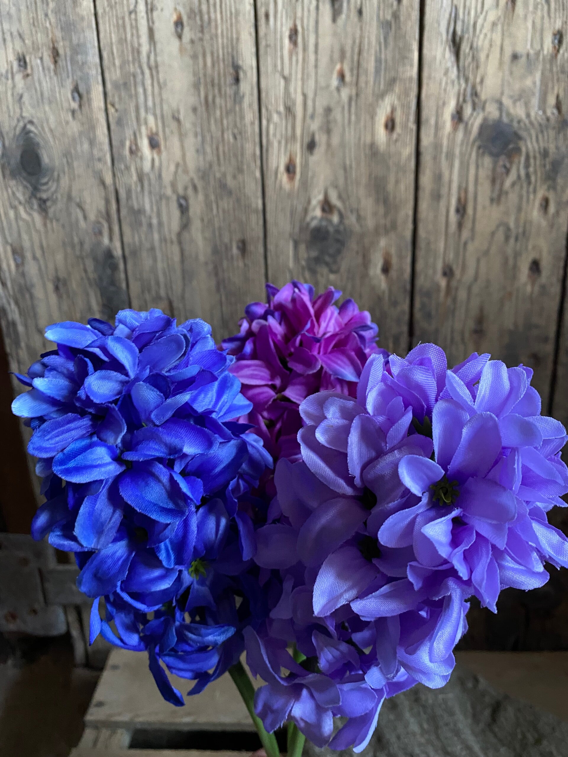 bosje van drie hyacinten, in de kleur donkerpaars/blauw, paars en hard roze