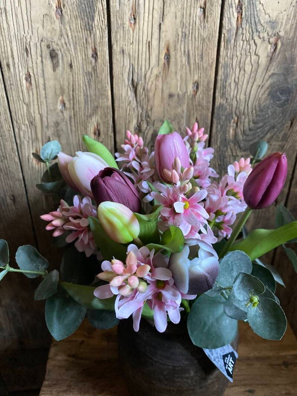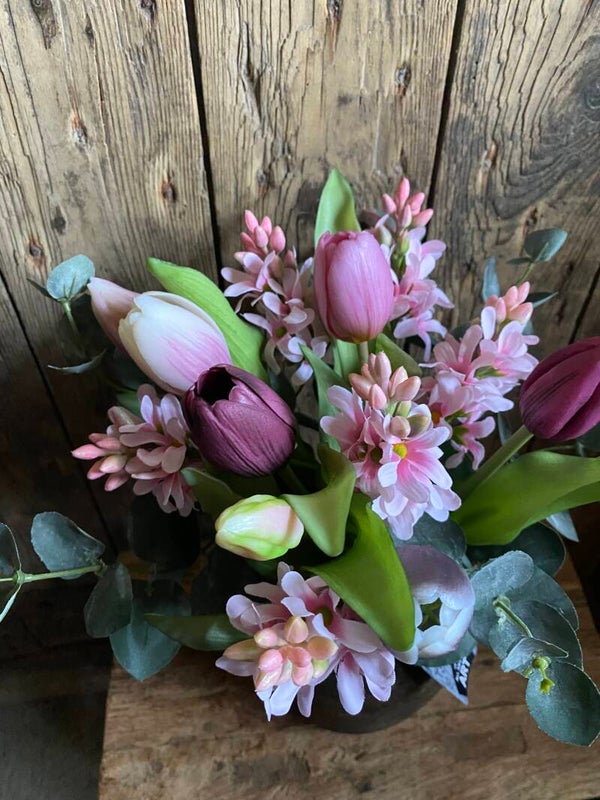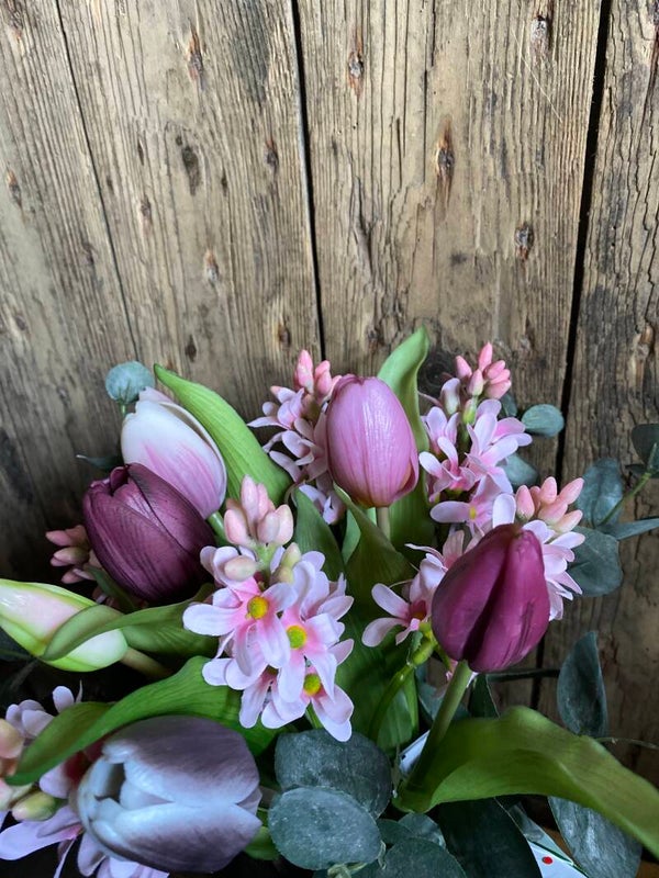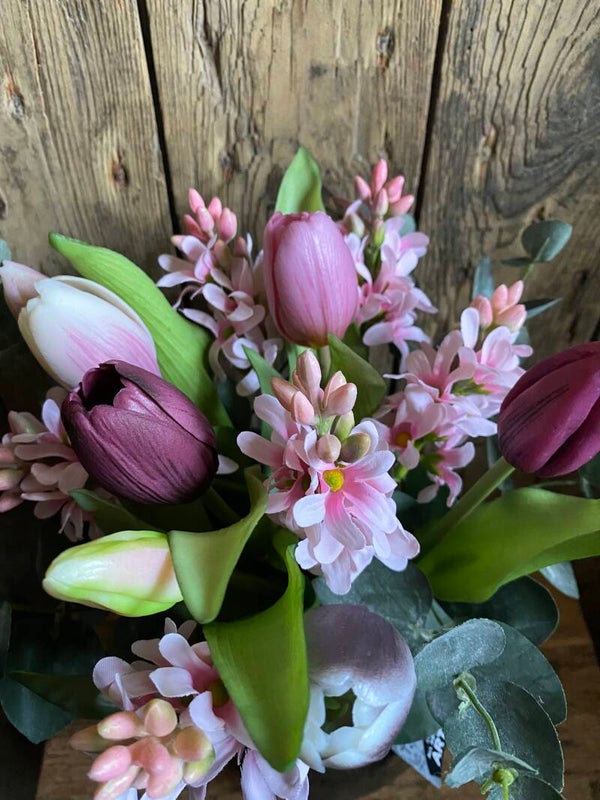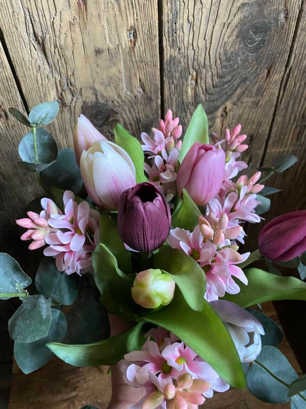 Prachtig tussen de tulpen van 30 cm en wat eucalyptus.