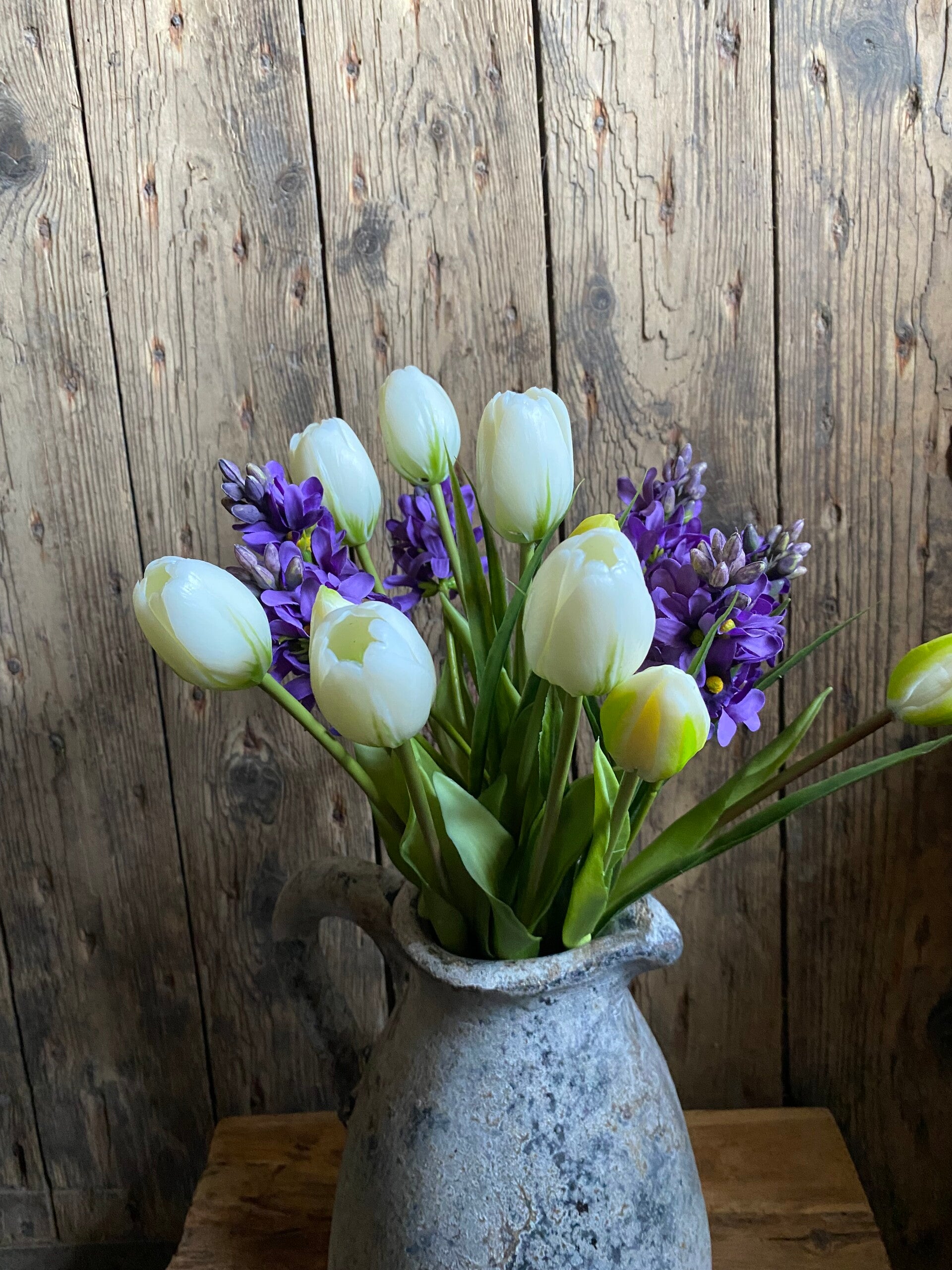 Prachtig tussen de tulpen van 30 cm en wat eucalyptus.