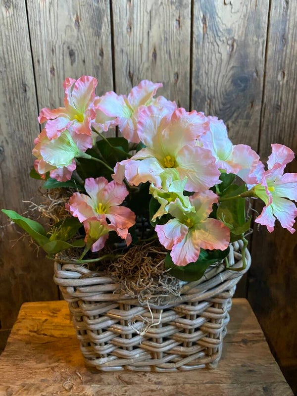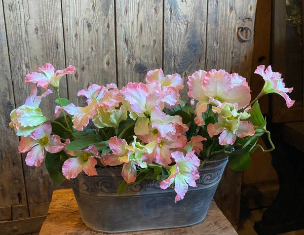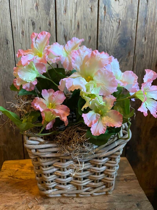 In het de zinken bak zitten twee plantjes en in rotan mandje zit 1 plantje