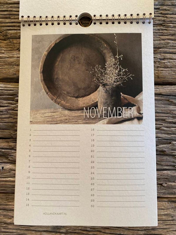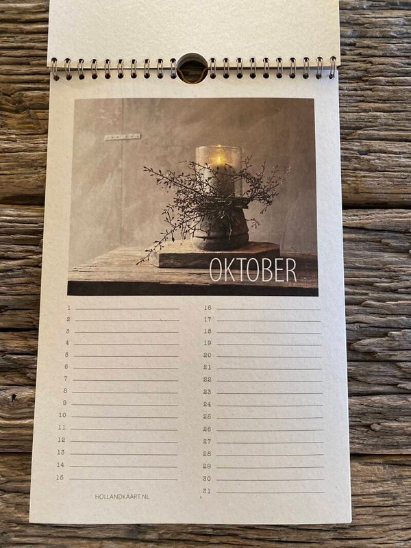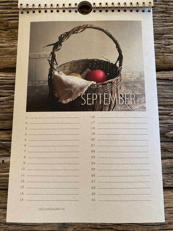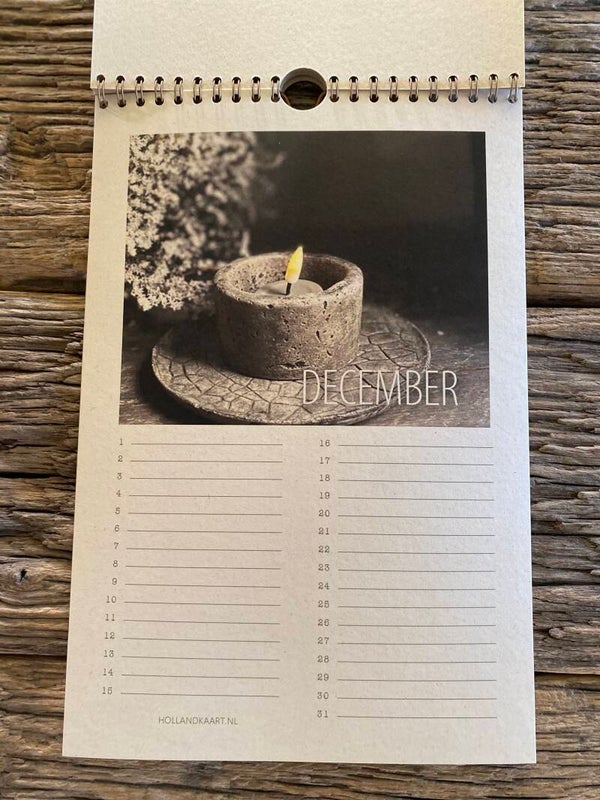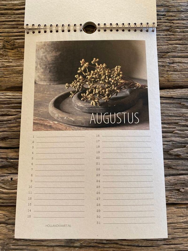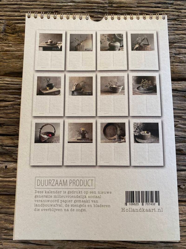Het stevige papier van de kalender is beige kleur, gemaakt van land en tuinbouw afval.