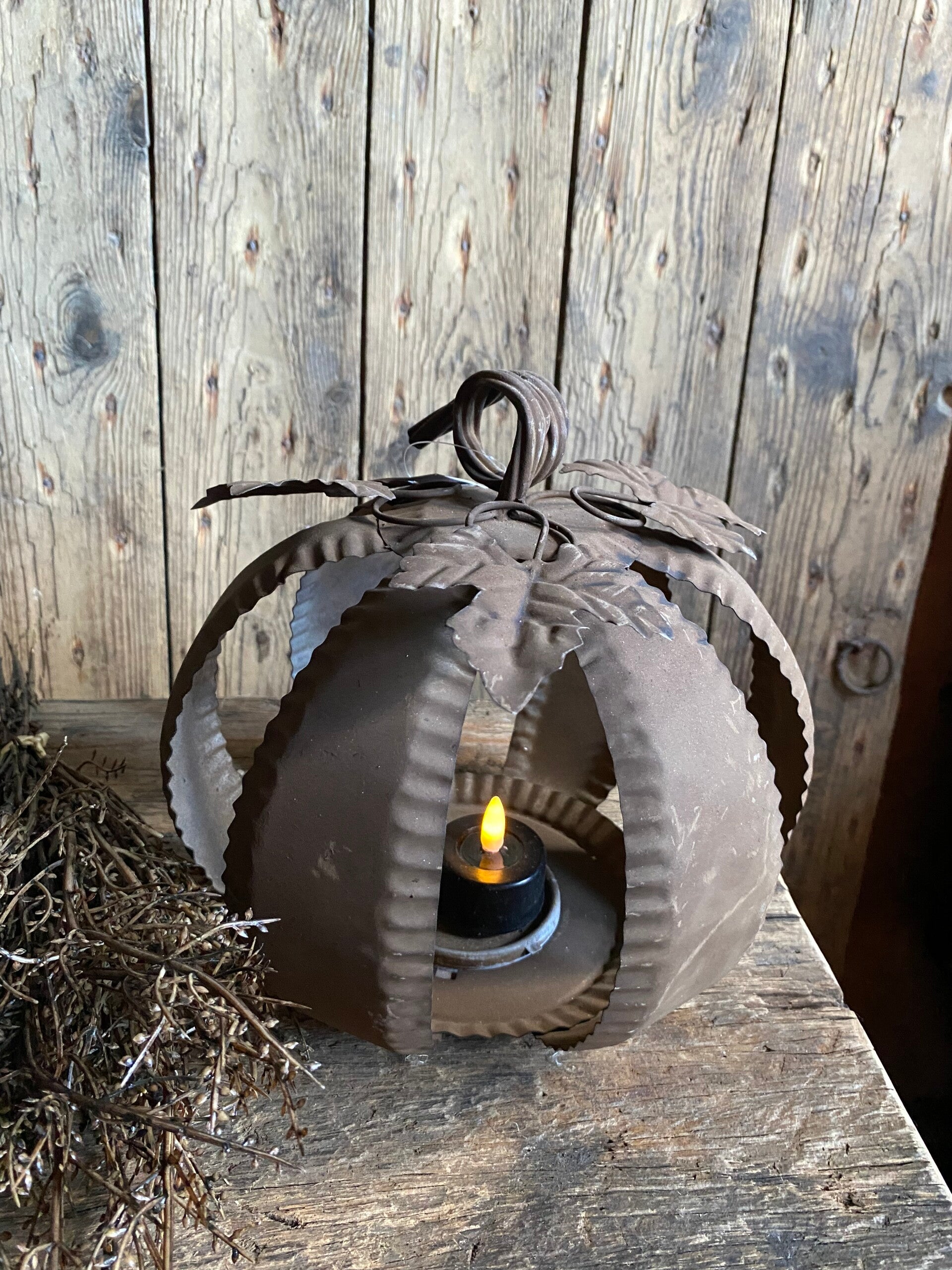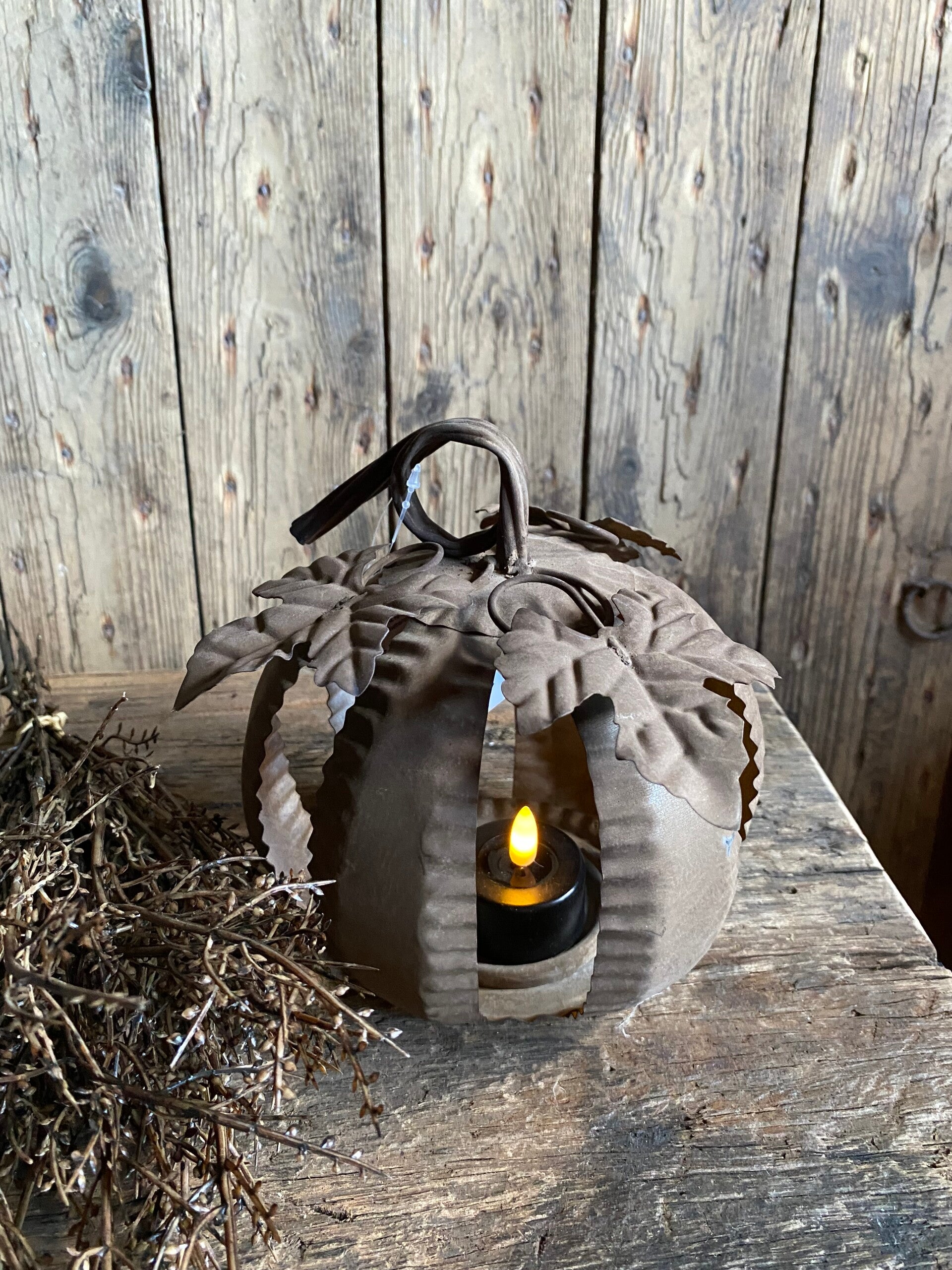 Prachtige metalen pompoenen, kan aan de onderkant open om er bijvoorbeeld een ledwaxine/Solar waxine in neer te zetten. Eén kleine led kaars zou ook nog kunnen.