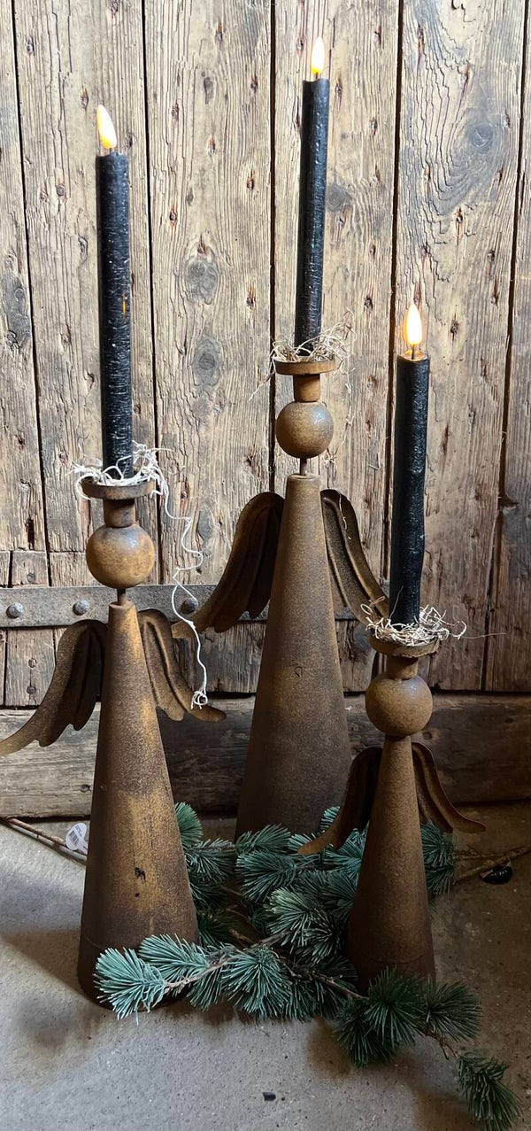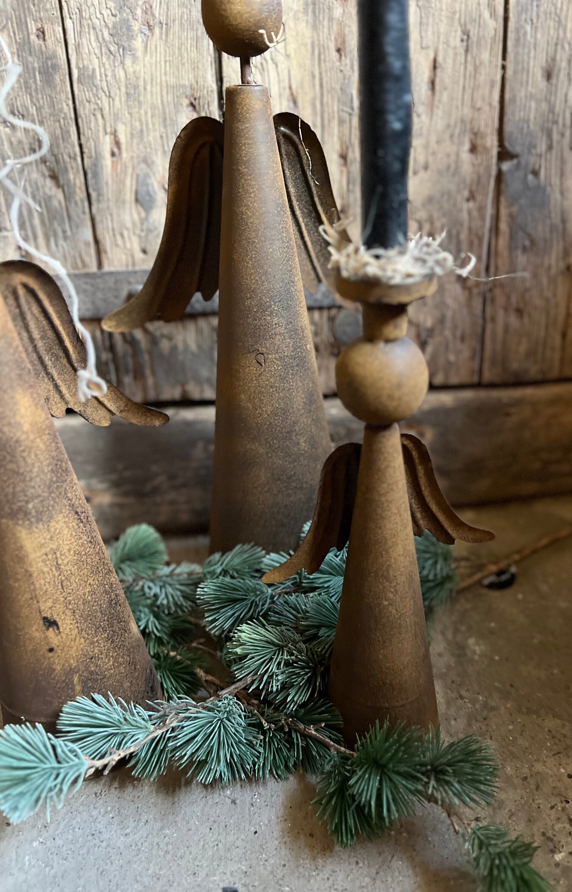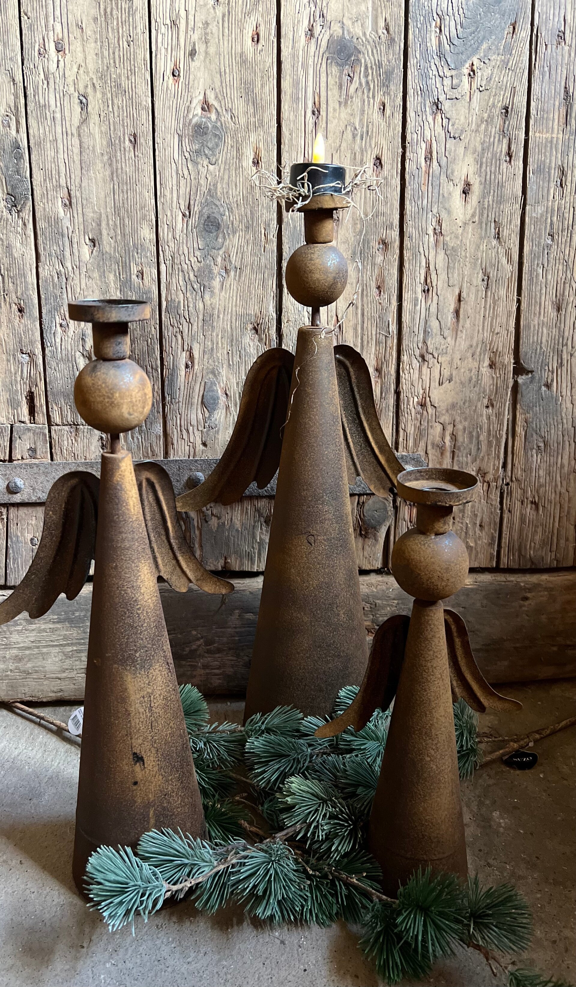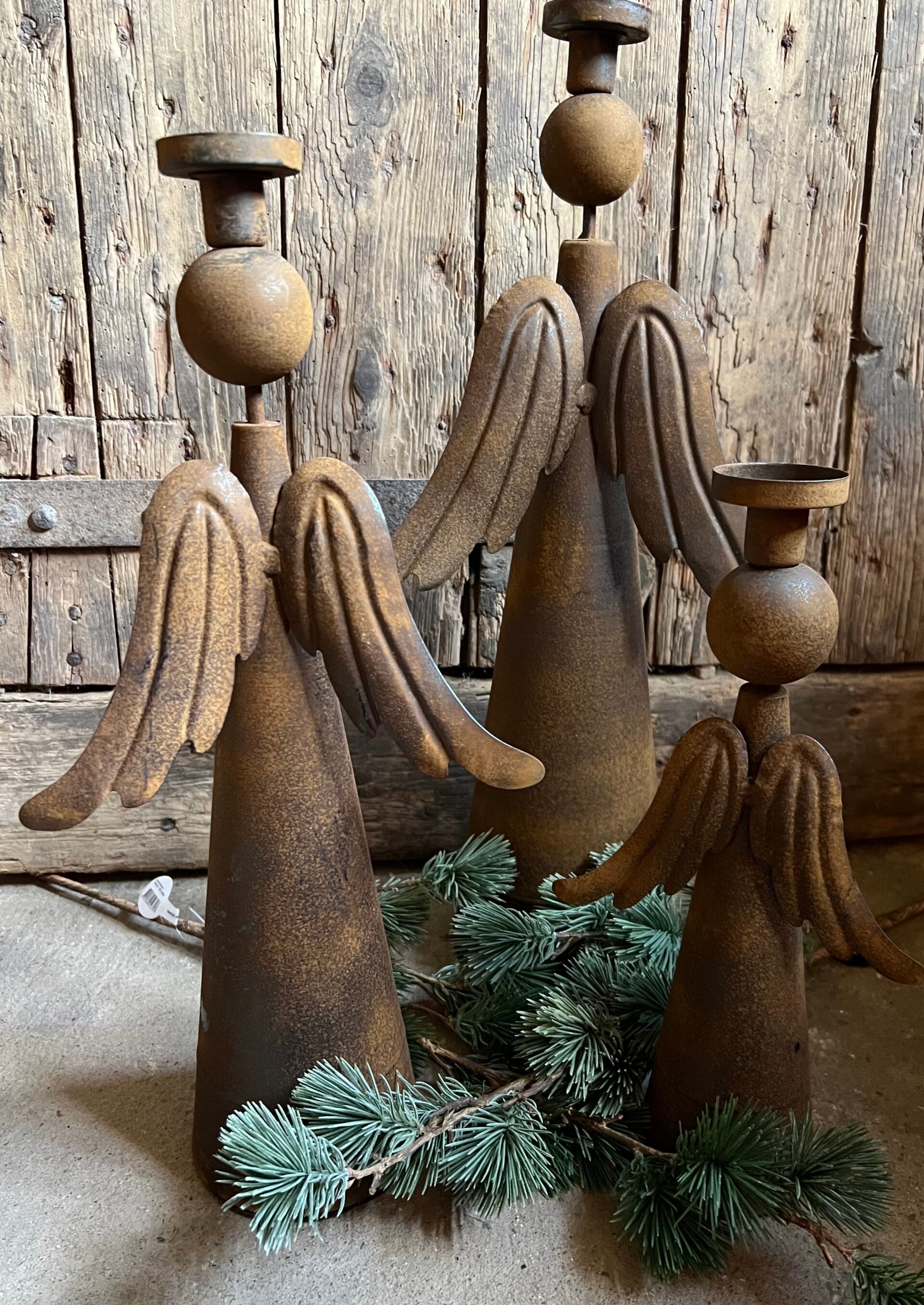 Roestige kandelaar engel Emely, kan een dinerkaar in of een waxinelichtje opstaan.
