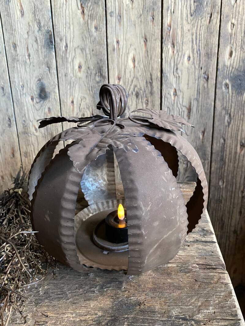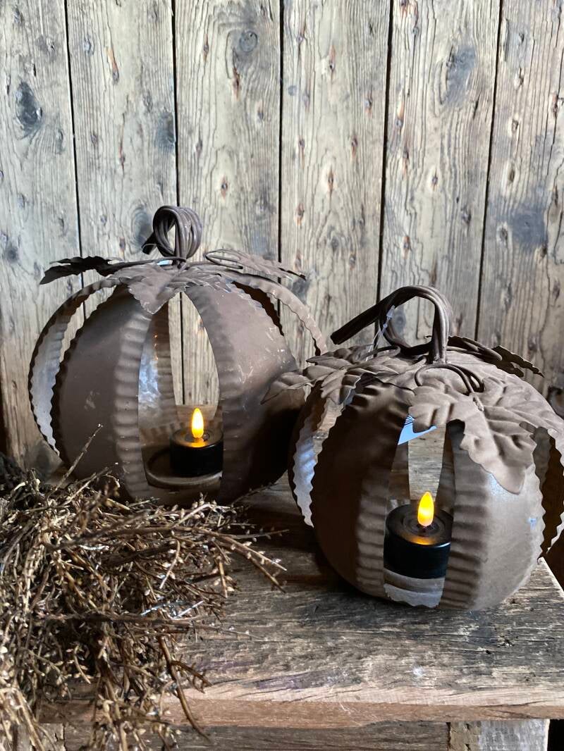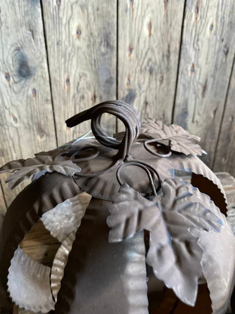 Prachtige metalen pompoenen, kan aan de onderkant open om er bijvoorbeeld een ledwaxine/Solar waxine in neer te zetten. Eén kleine led kaars zou ook nog kunnen.