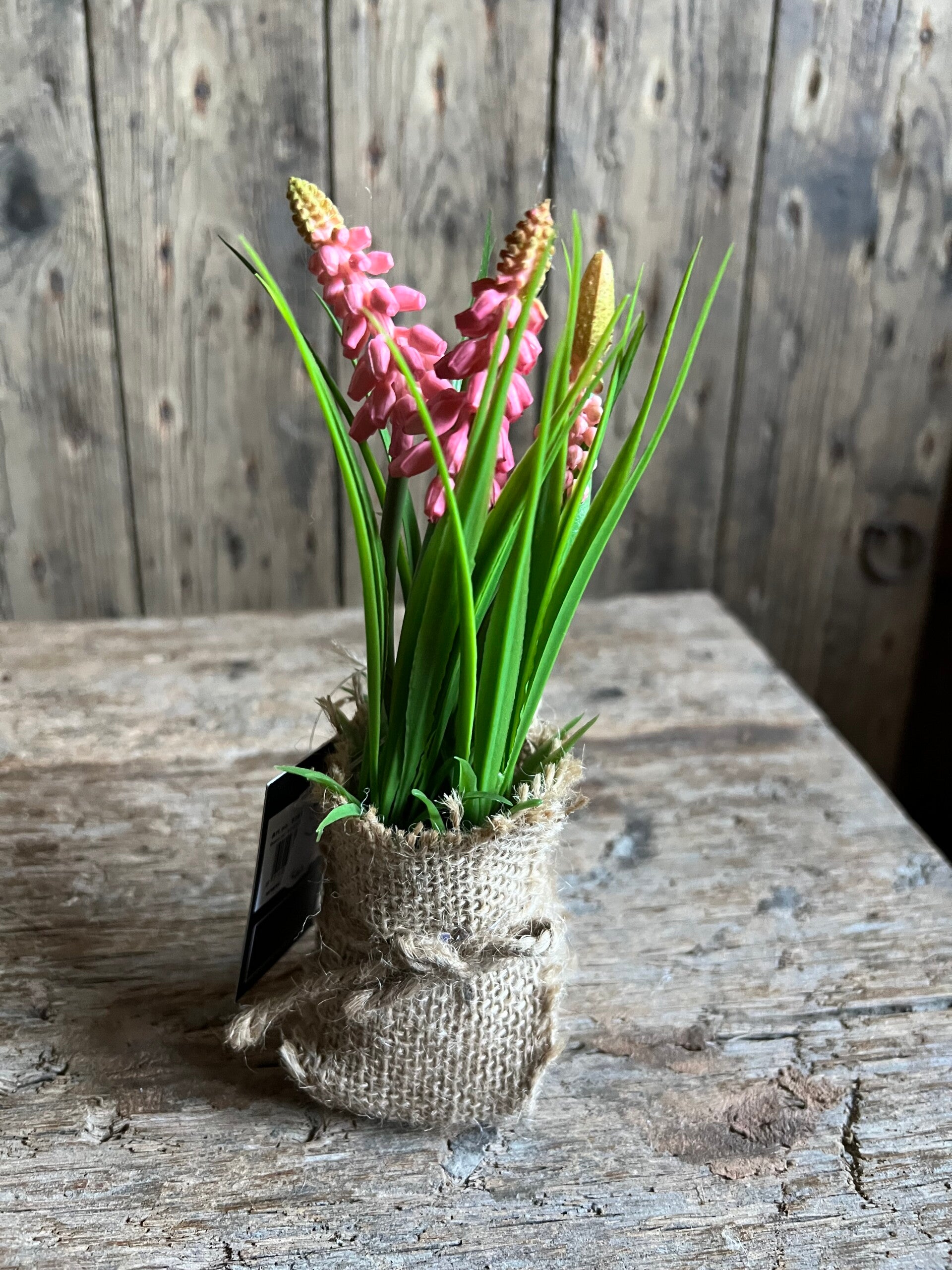 Drie roze druifjes in jutte potje