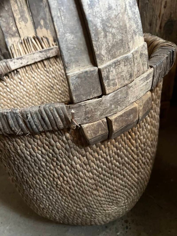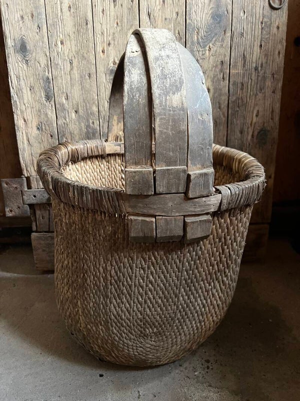 Deze doorleefde mand is zeer decoratief, of prachtig met een sobere tak erin, of als opslagmand voor kussens of plaids.
