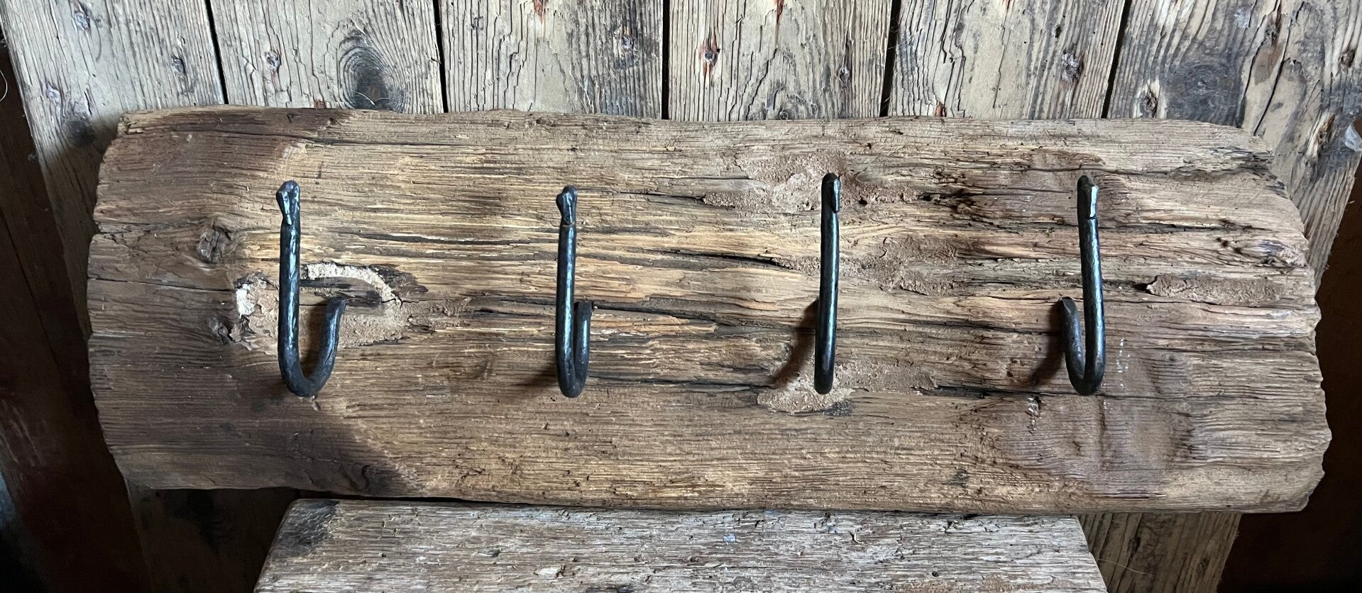 Stoer stuk oud hout met een geleefde uitstraling en vier stevige haken. Elk exemplaar is uniek, scheuren, nerven en oneffenheden geven dit item juist zijn karakter.