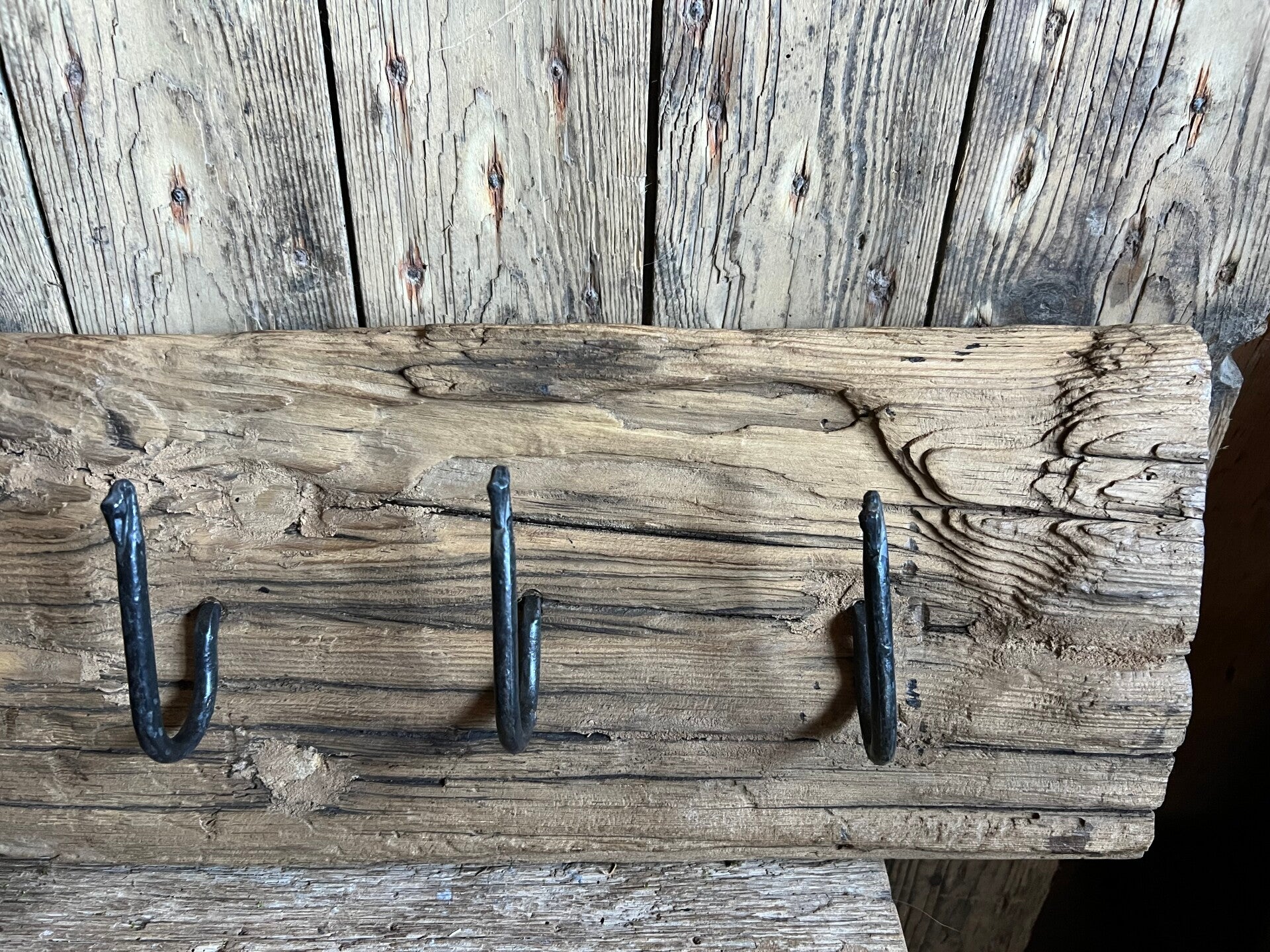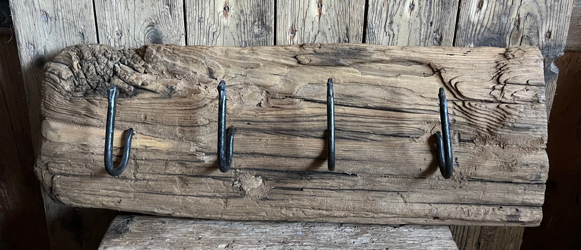 Stoer stuk oud hout met een geleefde uitstraling en vier stevige haken. Elk exemplaar is uniek, scheuren, nerven en oneffenheden geven dit item juist zijn karakter.