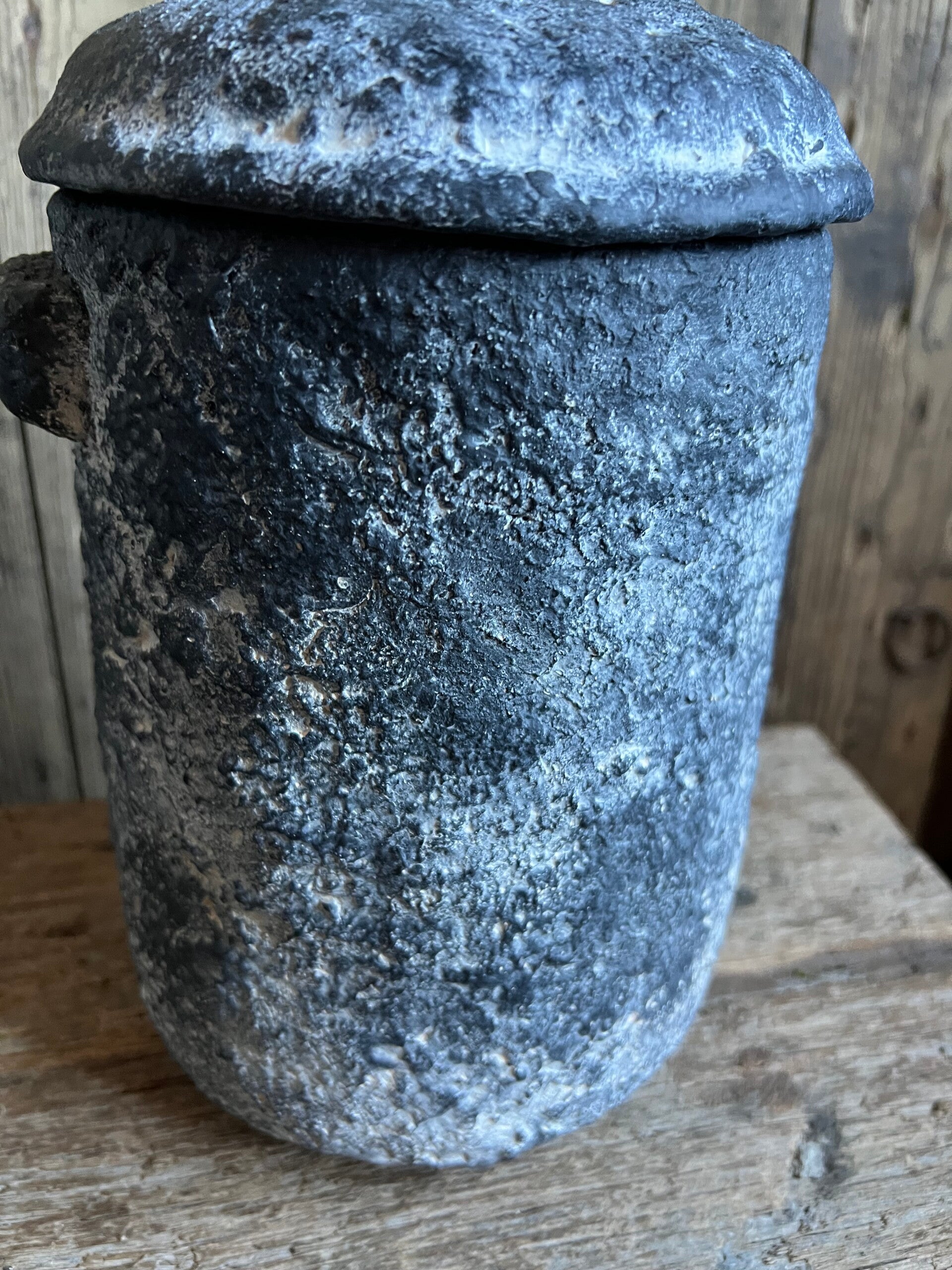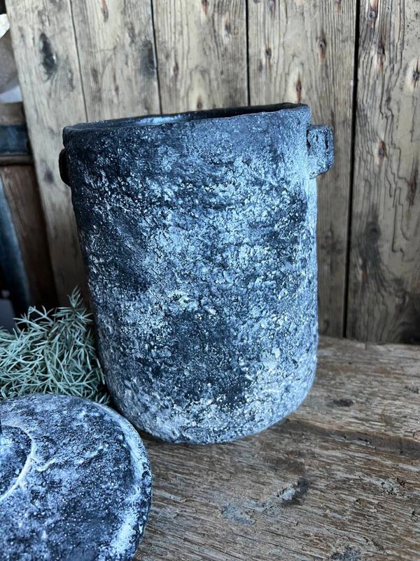 Stenen pot met deksel met een verweerde uitstraling