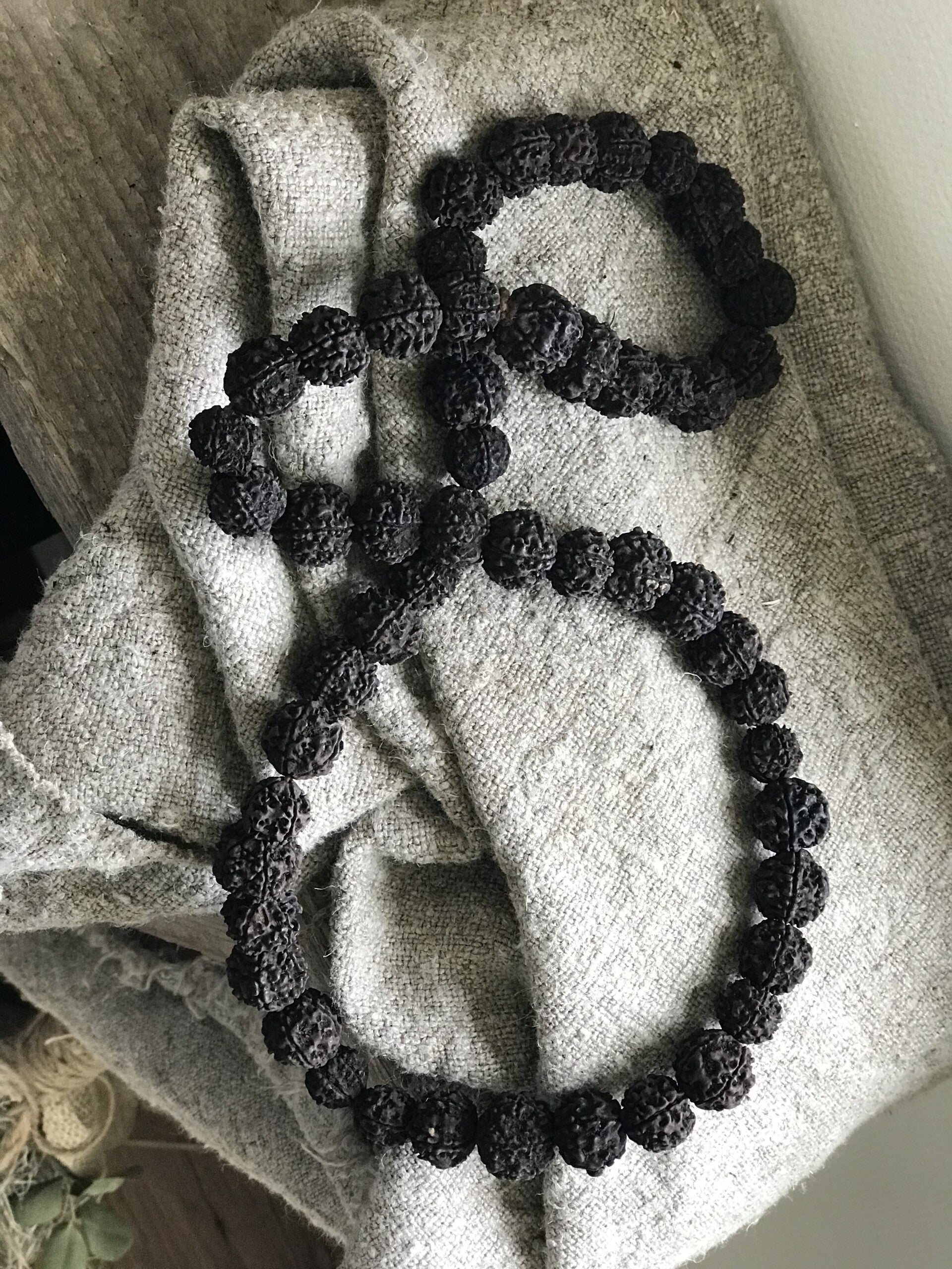 Mooie kralenkrans. De rudraksha's groeien in de vruchten van de Eleocarpus boom en zijn te vinden in de Himalaya's in India, Nepal, Maleisie en Zuidoost-Azie. Rudraksha kralen worden in het boeddhisme en hindoeisme als zeer heilig beschouwd.