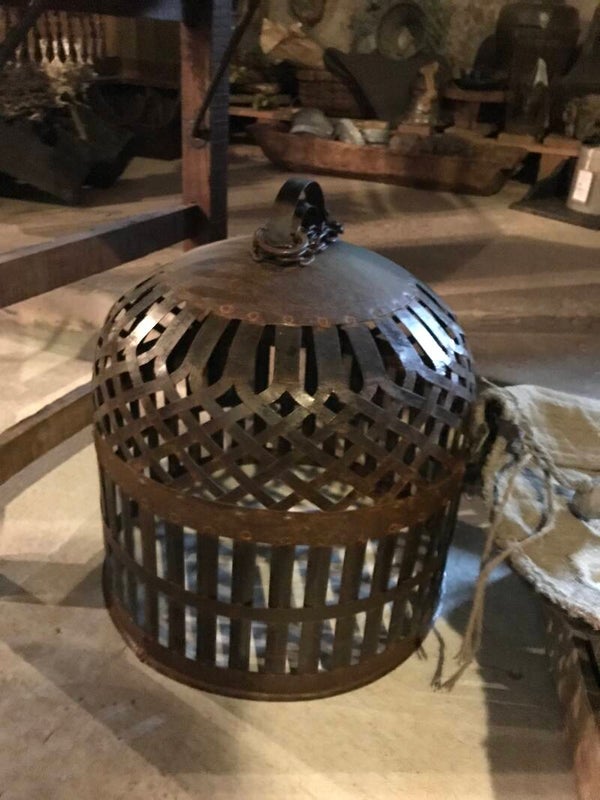 Stoere ijzeren kooilamp in roestkleur met ophang kettingkje.