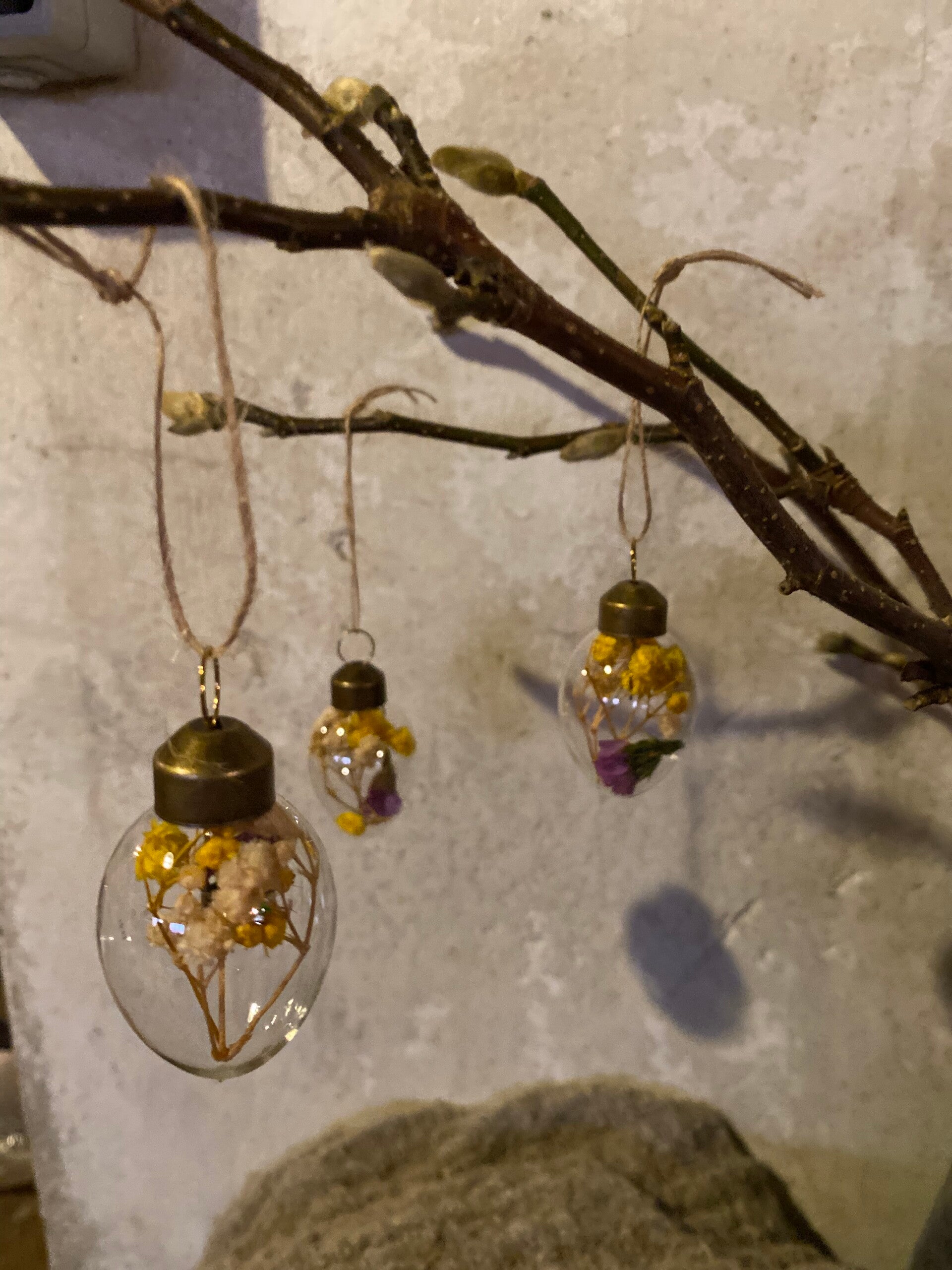 Doosje met 9 glazen eitjes gevuld met droogbloemetjes.