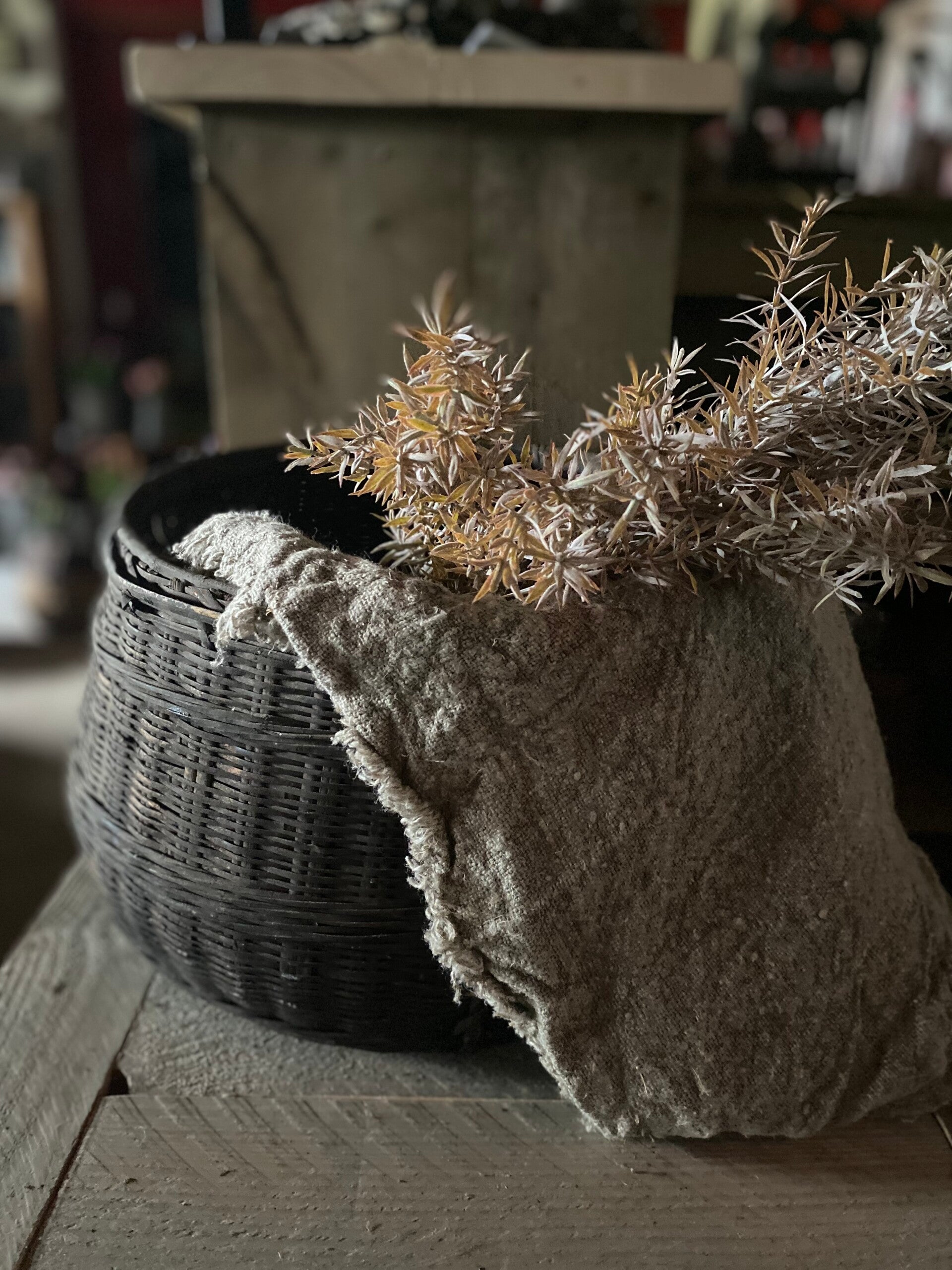 Oude donkere grijsbruine (leem) mand