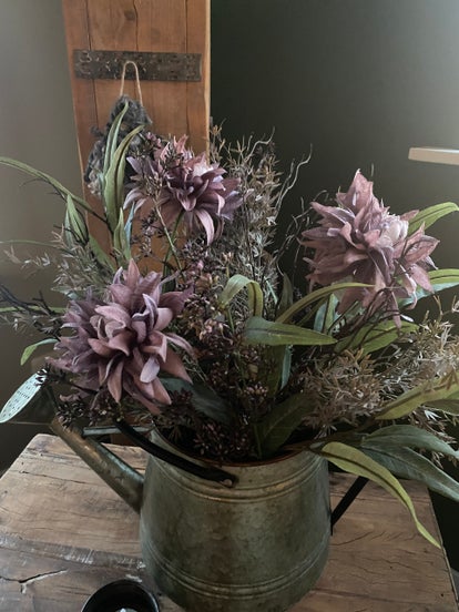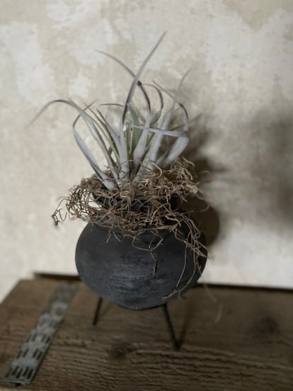 In het de zinken bak zitten twee plantjes en in rotan mandje zit 1 plantje
